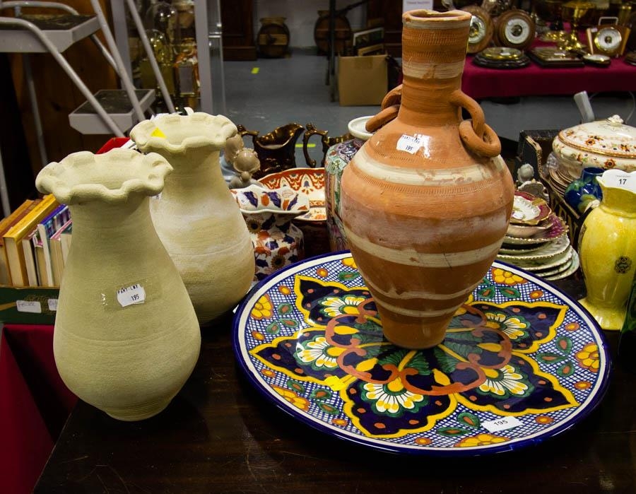 TERRACOTTA URN, 2 POTTERY VASES + COLOURFUL PLAQUE