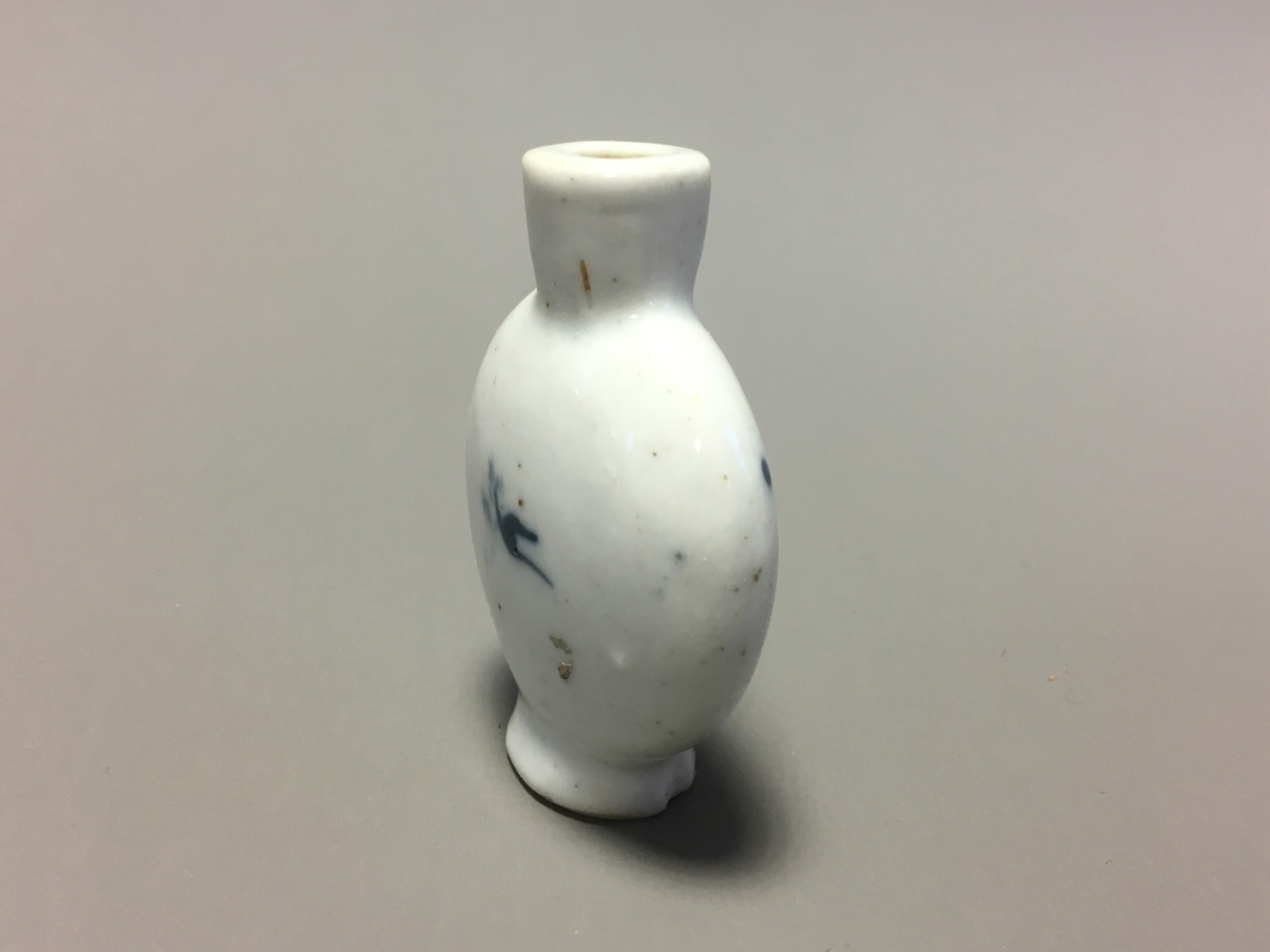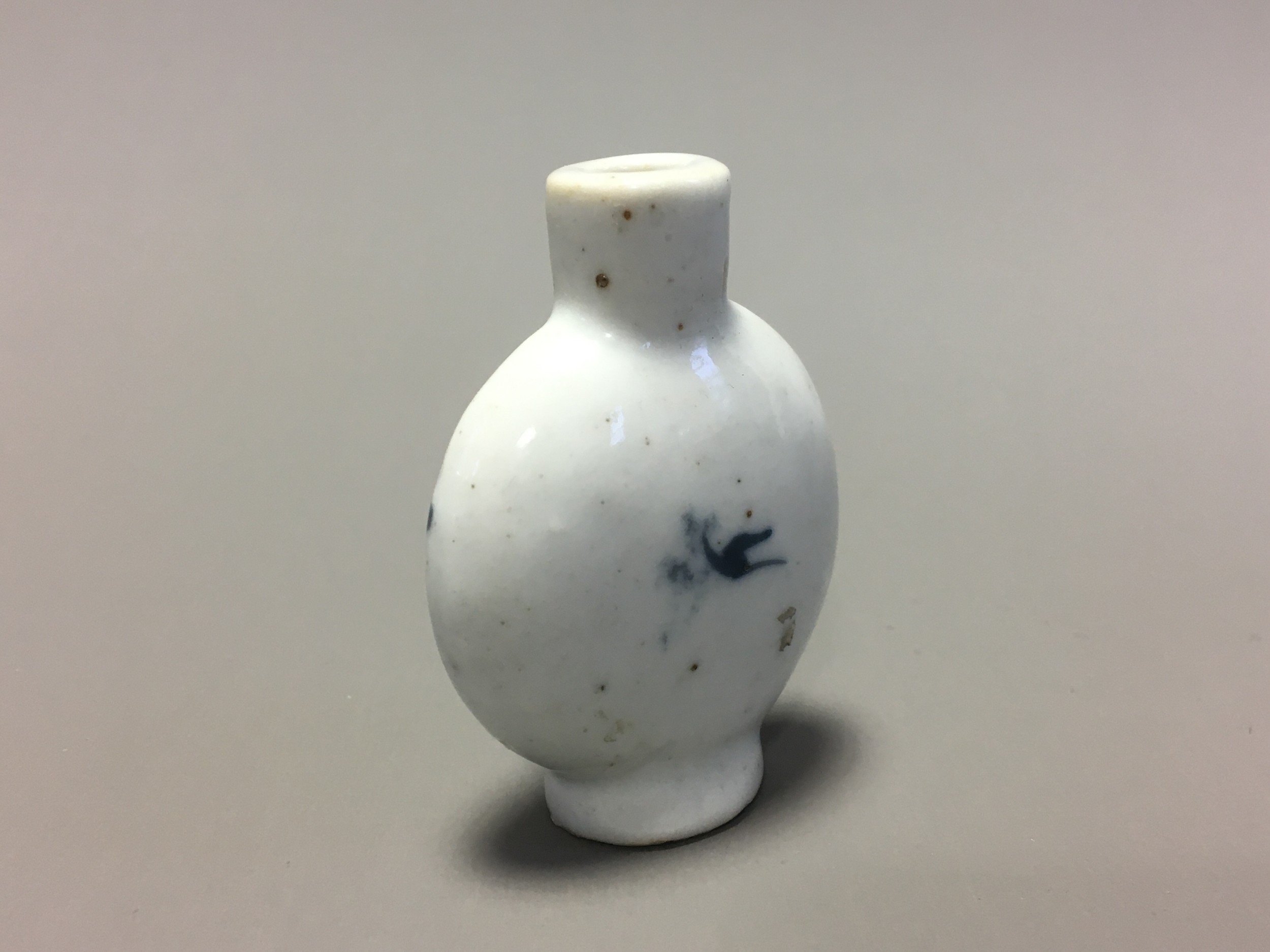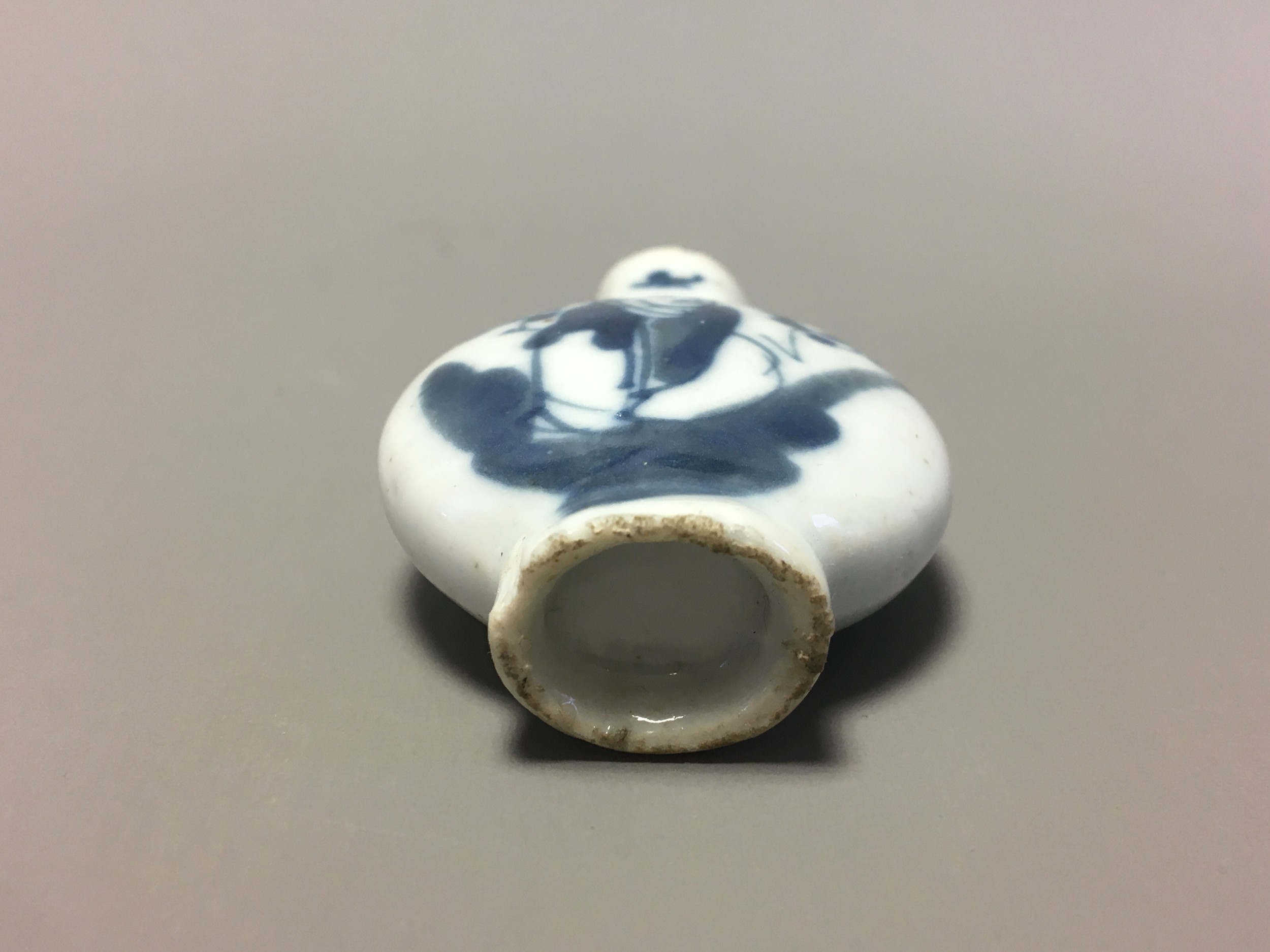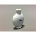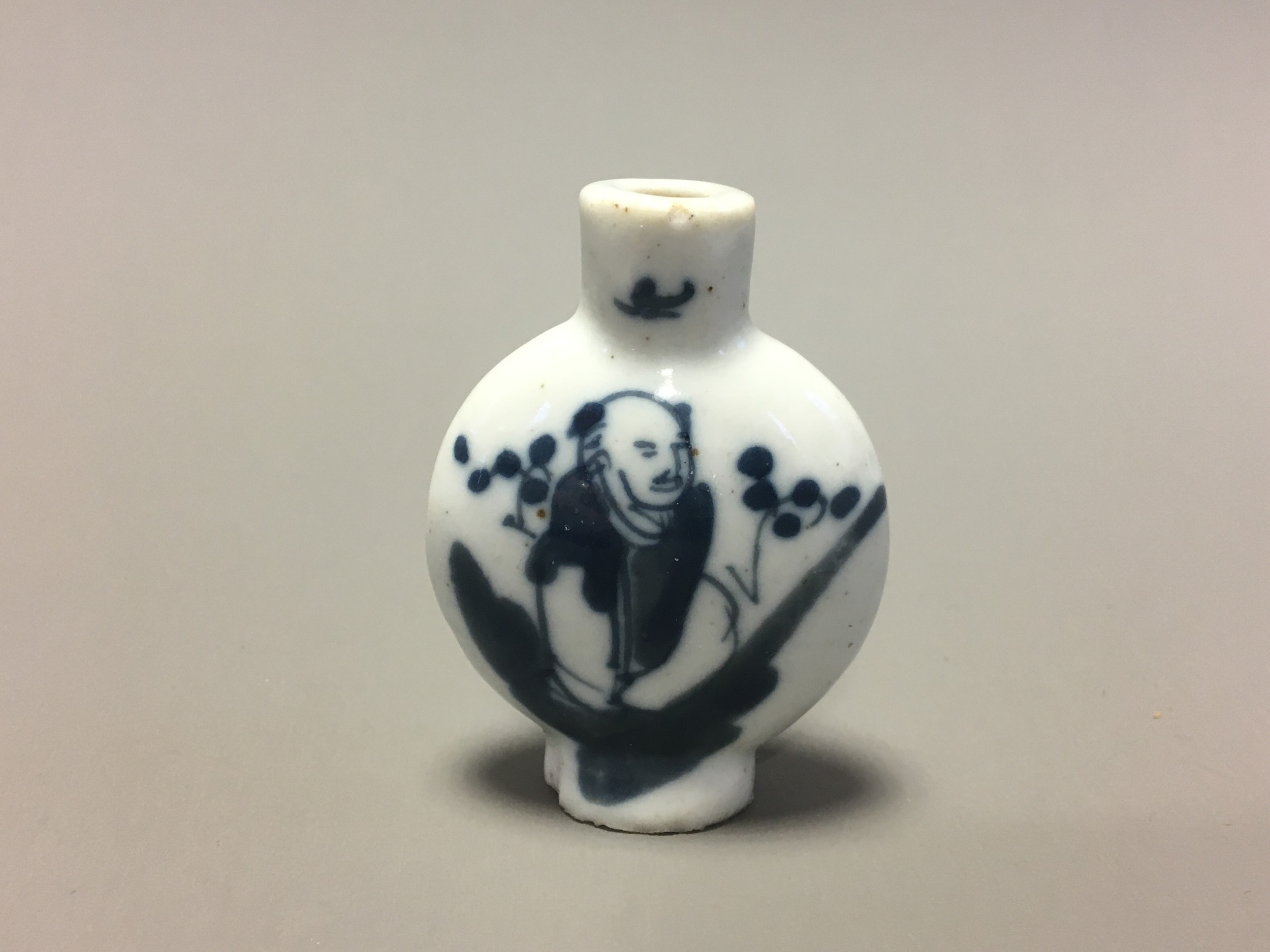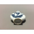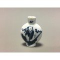 Chinese 19th Century Blue and White Decorated Snuff Bottle, Hand Decorated with Lone Seated Immortal/Man and Tree Blossom Detail.