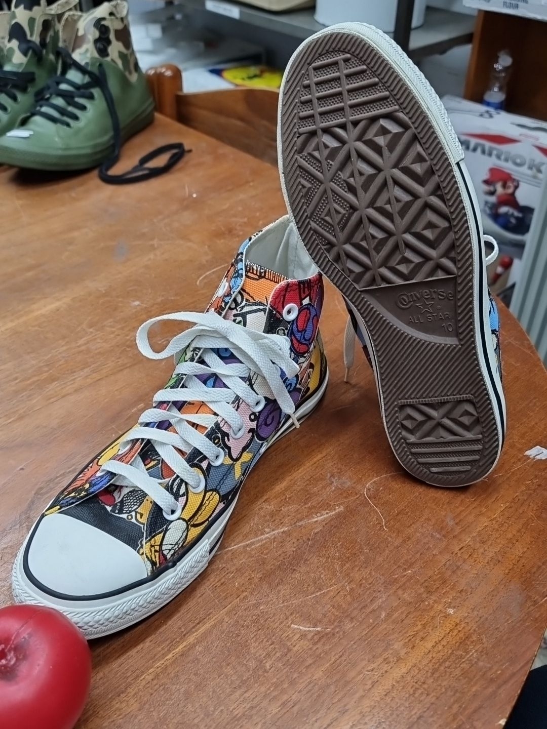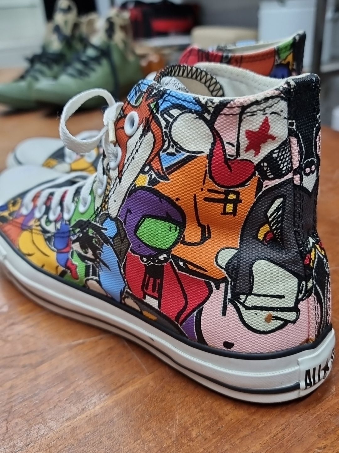 A pair of brand new Converse All Star high-top sneakers in a graffiti print. UK size 10. Very cool.