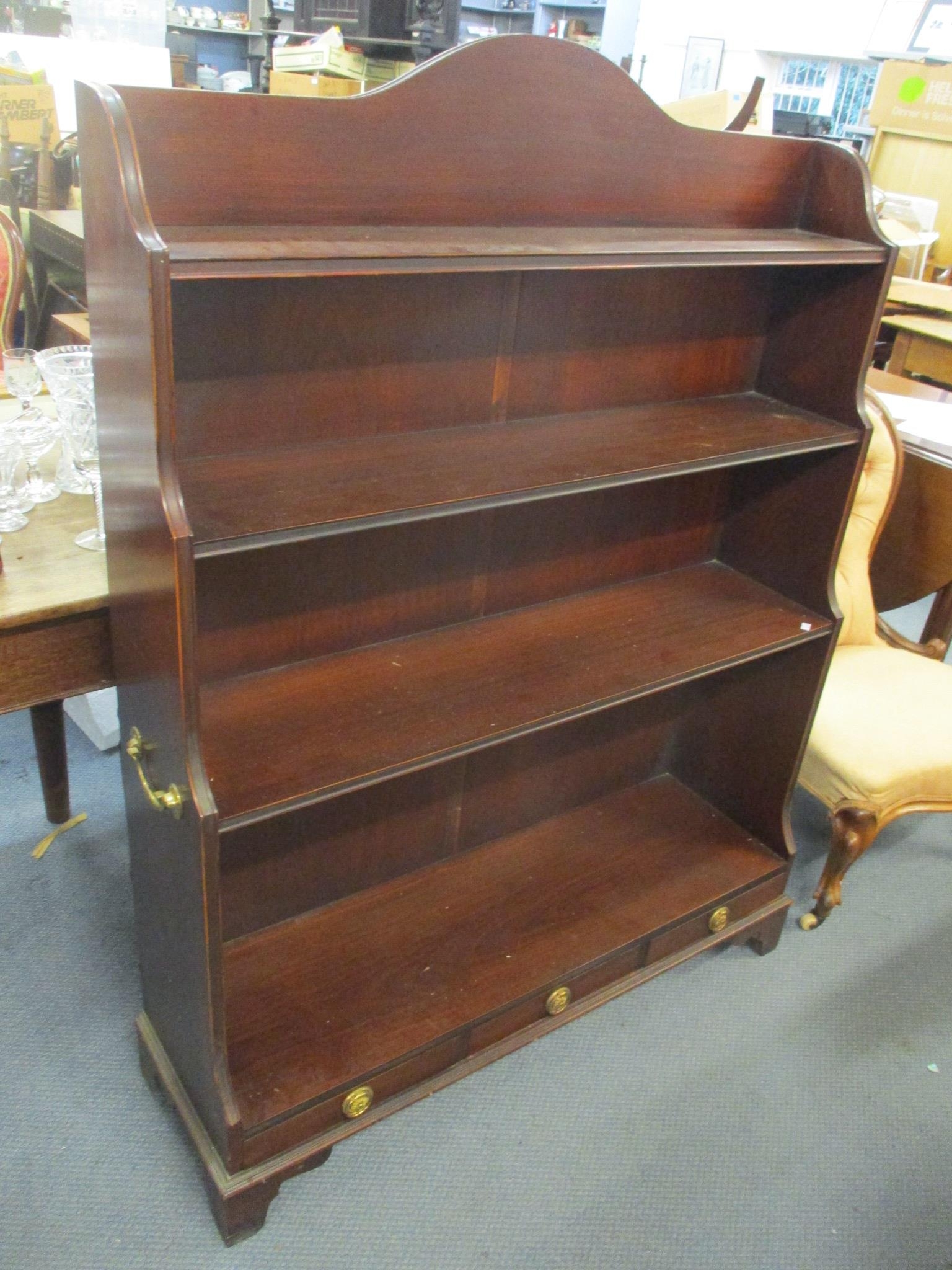 A reproduction mahogany four tier open bookcase with three drawers below and twin carrying handles, 138.5cm h x 107cm w