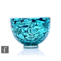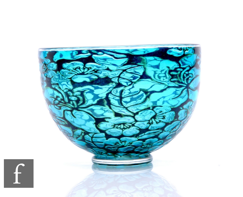 Timothy Harris - Isle of Wight - A contemporary glass bowl of footed form, pale turquoise ground overlaid with 'web' of black flowers and leaves, engraved signature and dated 2012, diameter 15cm.
