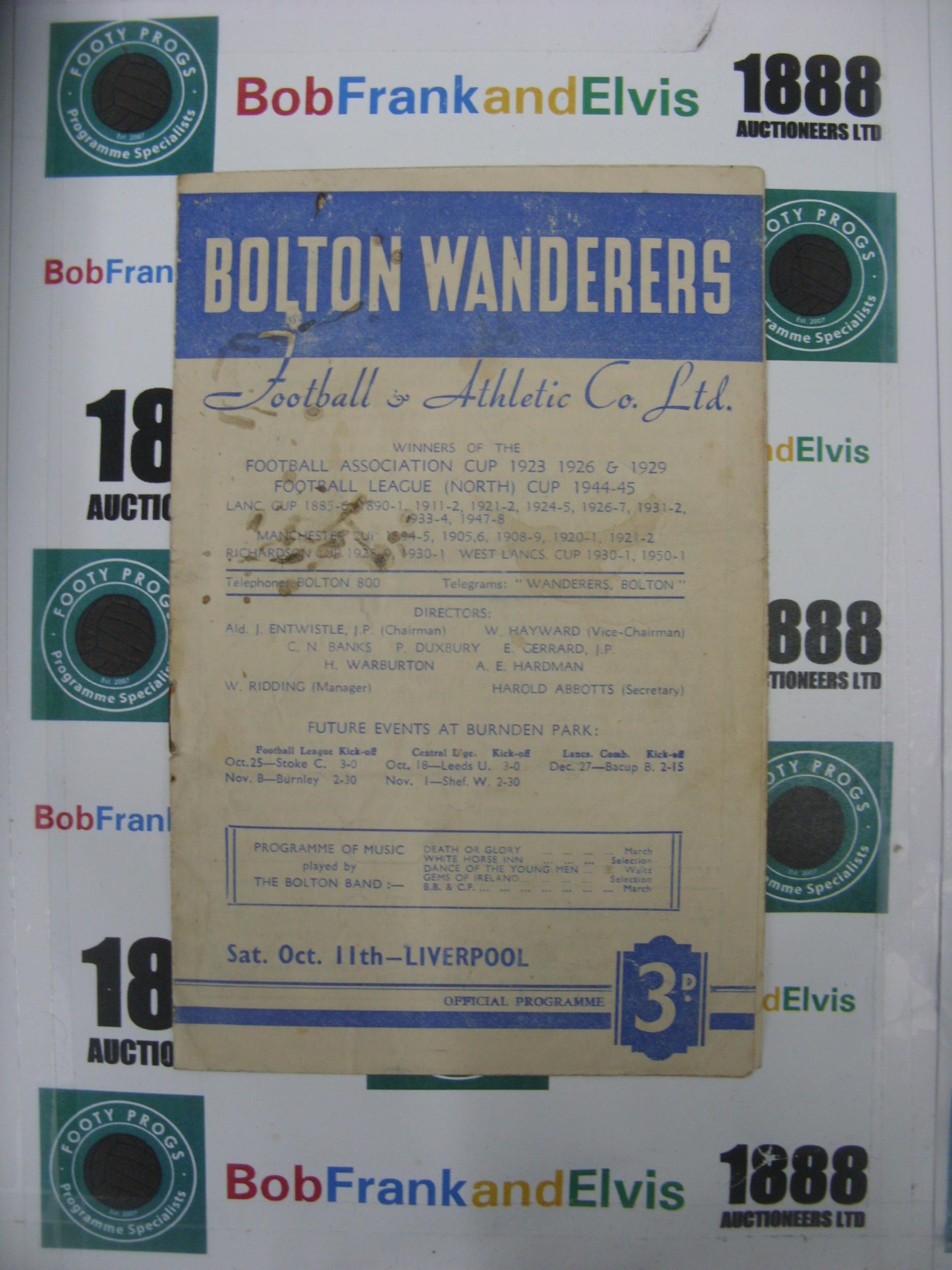 BOLTON WANDERERS, 1952/1953, a football programme from the game versus Liverpool, played on 11/10/1952 (dirty/marked on front & back, folded, rusty staple).