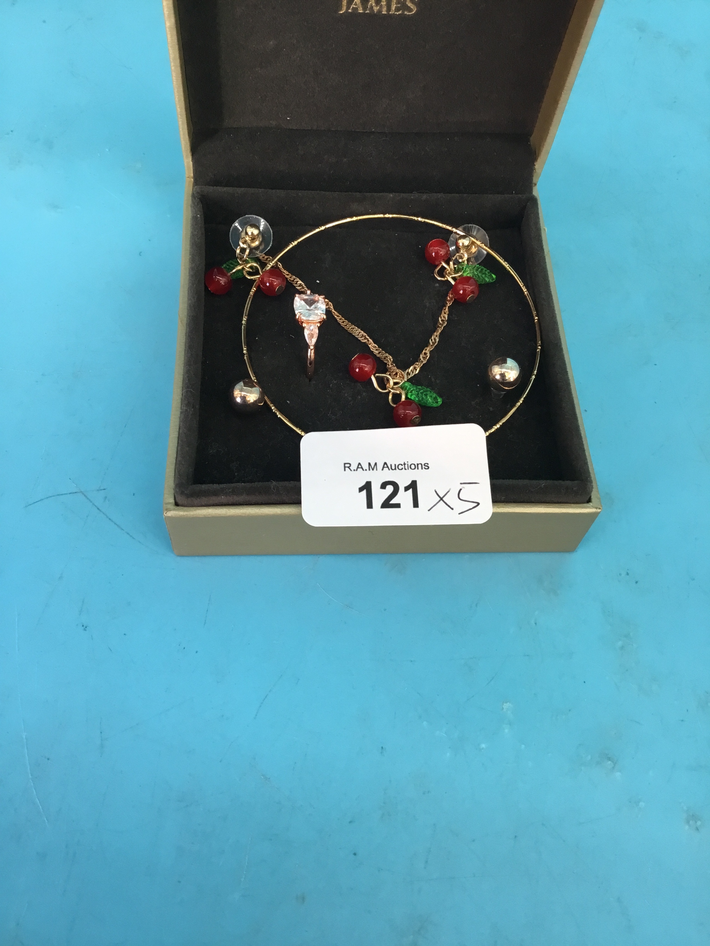 Fashion and Vintage Jewellery to Include Cherry necklace and Earrings, Gold Coloured Earrings, Ring and a Bangle