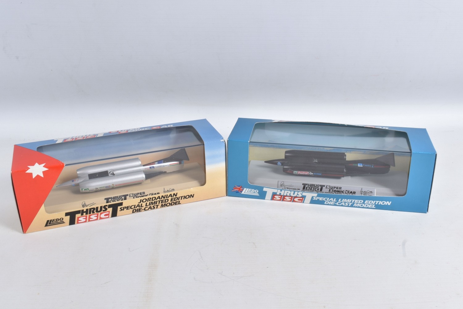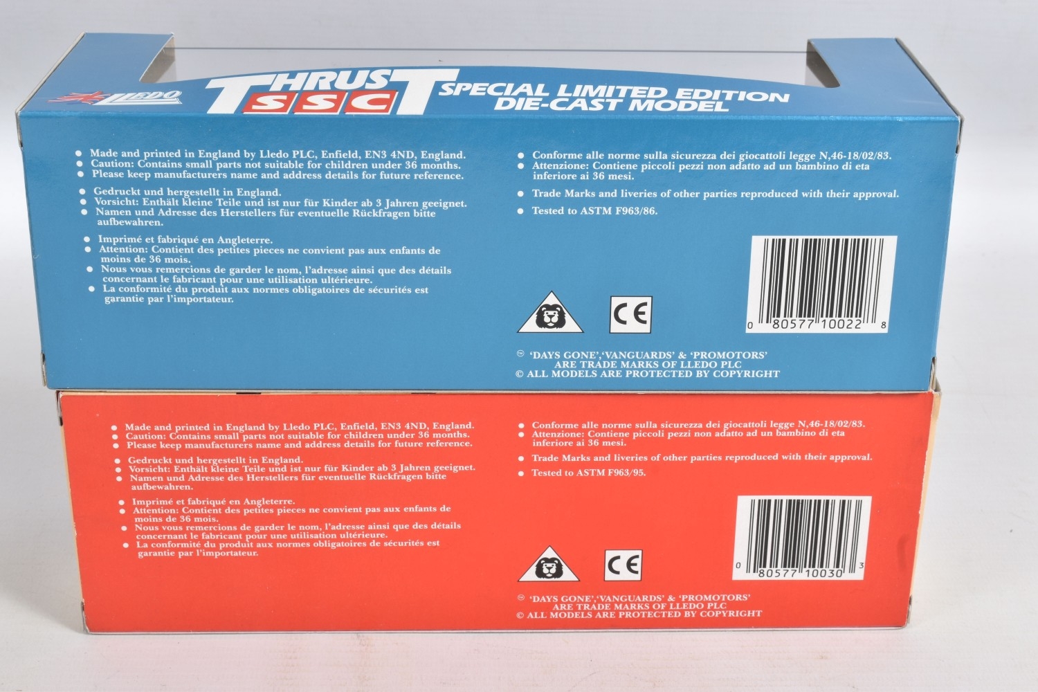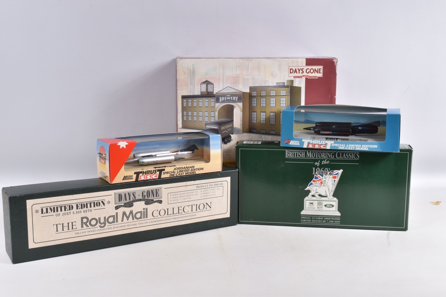 A COLLECTION OF MIXED BOXED LLEDO MODEL VEHICLES, models include a limited edition diecast Thrust SSC Super Sonic Car in black with 'Castrol' decals, a Thrust SSC Super Sonic Car Jordanian special edition model in metallic silver colour with decals, a British Motoring Classics of the 1960's 24 Carat gold plated limited edition of 7500 sets, numbered BPL 1003, included in box is a limited edition card numbered 3687 of 7500, a limited edition Days Gone The Royal Mail Collection numbered RM1006 included in box is a card numbered 2627 of 5000 and a Days Gone Scammell 6 wheel box van Whitbread and a 3 piece tin plate brewery numbered BB1002, all models appear in good condition however contents has not been checked for their completion, housed inside their inner casing and outer cardboard or plastic boxes, boxes are in okay condition some with tears and losses to sharp edges and corners