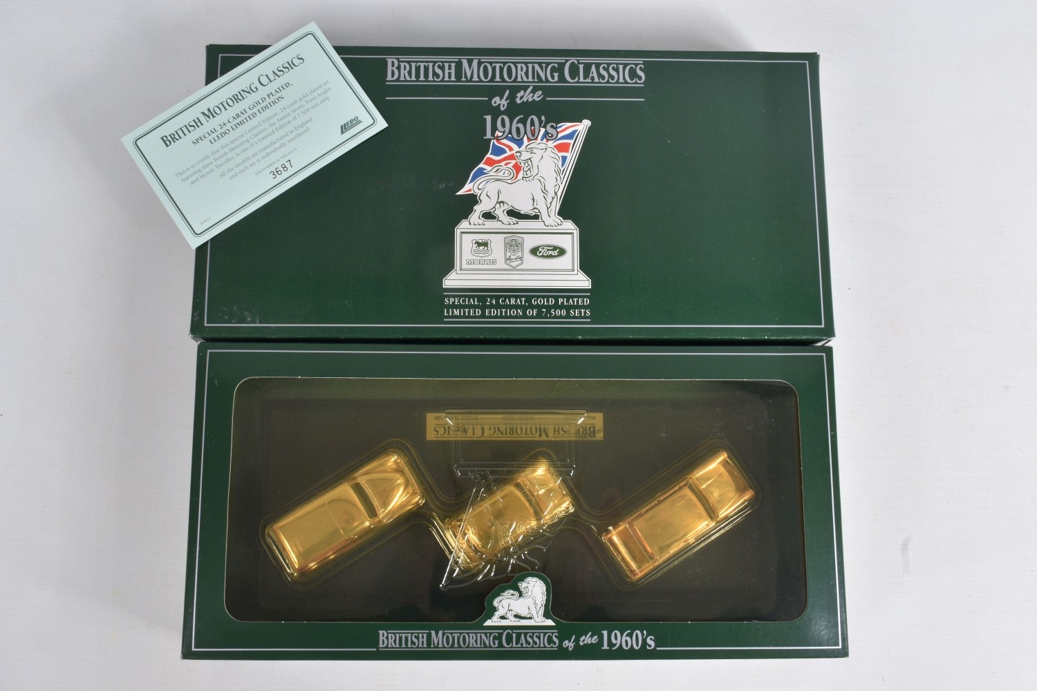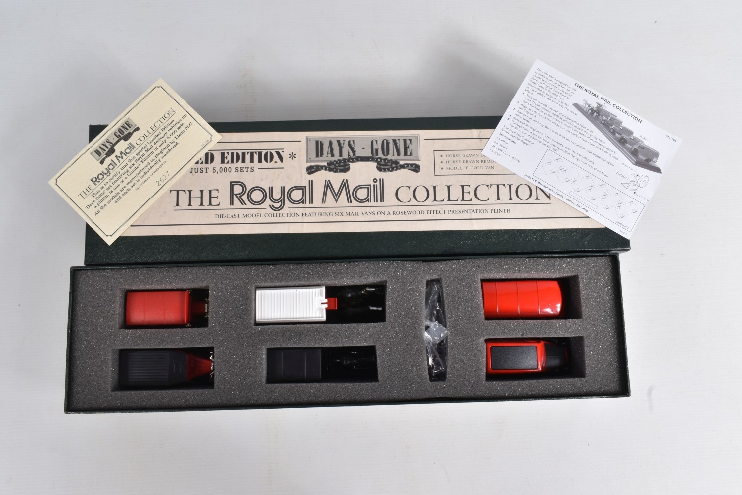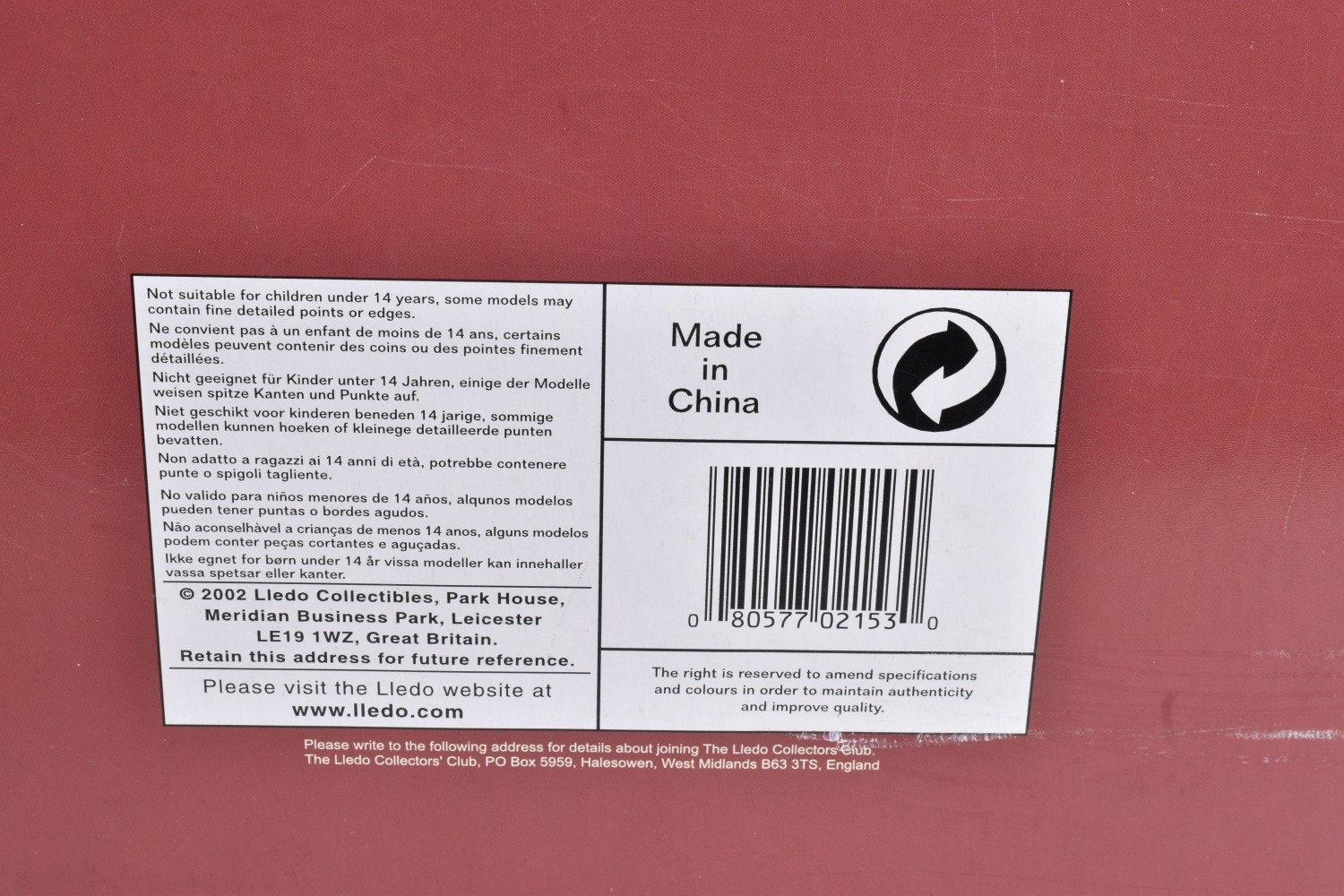 A COLLECTION OF MIXED BOXED LLEDO MODEL VEHICLES, models include a limited edition diecast Thrust SSC Super Sonic Car in black with 'Castrol' decals, a Thrust SSC Super Sonic Car Jordanian special edition model in metallic silver colour with decals, a British Motoring Classics of the 1960's 24 Carat gold plated limited edition of 7500 sets, numbered BPL 1003, included in box is a limited edition card numbered 3687 of 7500, a limited edition Days Gone The Royal Mail Collection numbered RM1006 included in box is a card numbered 2627 of 5000 and a Days Gone Scammell 6 wheel box van Whitbread and a 3 piece tin plate brewery numbered BB1002, all models appear in good condition however contents has not been checked for their completion, housed inside their inner casing and outer cardboard or plastic boxes, boxes are in okay condition some with tears and losses to sharp edges and corners