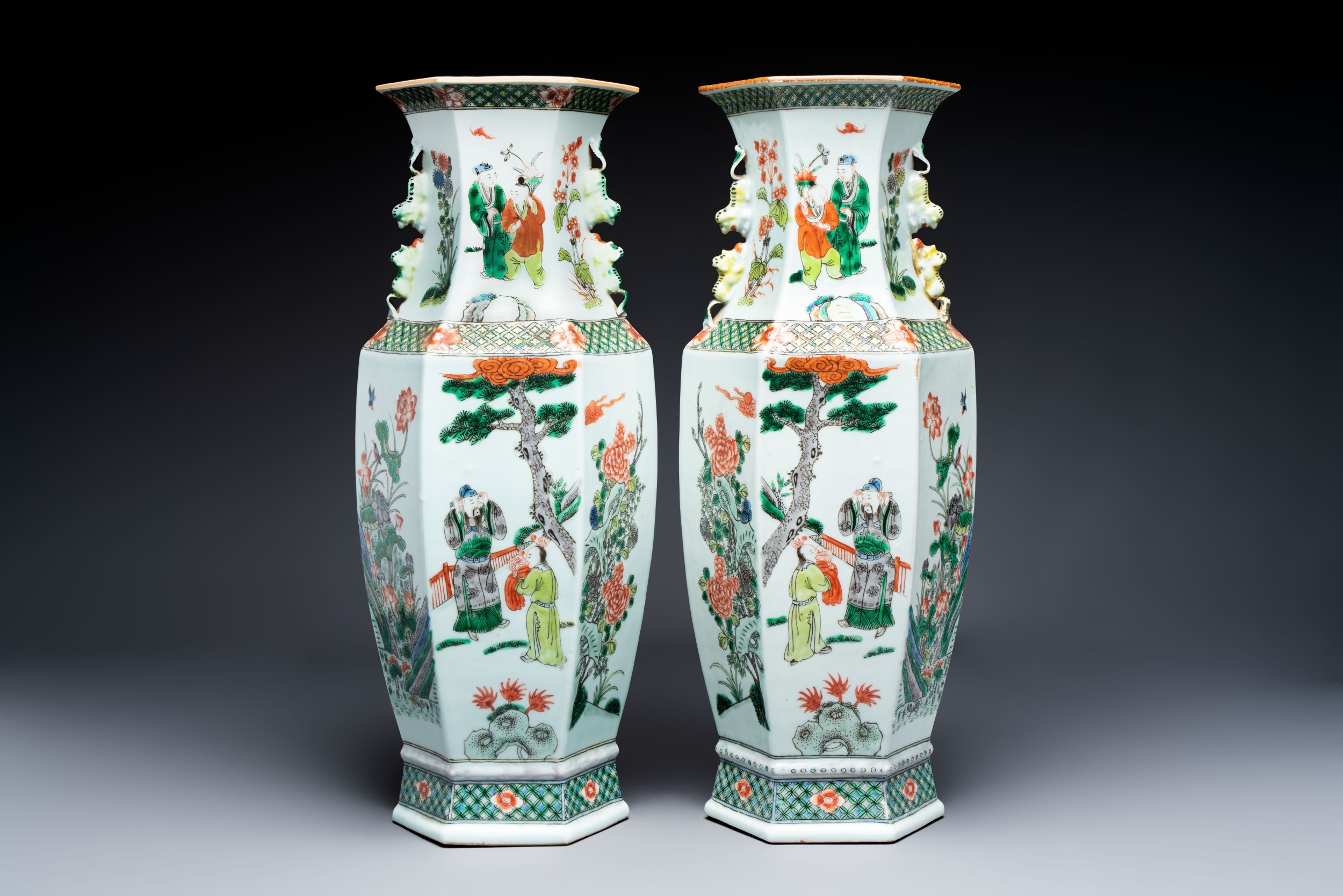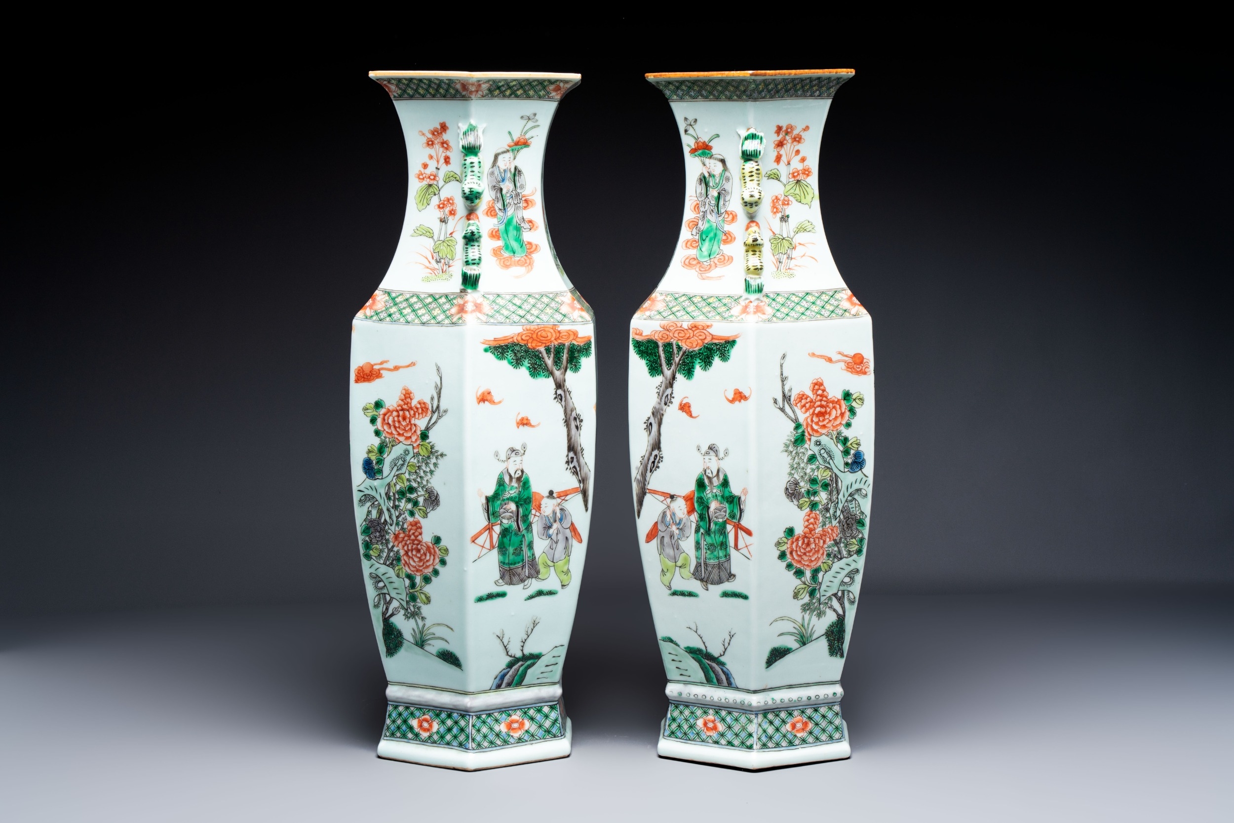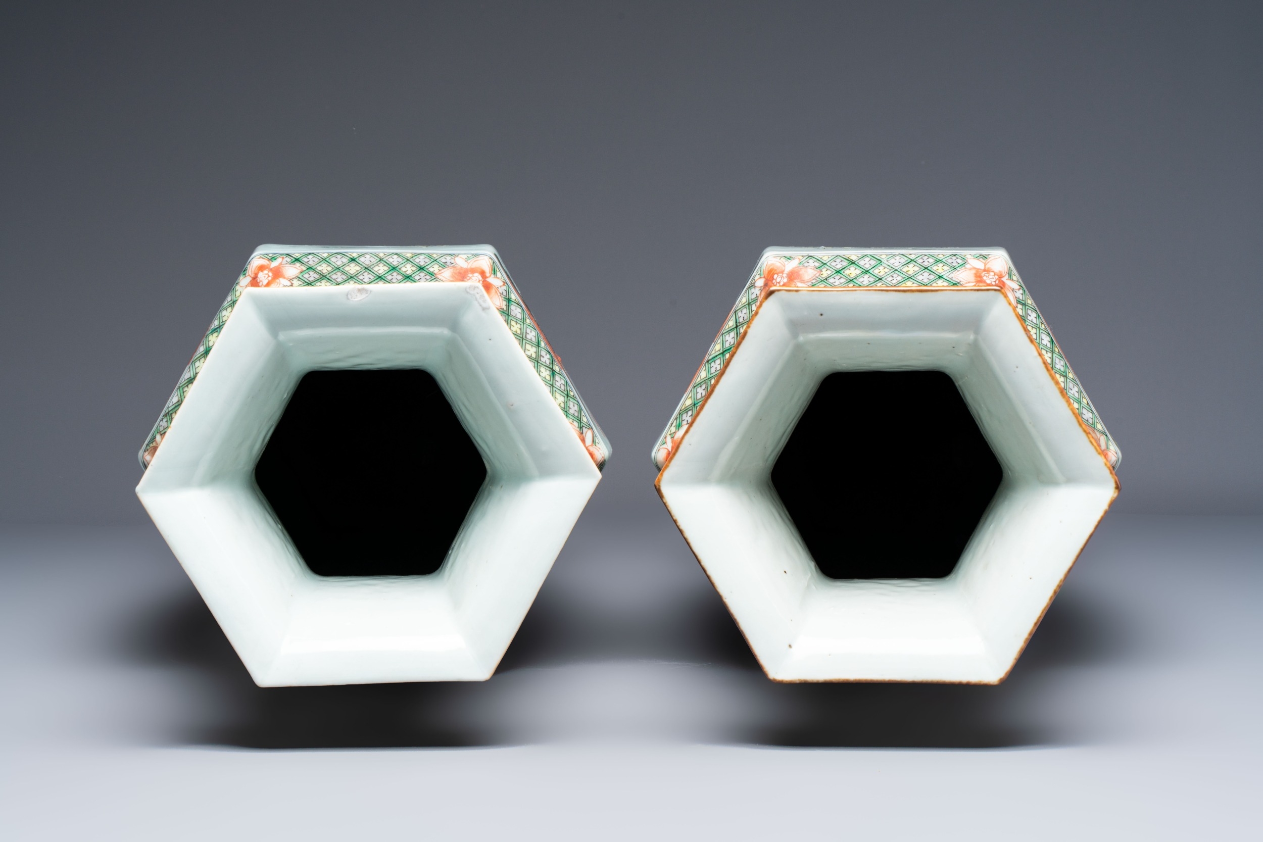 A pair of large Chinese famille verte hexagonal 'Si Ai Tu' vases, 19th C.