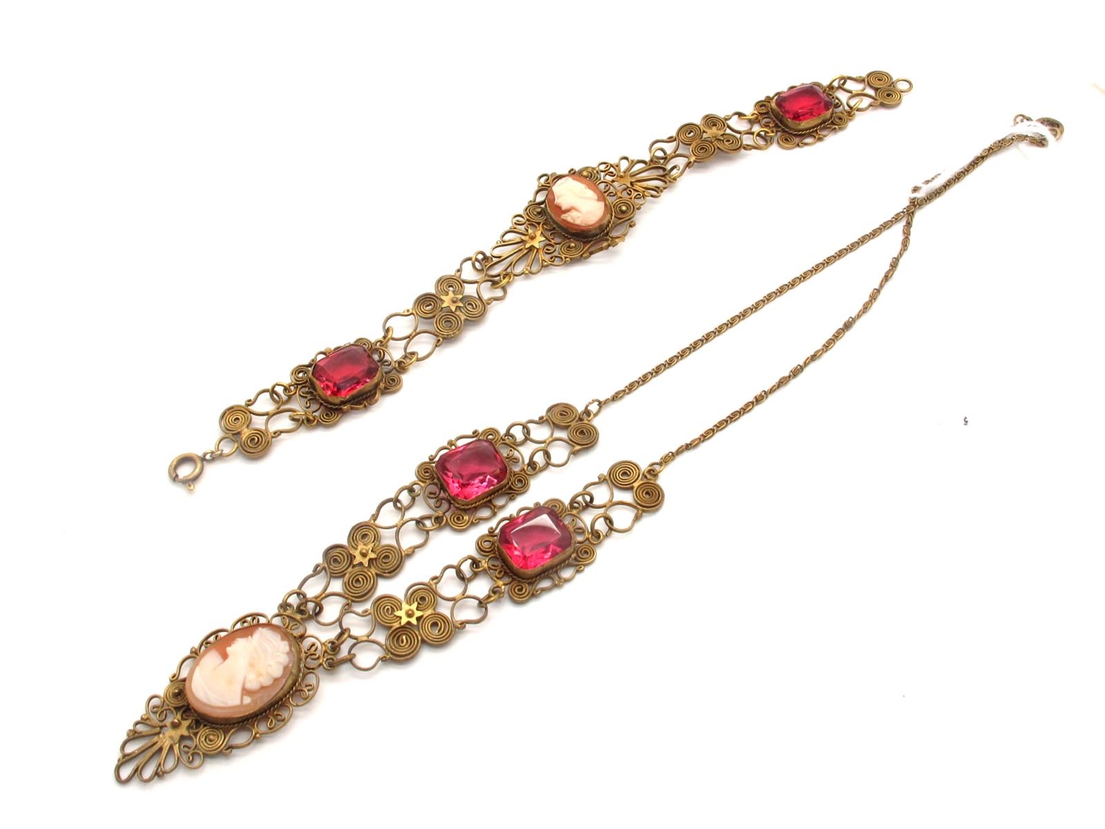 A Vintage Italian Gilt Filigree Cameo Necklace, oval collet set to the centre with an oval shell carved cameo, depicting female profile, within openwork filigree setting, with cushion shape inset highlights, on chain; Together with Matching Bracelet. (2)