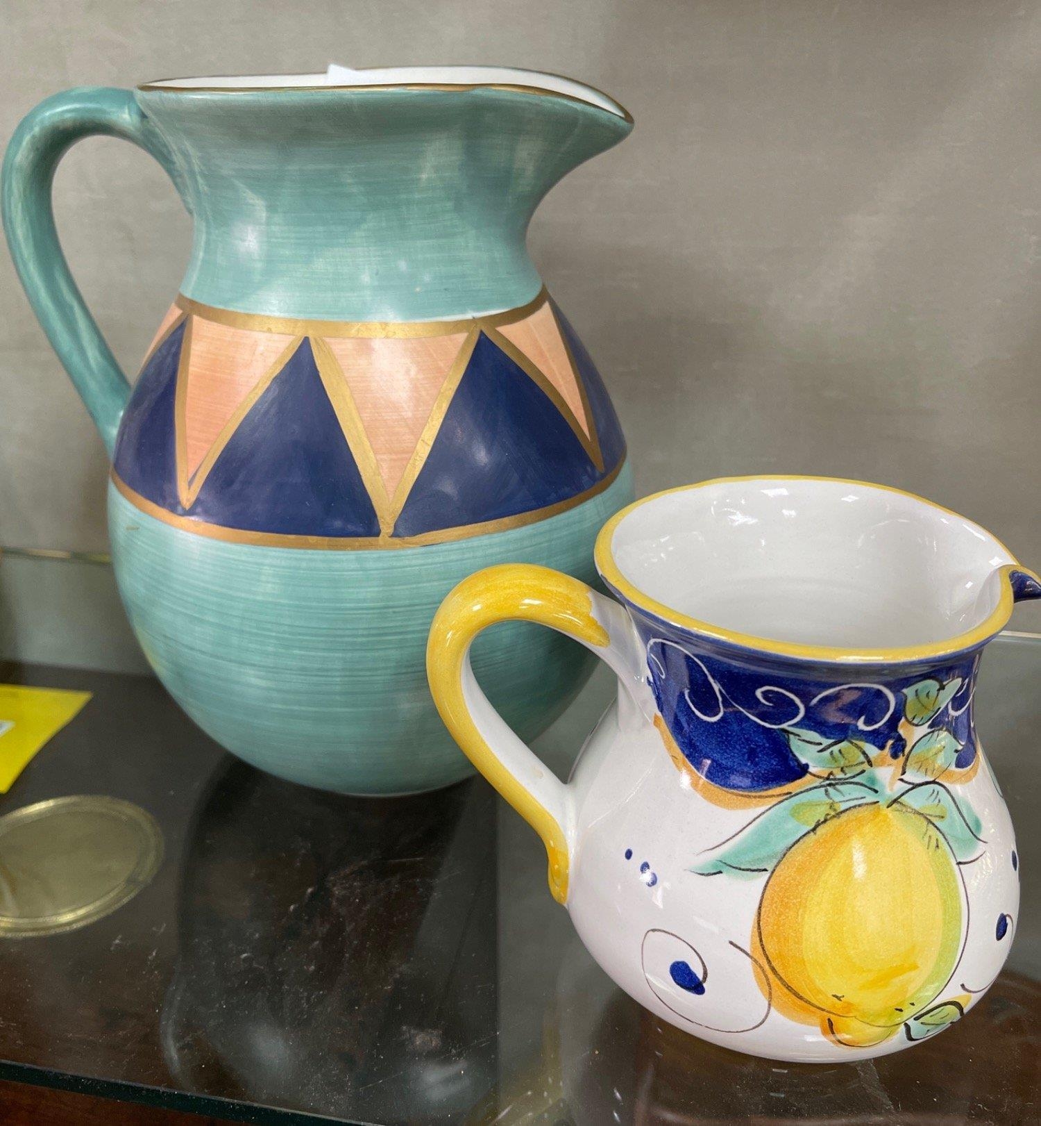 Two beautiful hand-painted and elegantly shaped jugs. The larger jug is approx. 20cm in diameter and 22cm in height painted in Kabul Green, dark blue and light terracotta. The smaller jug is of Italian origin and measures approx. 15cm in diameter and 12cm in height.