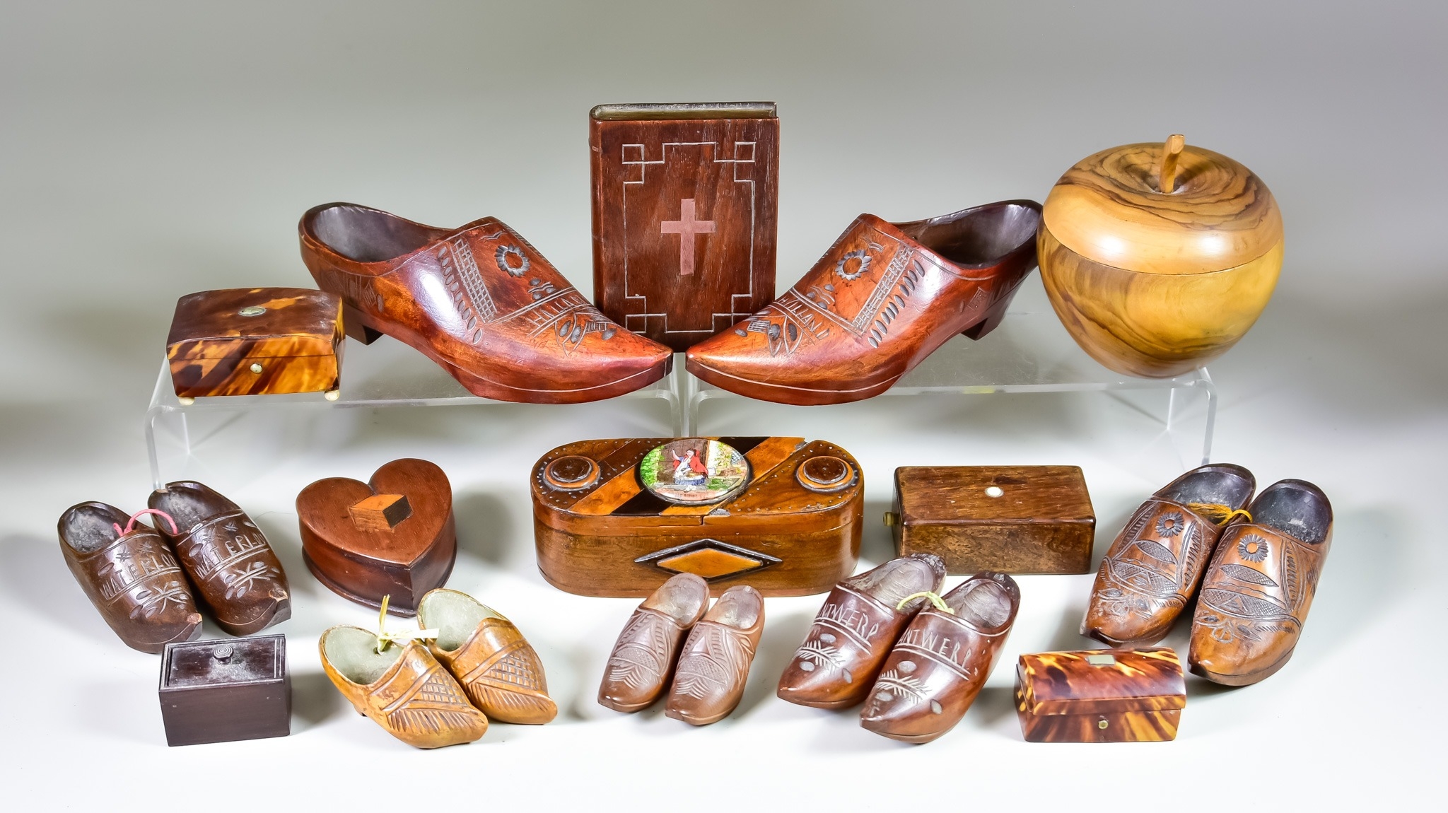 A Small Collection of Treen Items, comprising - six pairs of clogs, a heart shaped box, an apple shaped box, a puzzle box, a bible, two small boxes and two other tortoise shell boxes