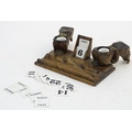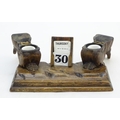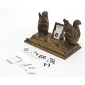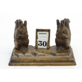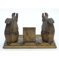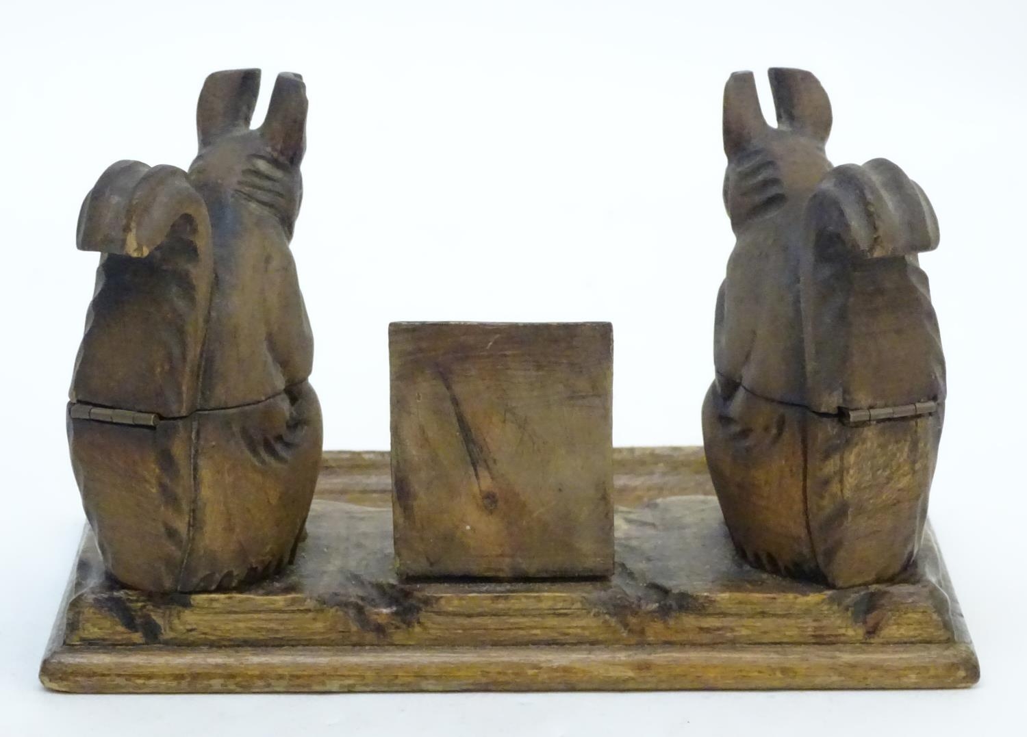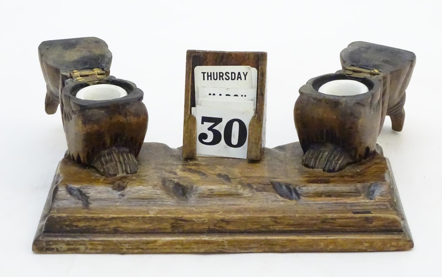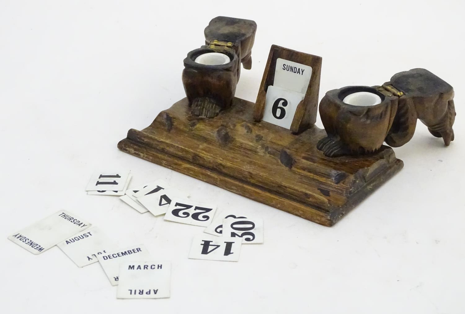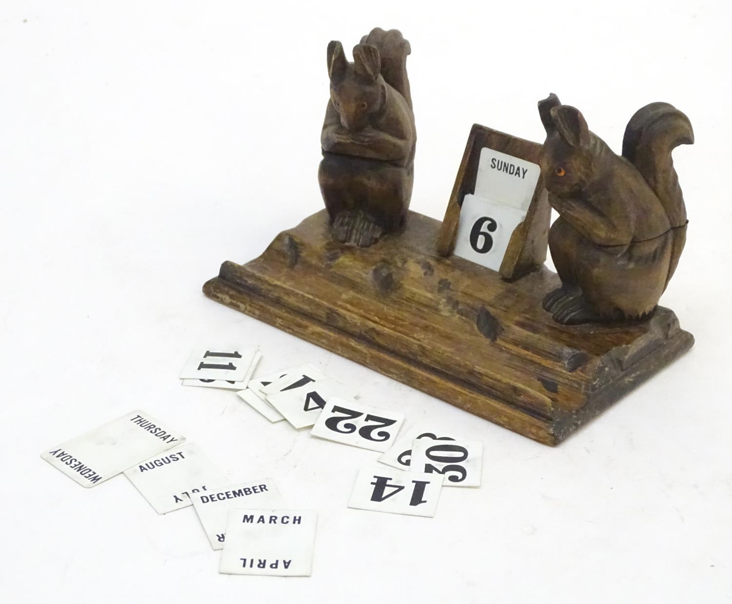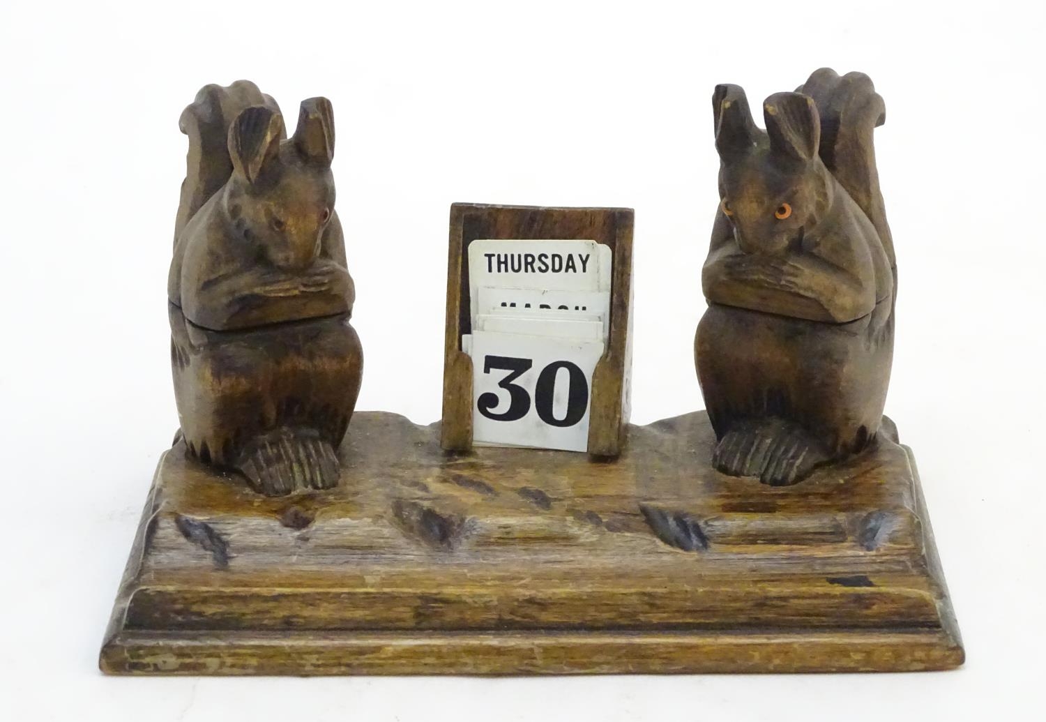 A carved wooden desk calendar and standish / inkwell, the inkwells formed as squirrels eating nuts. Approx. 4 3/4" high