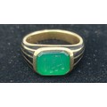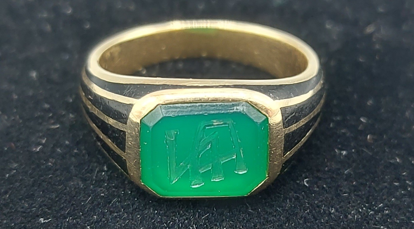 A Continental Gold and enamel ring set with intaglio stone, ring size P, 7.9g