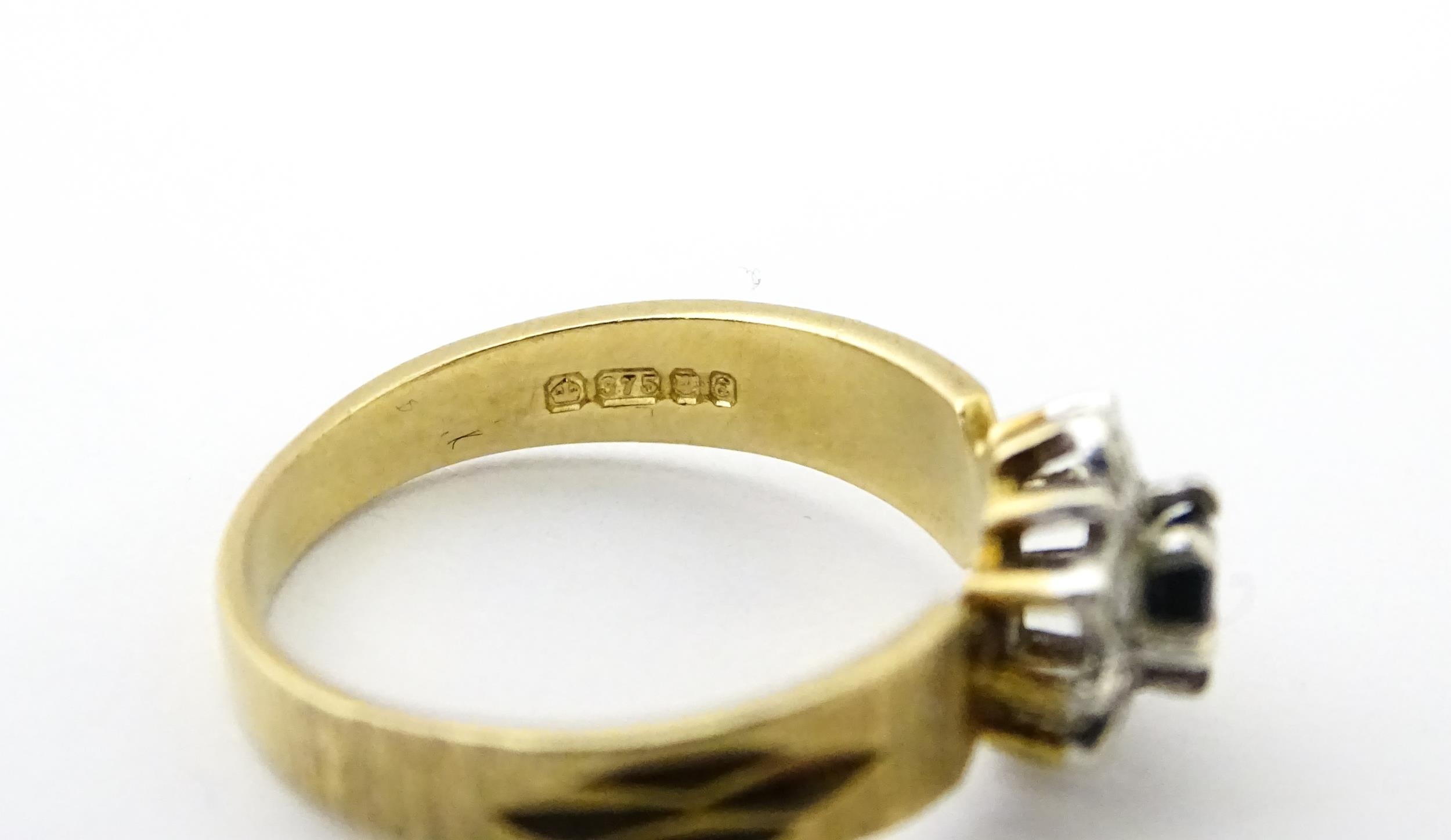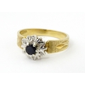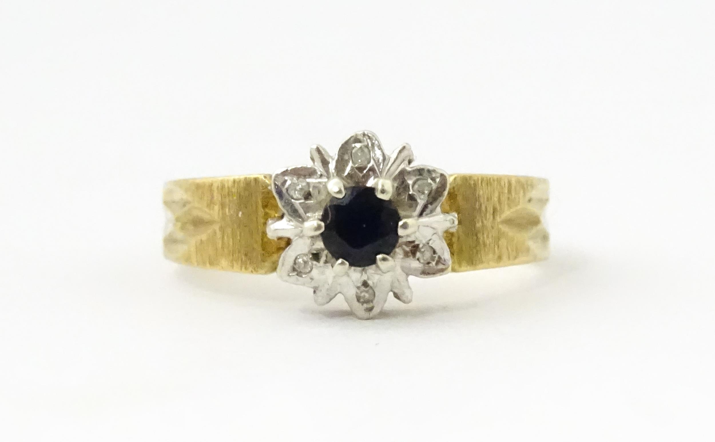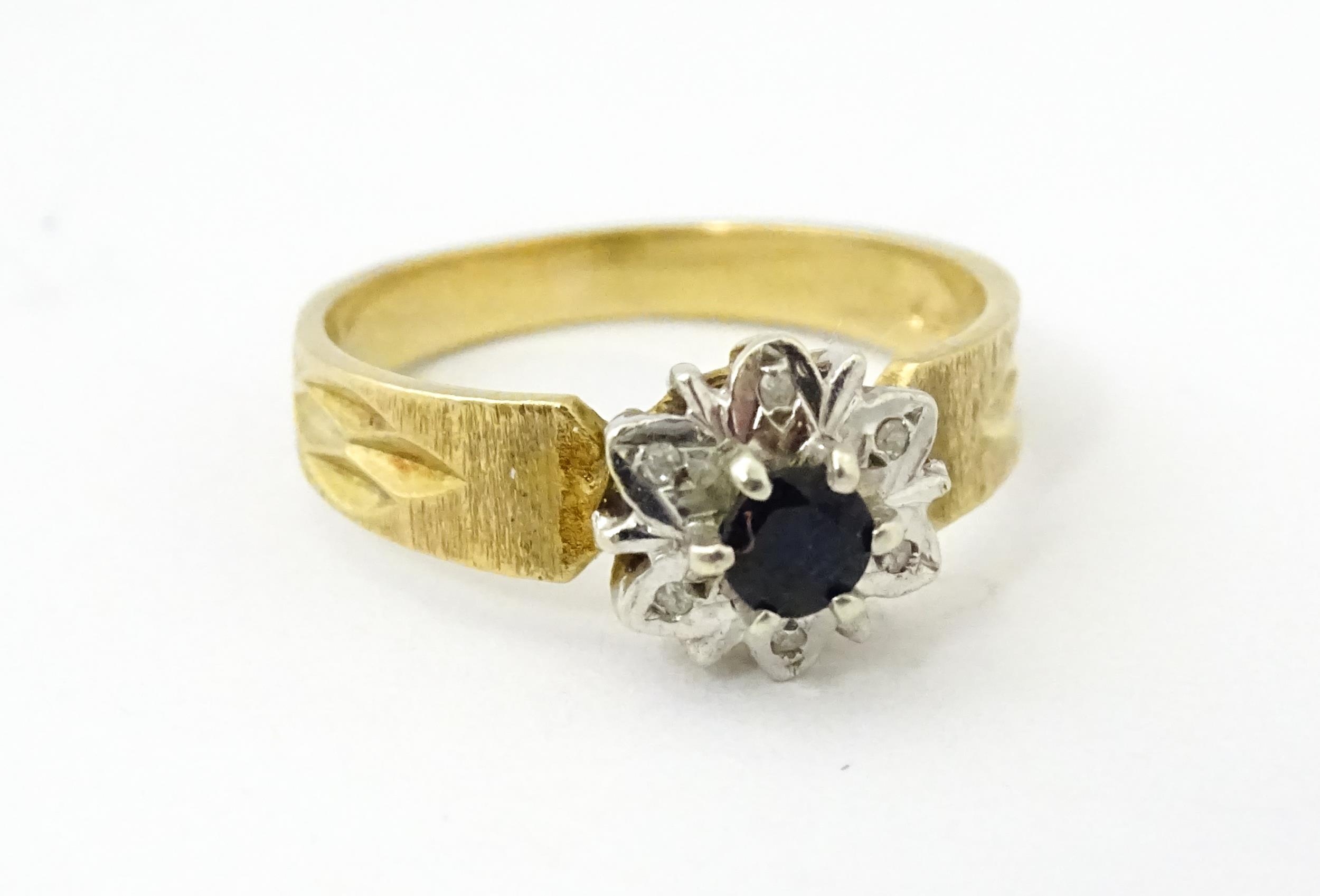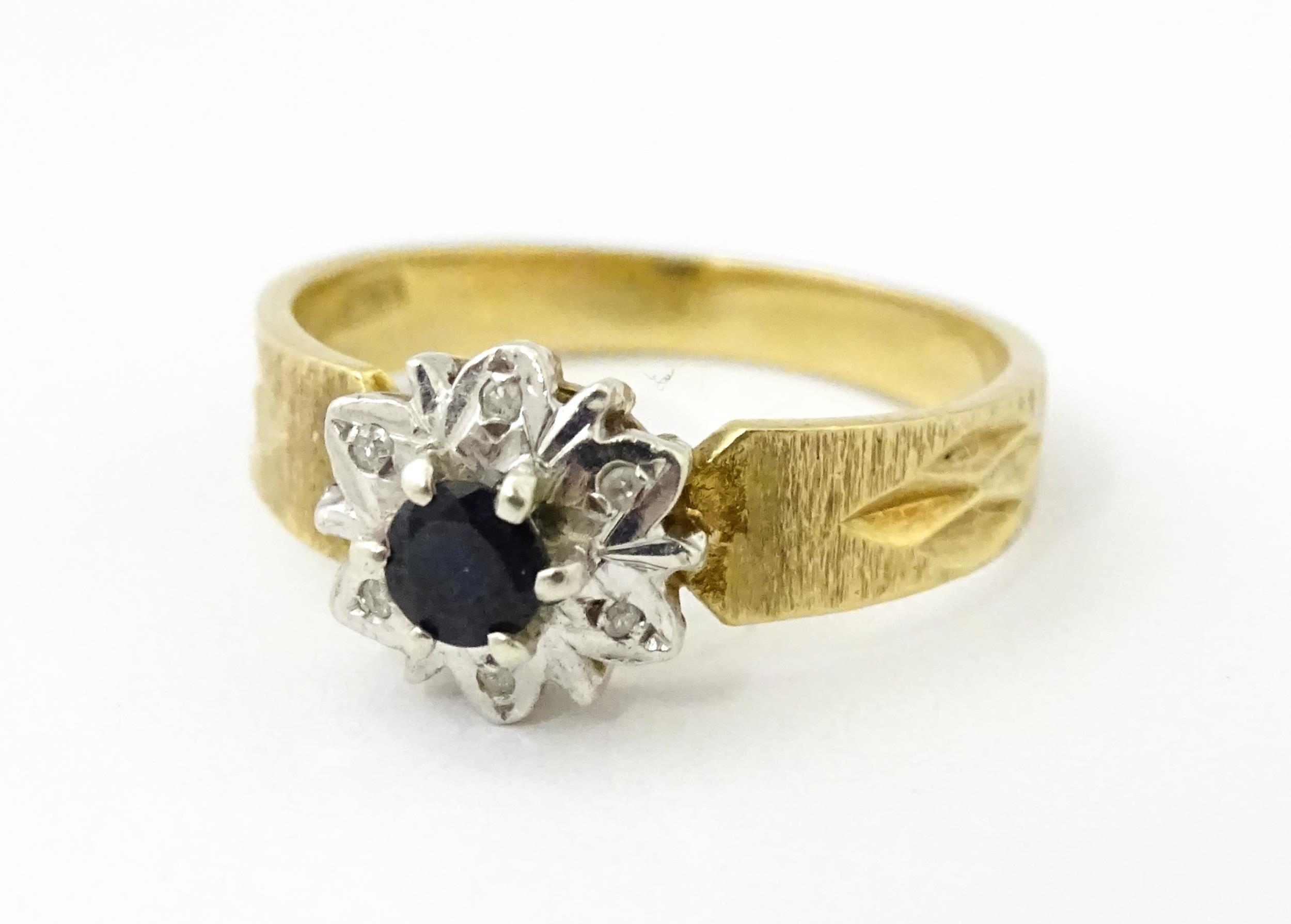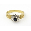 A 9ct gold ring set with central sapphire bordered by diamonds. Ring size approx. L 1/2