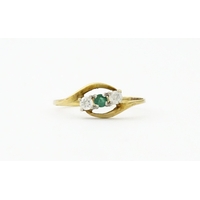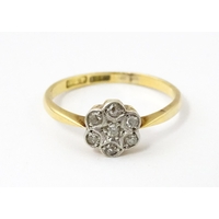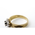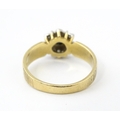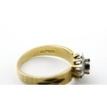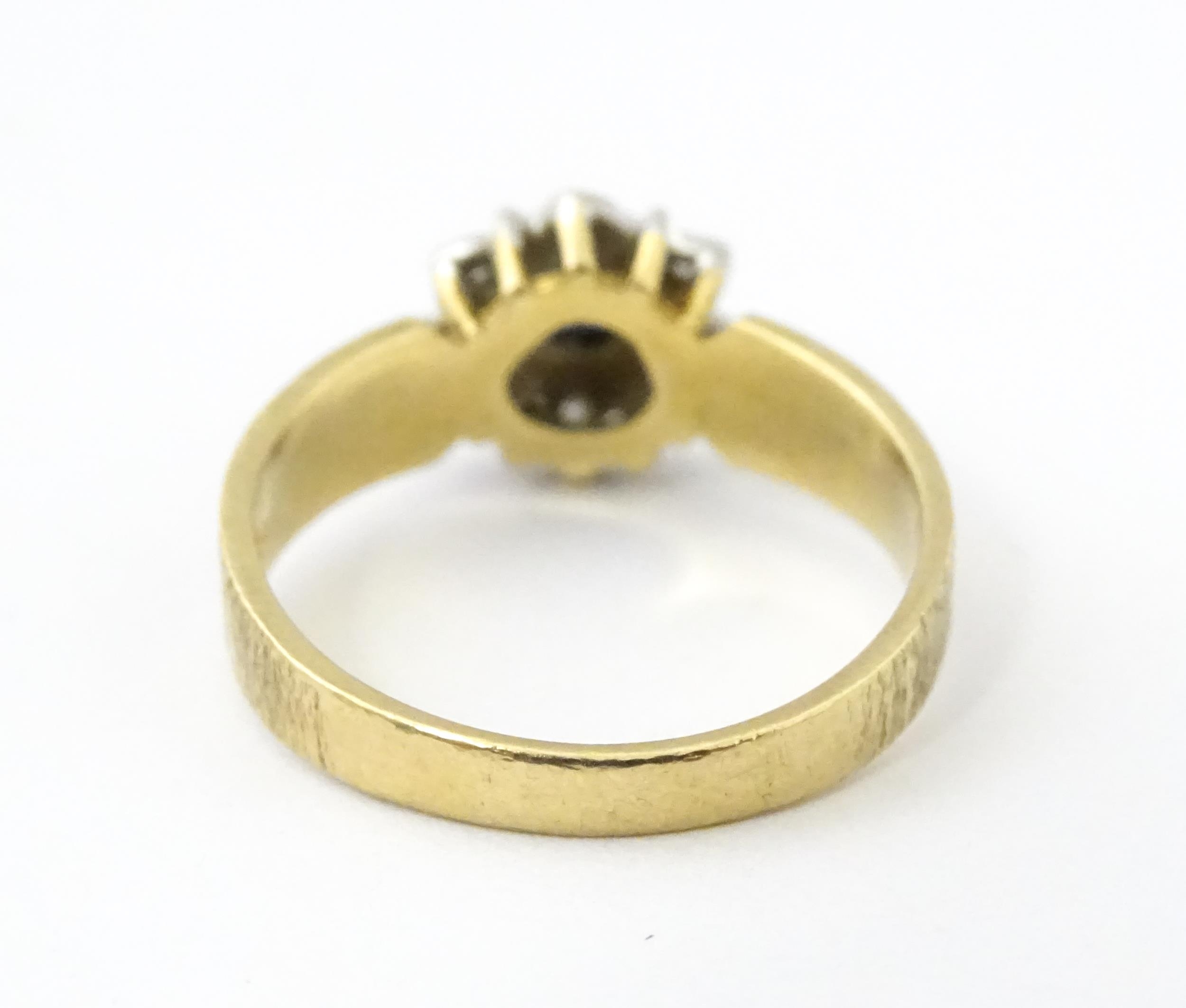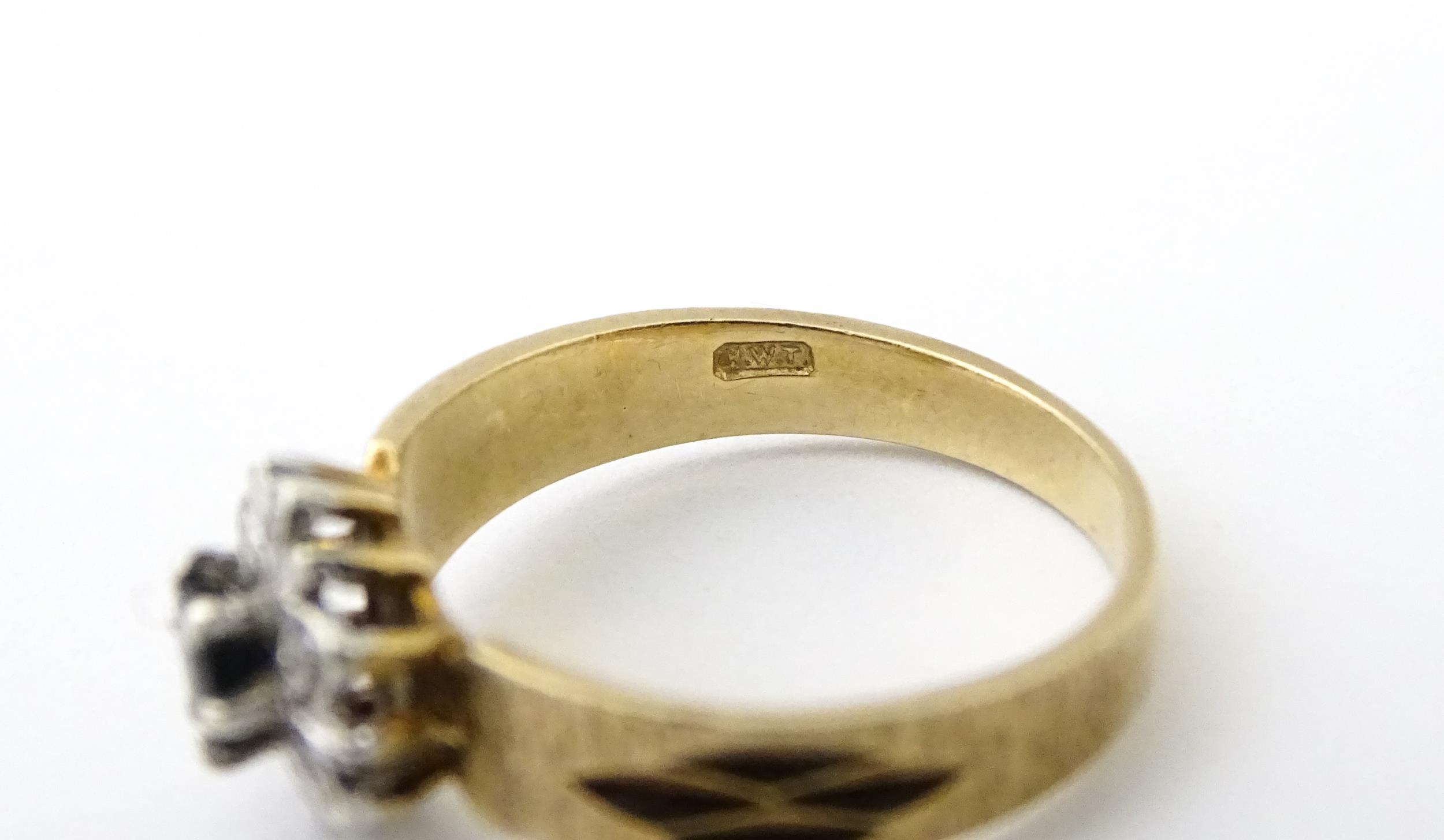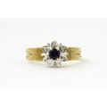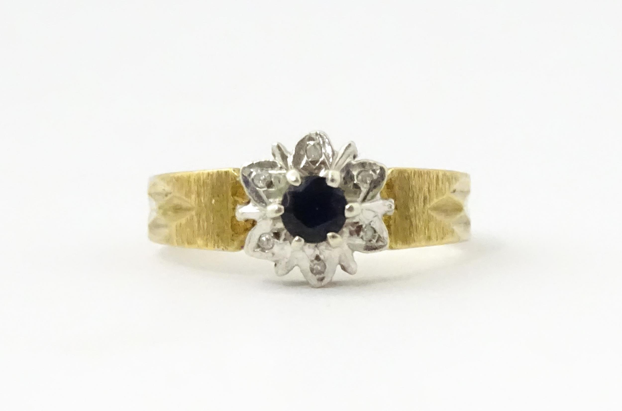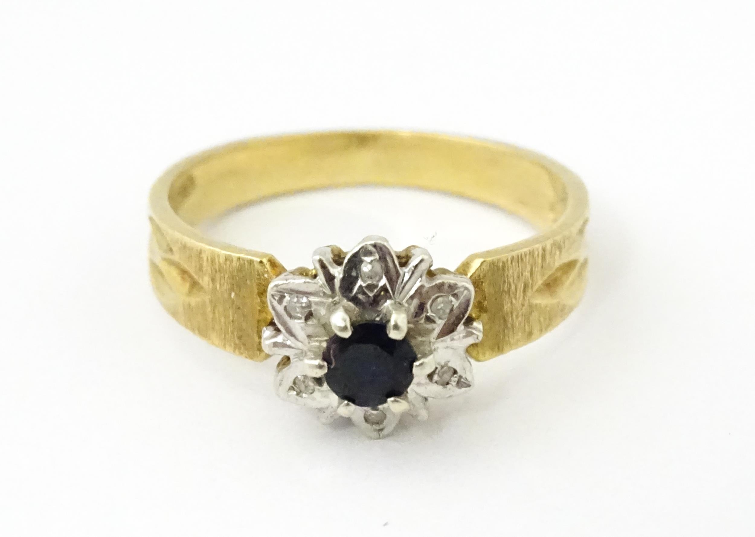 A 9ct gold ring set with central sapphire bordered by diamonds. Ring size approx. L 1/2