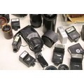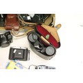 A large collection of cameras contained within two boxes to include Nikon, Fujica and Canon examples.