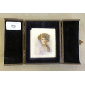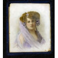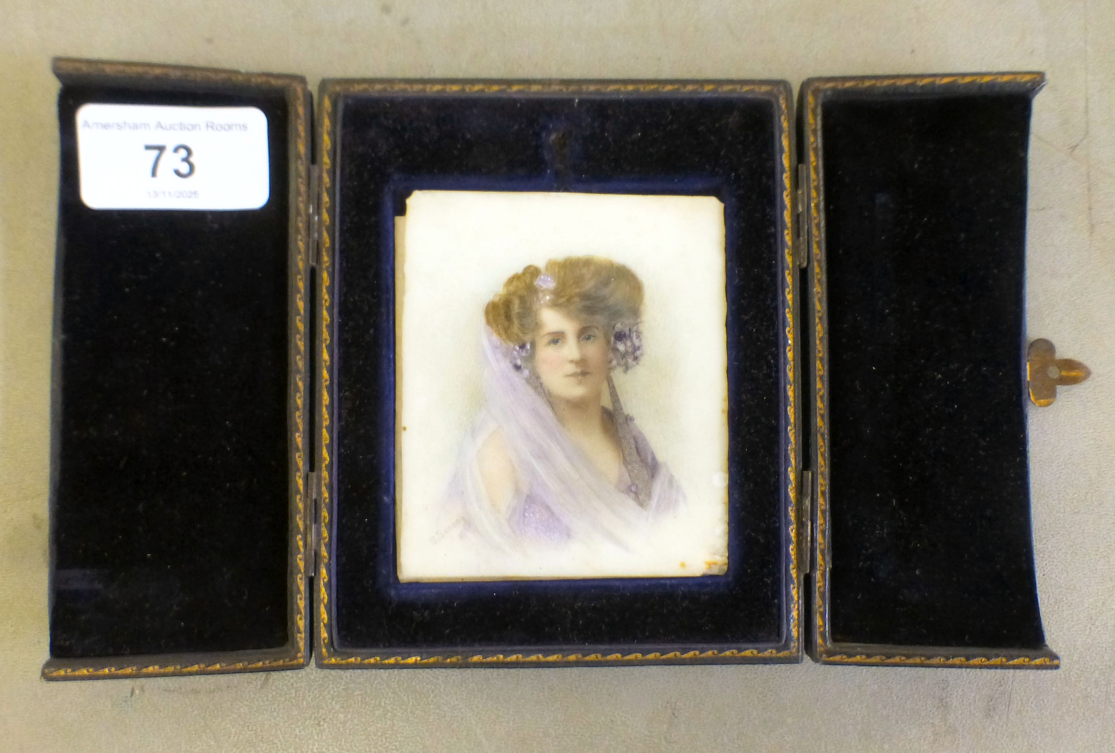 S Sanony - an early 20thC portrait miniature, a formally dressed woman  watercolour on porcelain  3"sq  cased