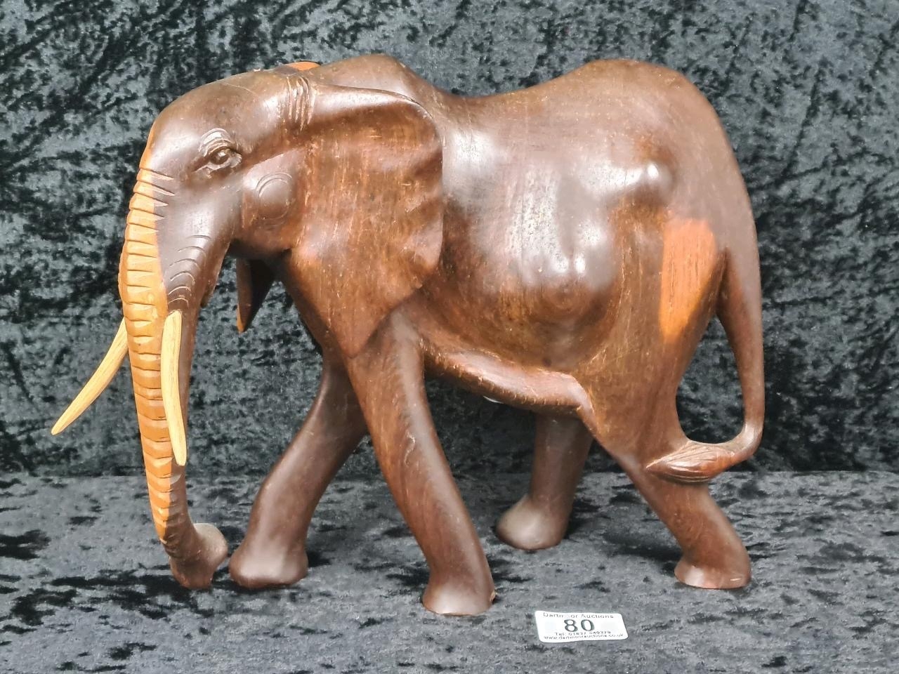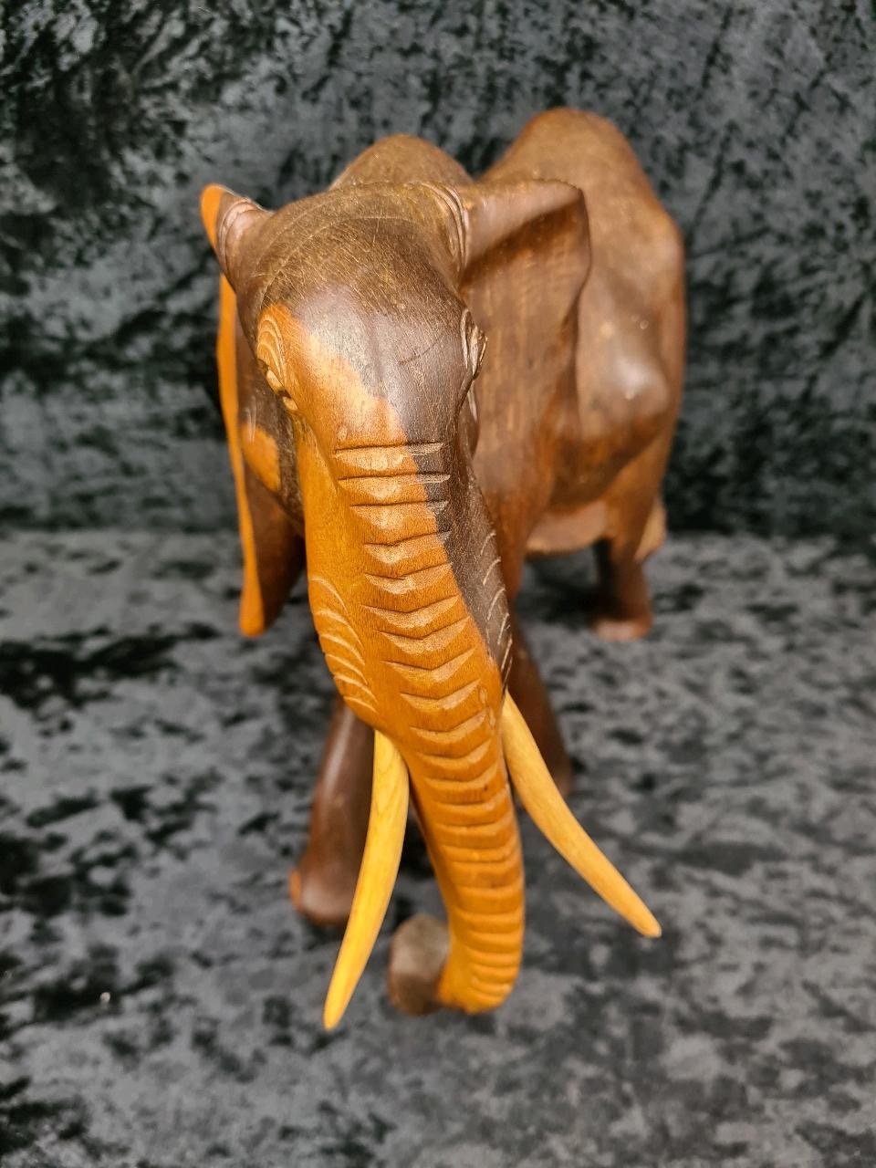 Rather magnificent hand-crafted rosewood/teak elephant sculpture, most likely from Thailand or India. Approx H26cm.