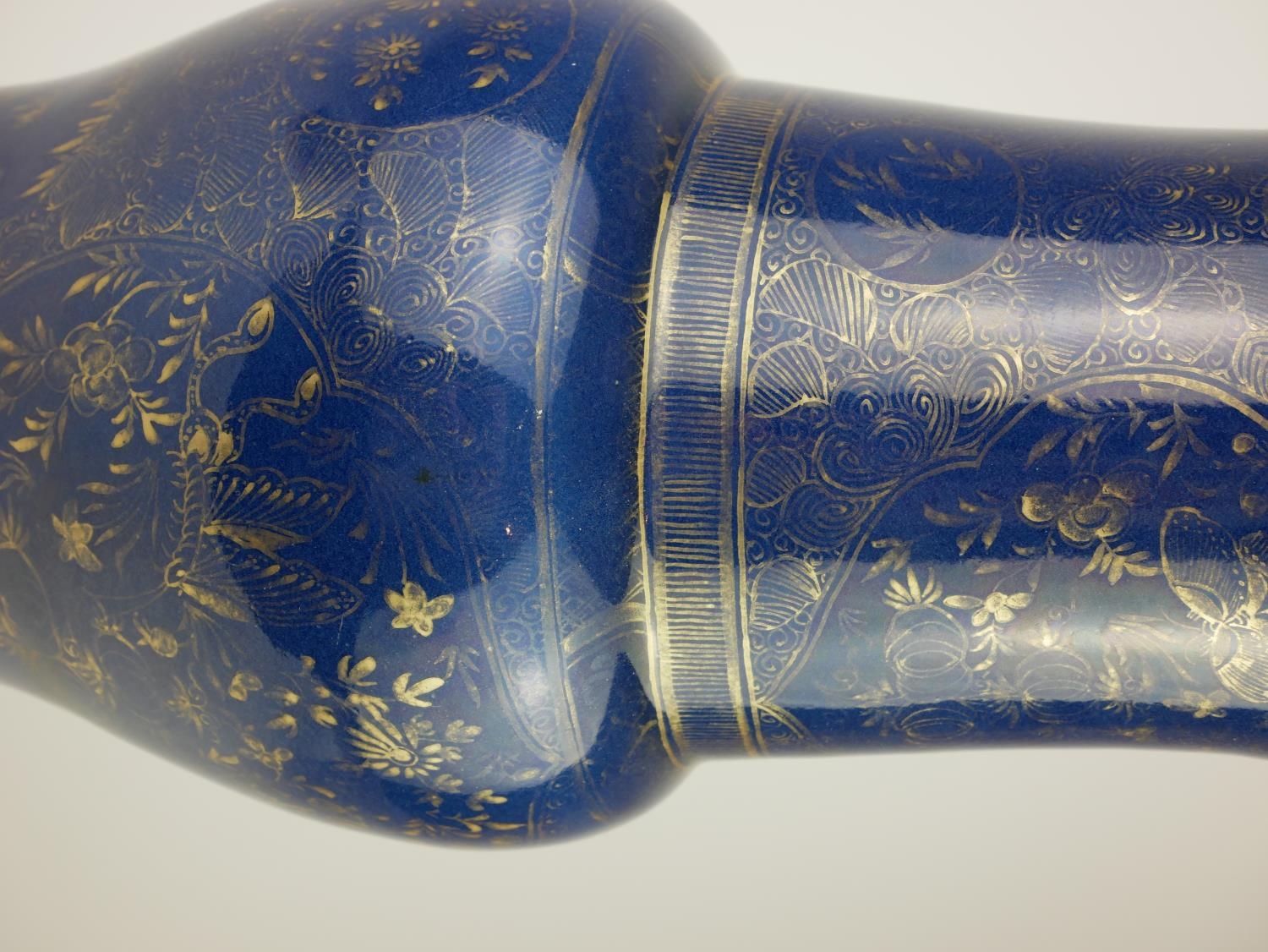 With everted rim, powder blue glazed, applied in gilt with butterflies and floral panels on a lustre ground.