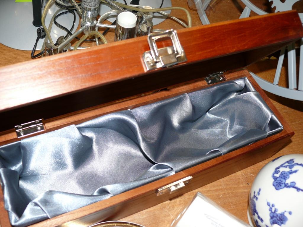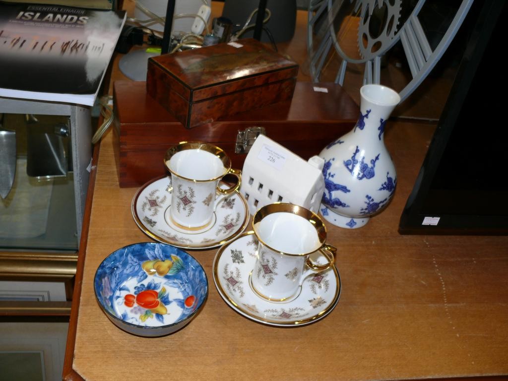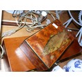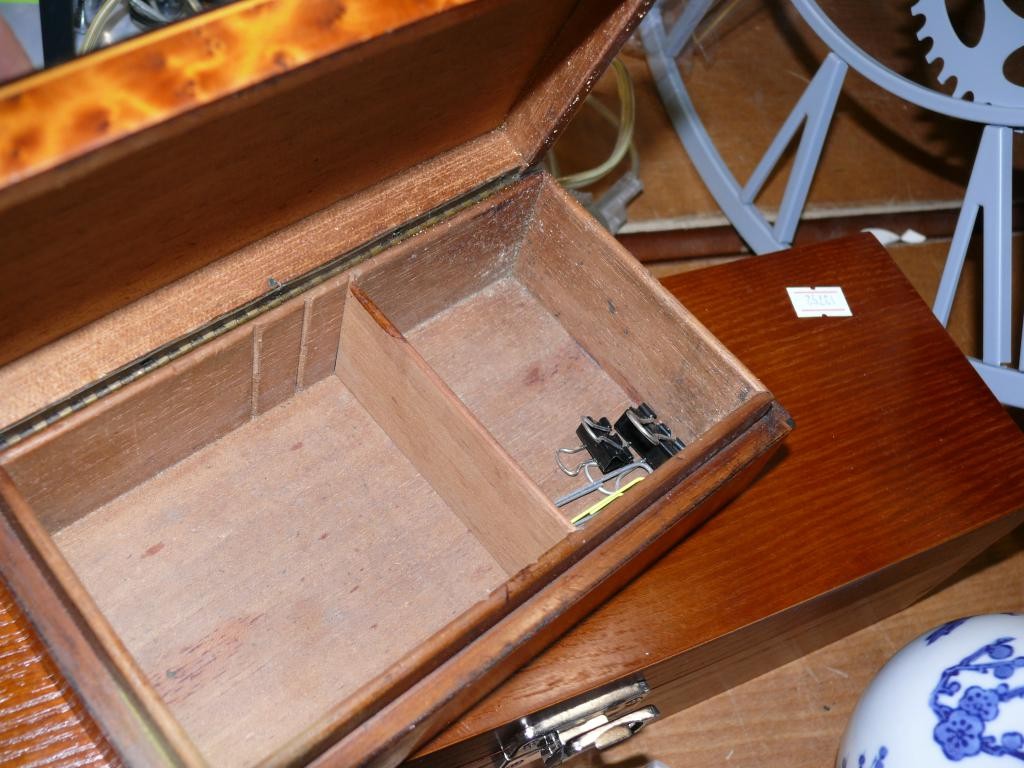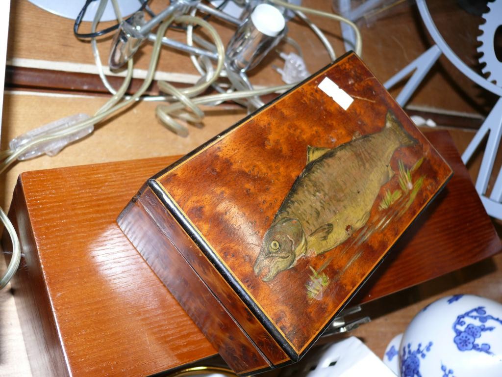 2 WOODEN BOXES, 1 WITH A PAINTED FISH ON LID. TOGETHER WITH A COLLECTION OF CERAMICS.