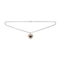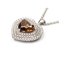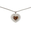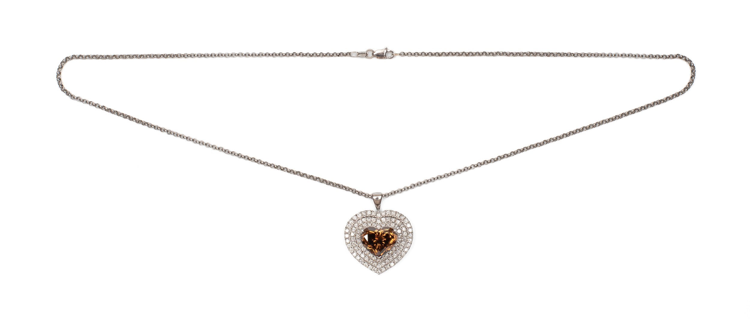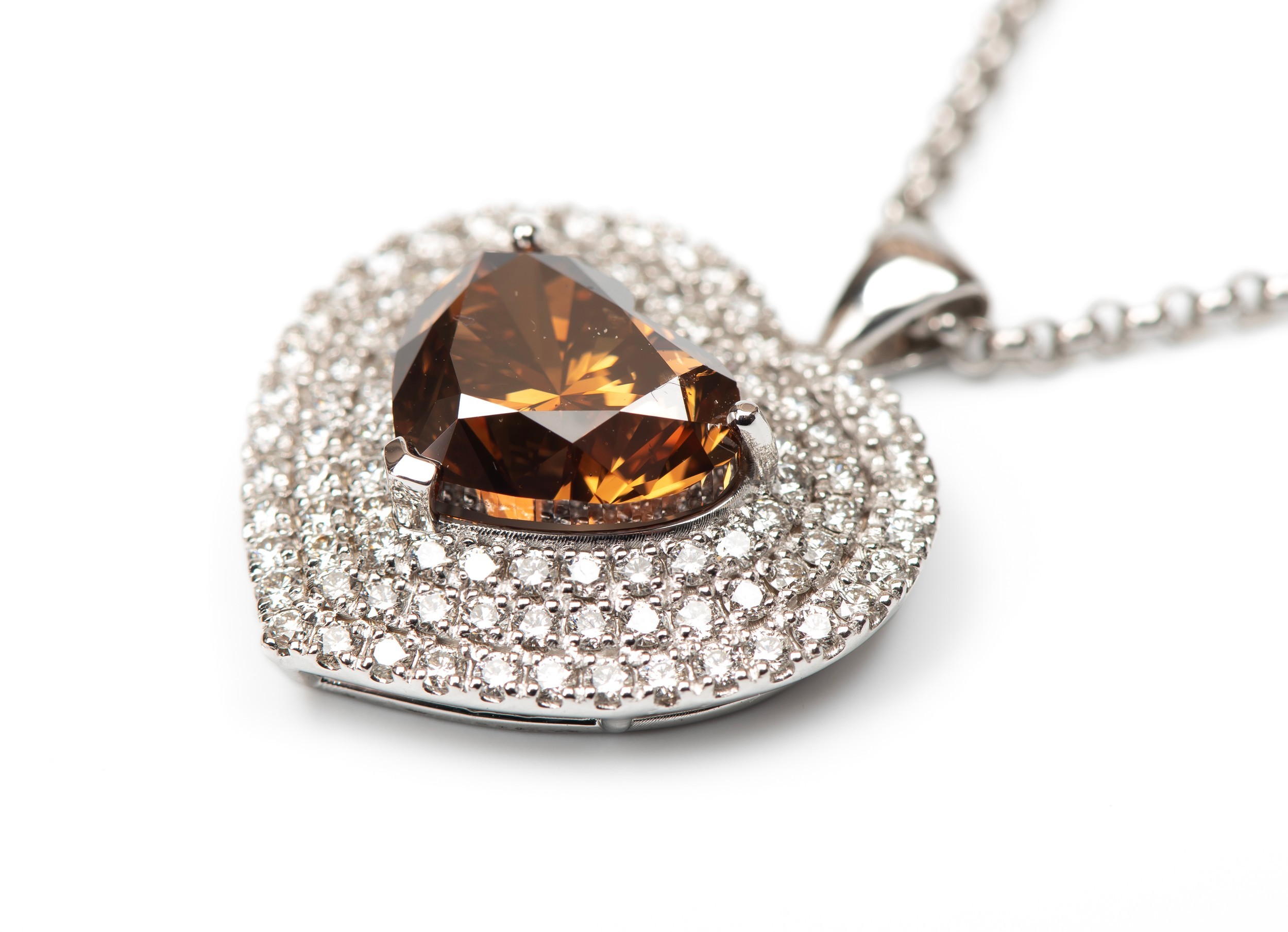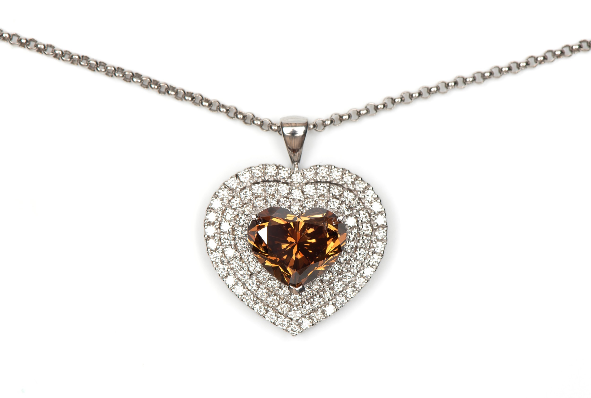 Claw set to the centre the GIA certified heart shaped diamond, 7.67 carats, colour Fancy Dark Orange Brown, clarity I1, embellished by 96 round brilliant cut pave set diamonds, weight 1.68 carats, colour G, clarity VS, in an 18ct white gold pendant on a 43cm gold chain, GIA CERTIFICATE NUMBER 3365599056