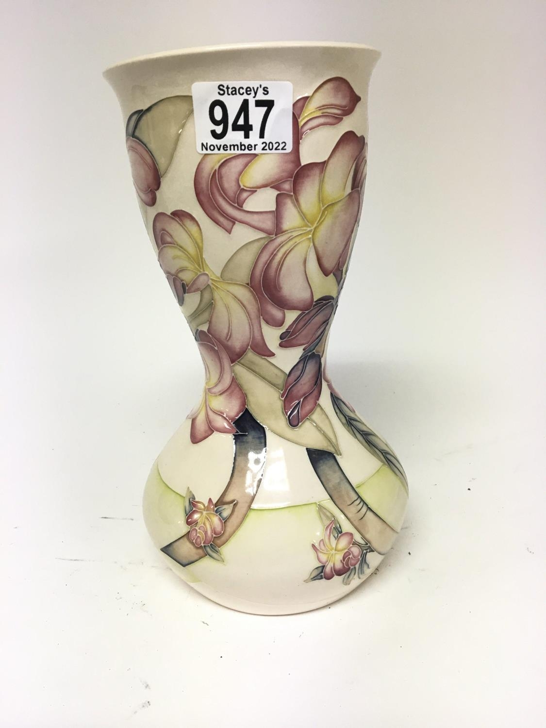 A Moorcroft vase of unusual shape decorated with orchids on a pale cream ground a trial vase dated 23-10-00 Height 26cm no obvious damage or restoration.
