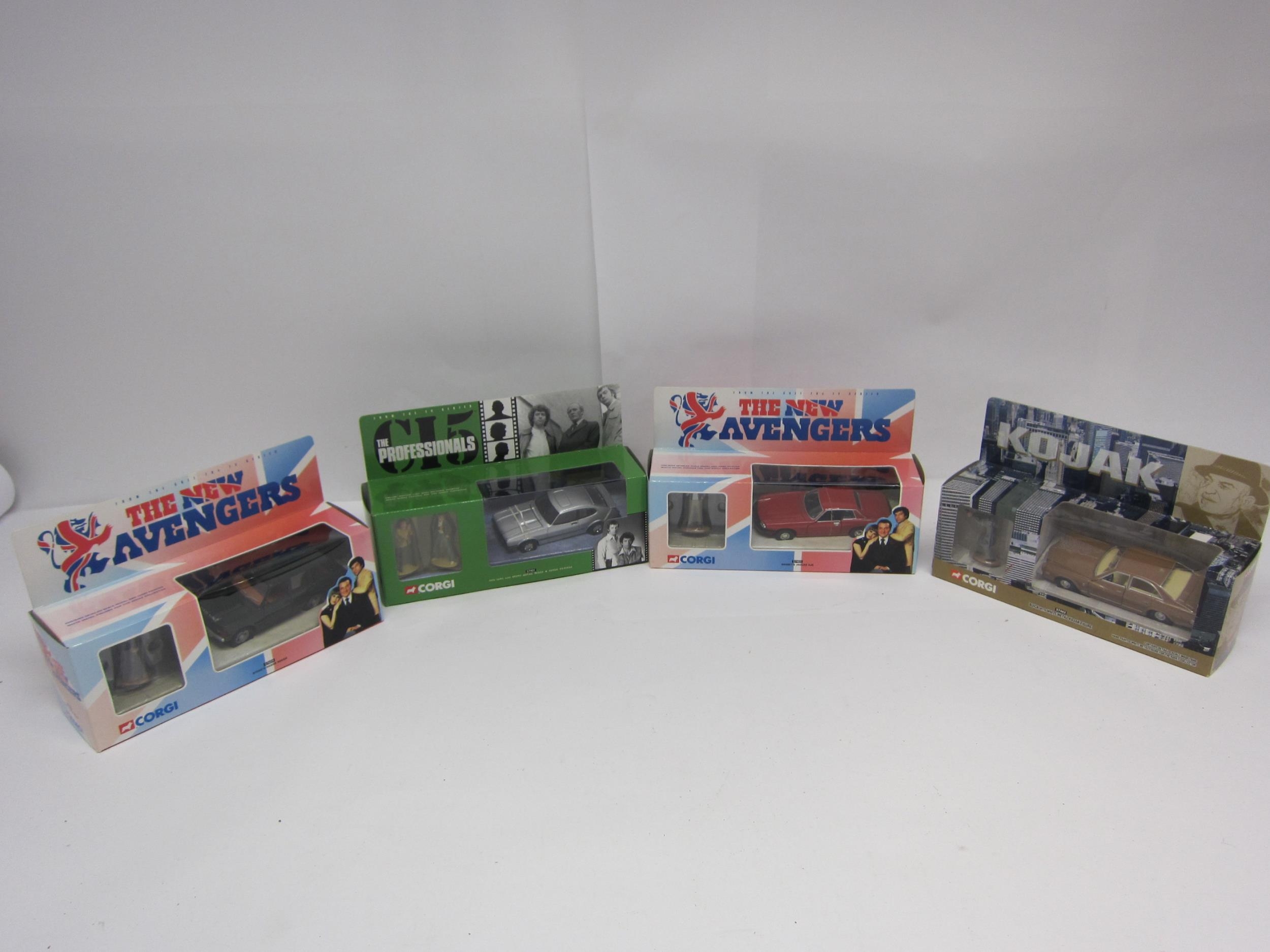 Four boxed Corgi TV and Film related diecast vehicle and figure sets to include 57403 Kojak, 57401 The Professionals, 57604 The New Avengers and 57405 The New Avengers (4)