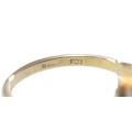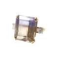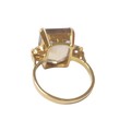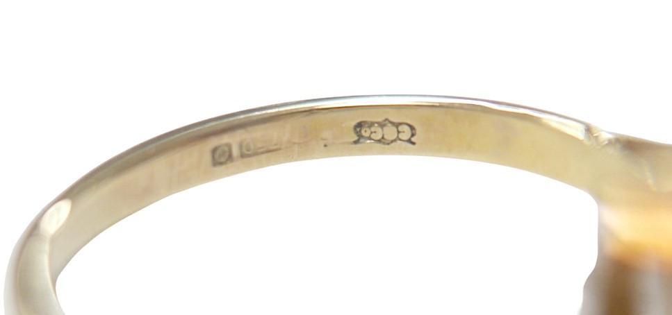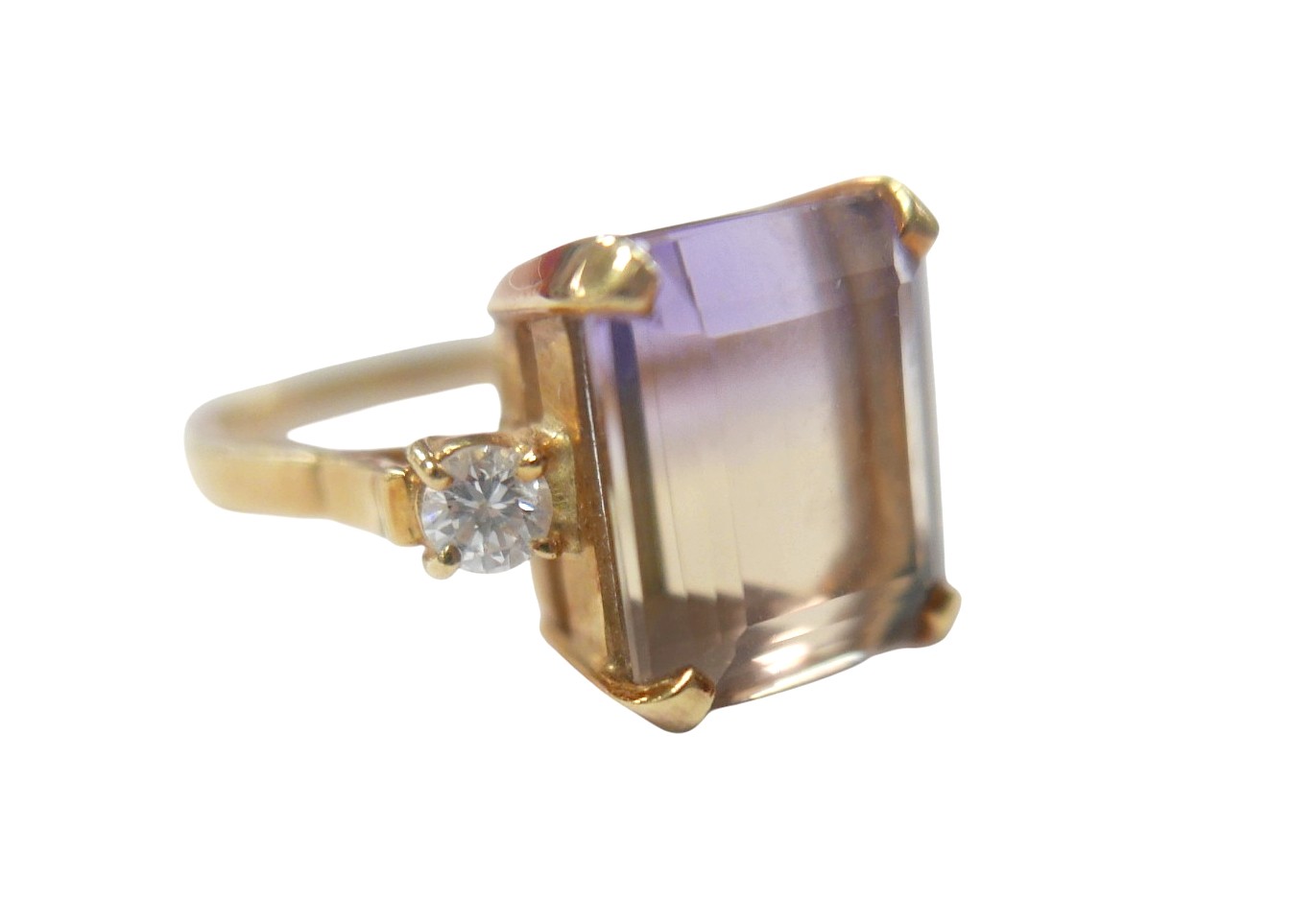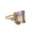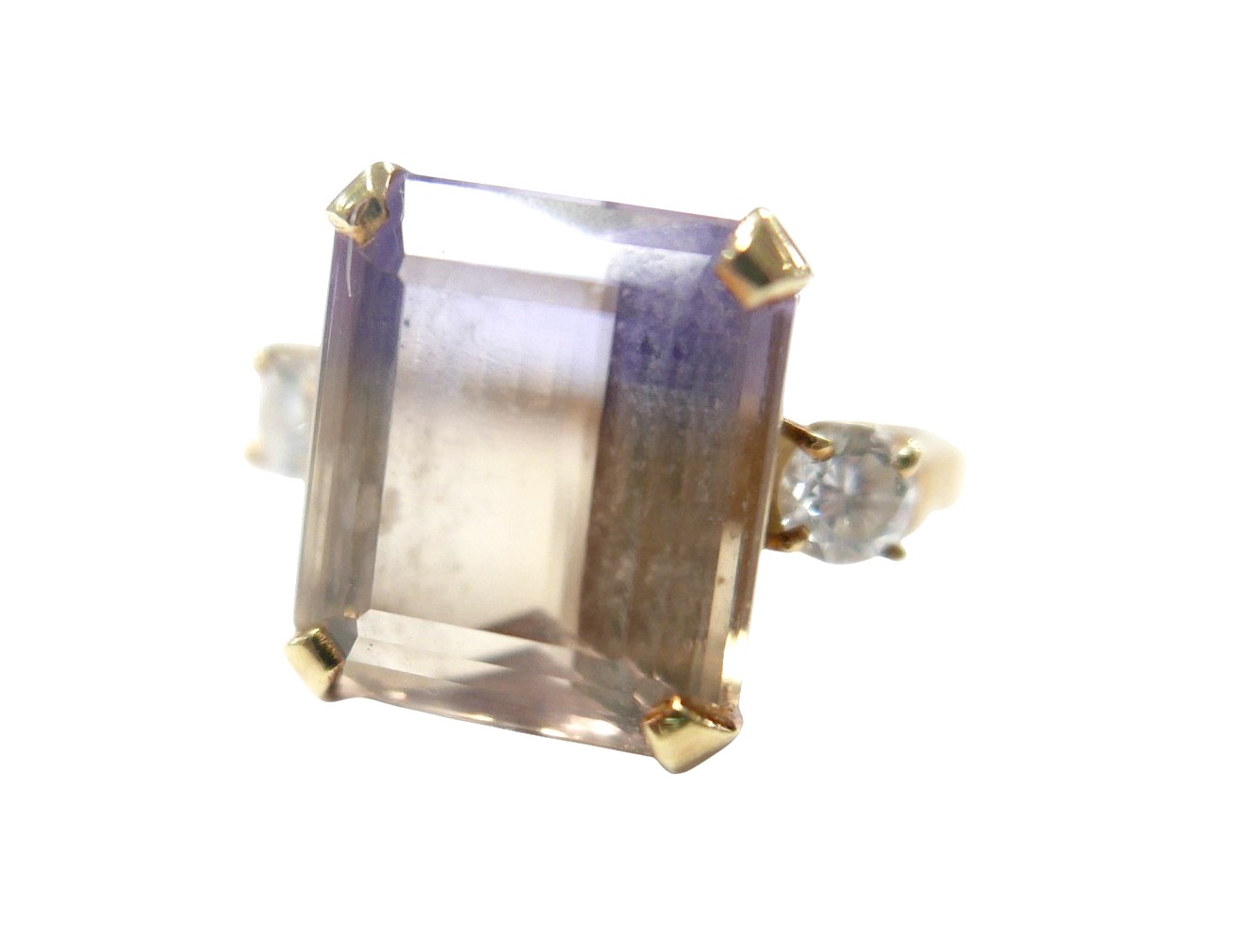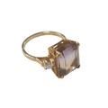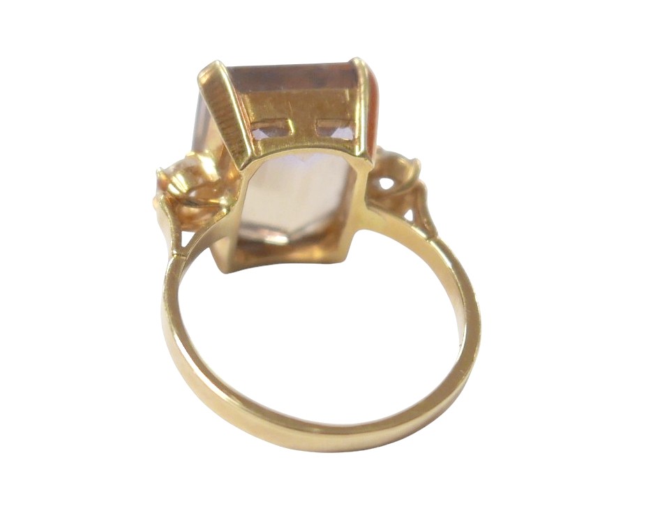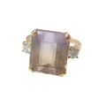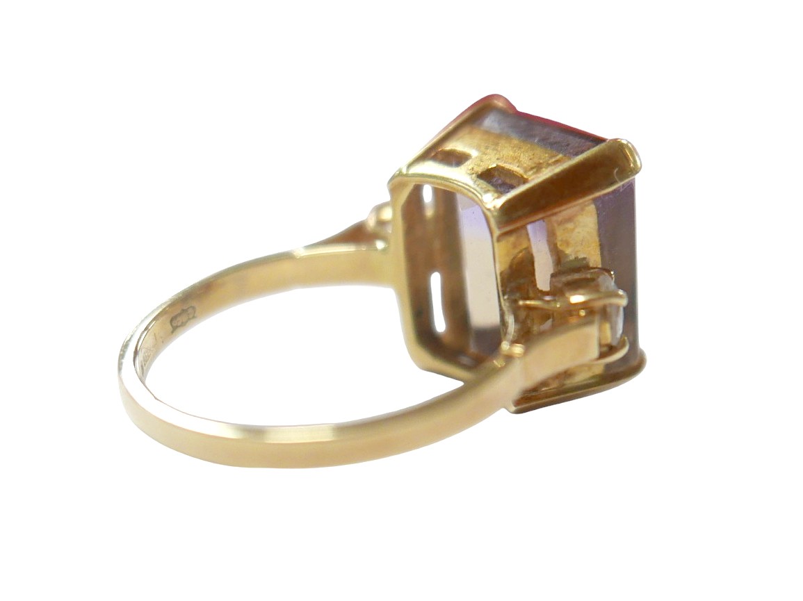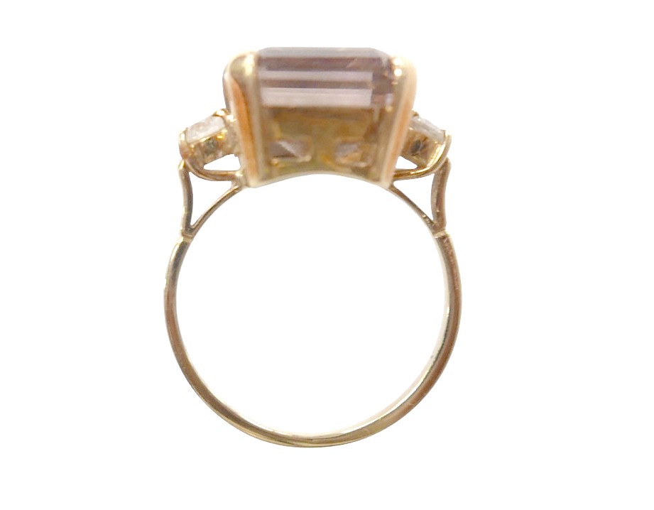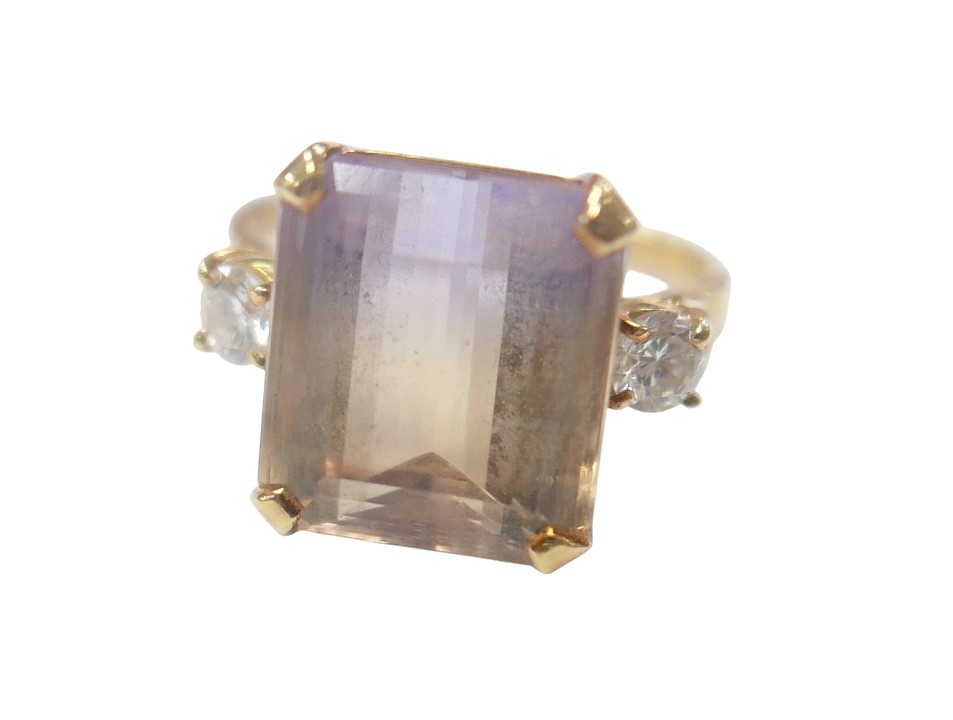 An 18ct yellow gold bi-colour tourmaline and diamond ring the central stone approximately 6ct flanked by two brilliant cut diamonds, size L, 5.2g.