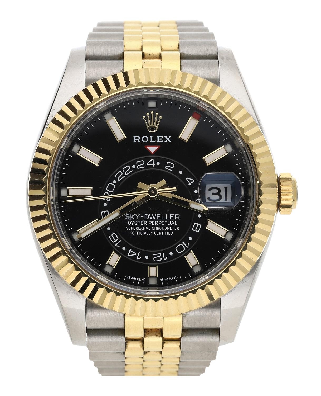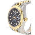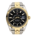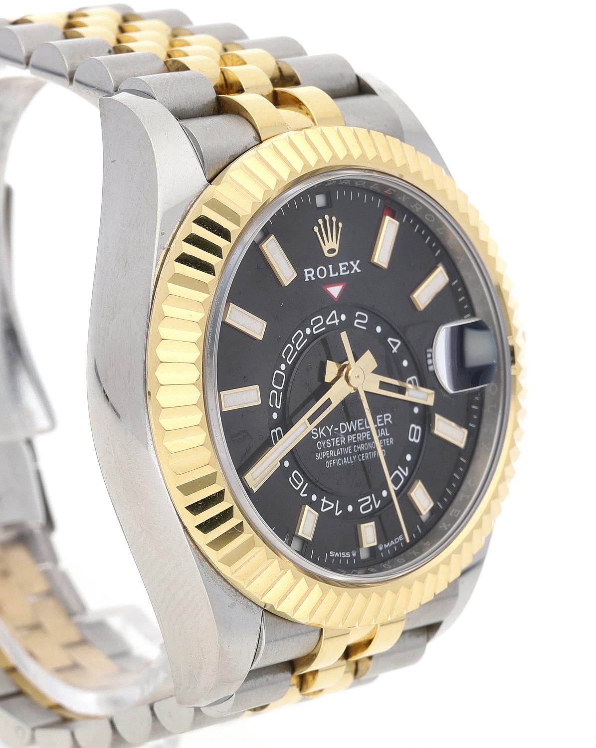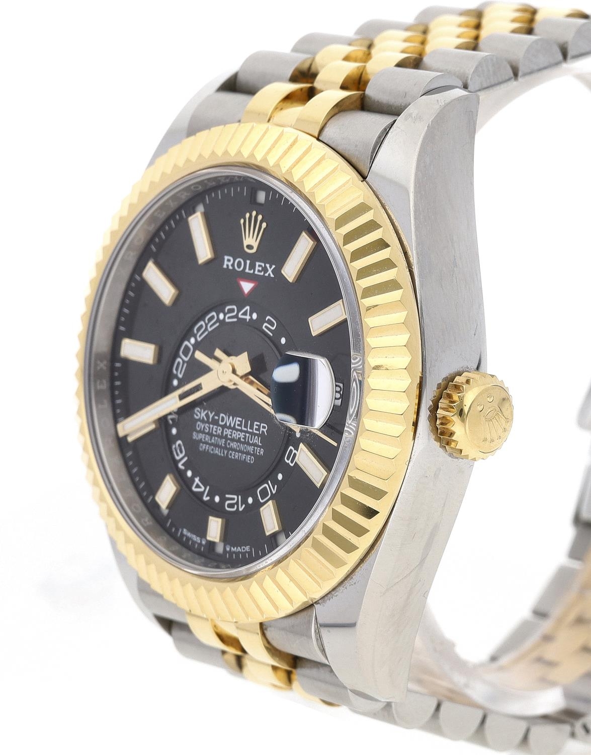 Rolex Oyster Perpetual Sky-Dweller stainless steel and gold gentleman's wristwatch, reference no. 336933, serial no. 4X0D8xxx, circa 2023, black dial, fluted bi-directional bezel with three adjustment settings for time, quick-set hour and annual calendar, Jubilee bracelet, 42mm (ref: 211)