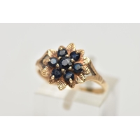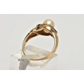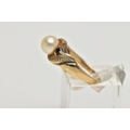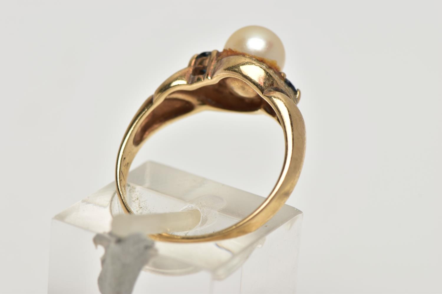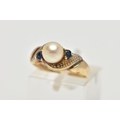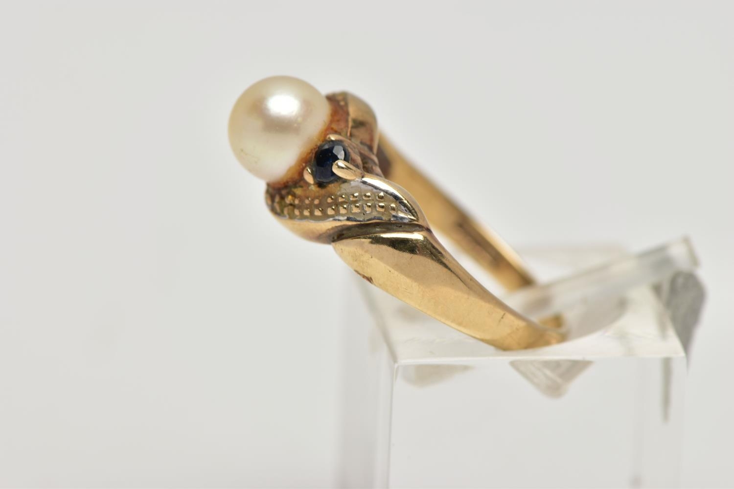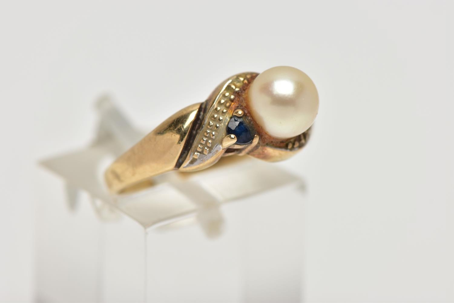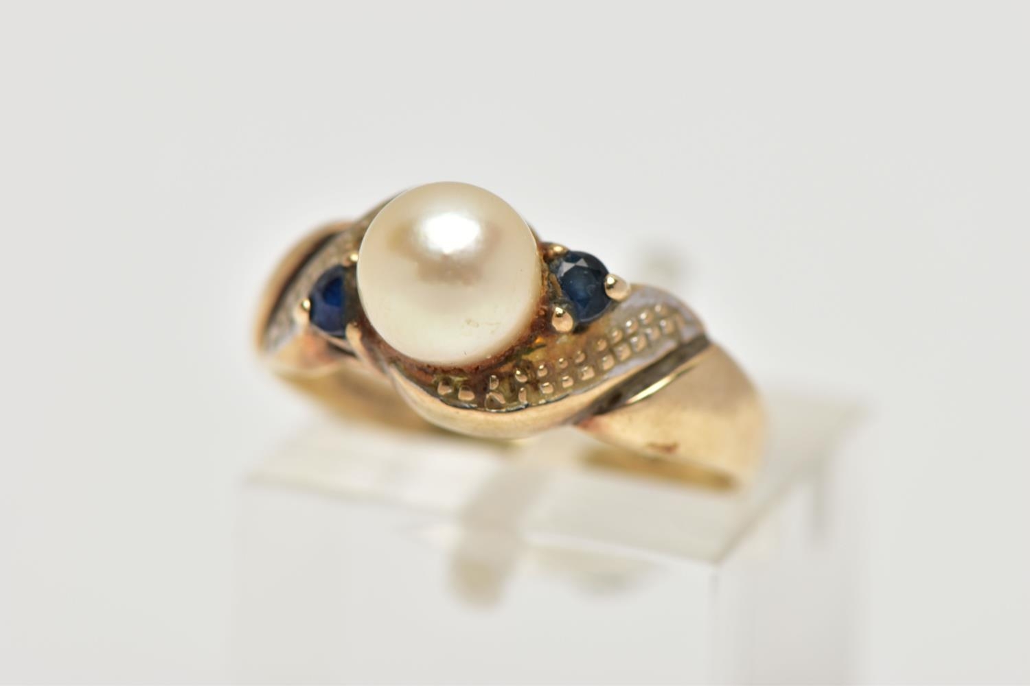 A 9CT GOLD CULTURED PEARL AND SAPPHIRE DRESS RING, the cultured pearl, with asymmetric set circular shape sapphire sides, AF, hallmarked London, ring size L 1/2, approximate gross weight 2.80 grams (condition report: AF, an illusion set diamond is missing or severely worn, general wear in fair condition)