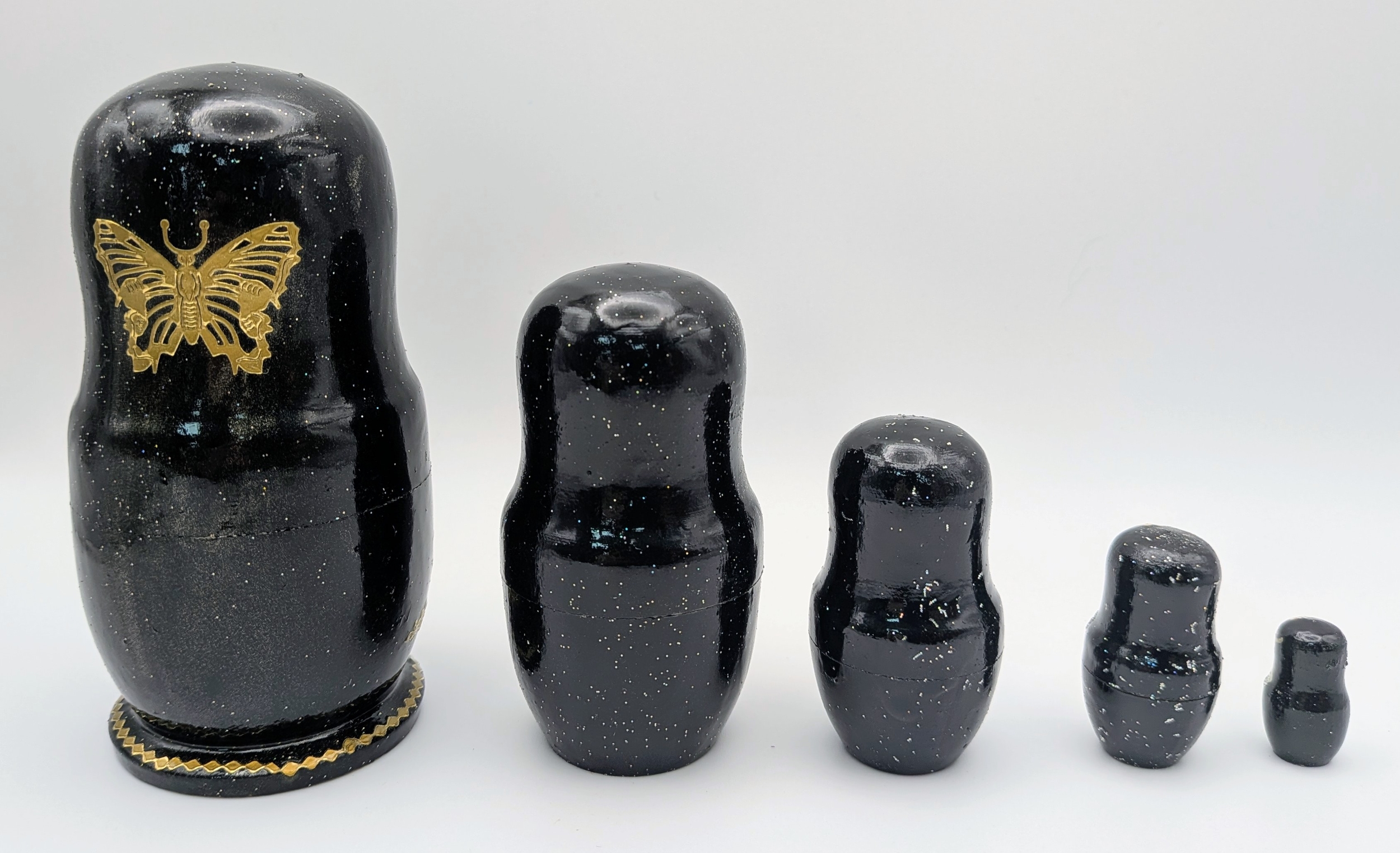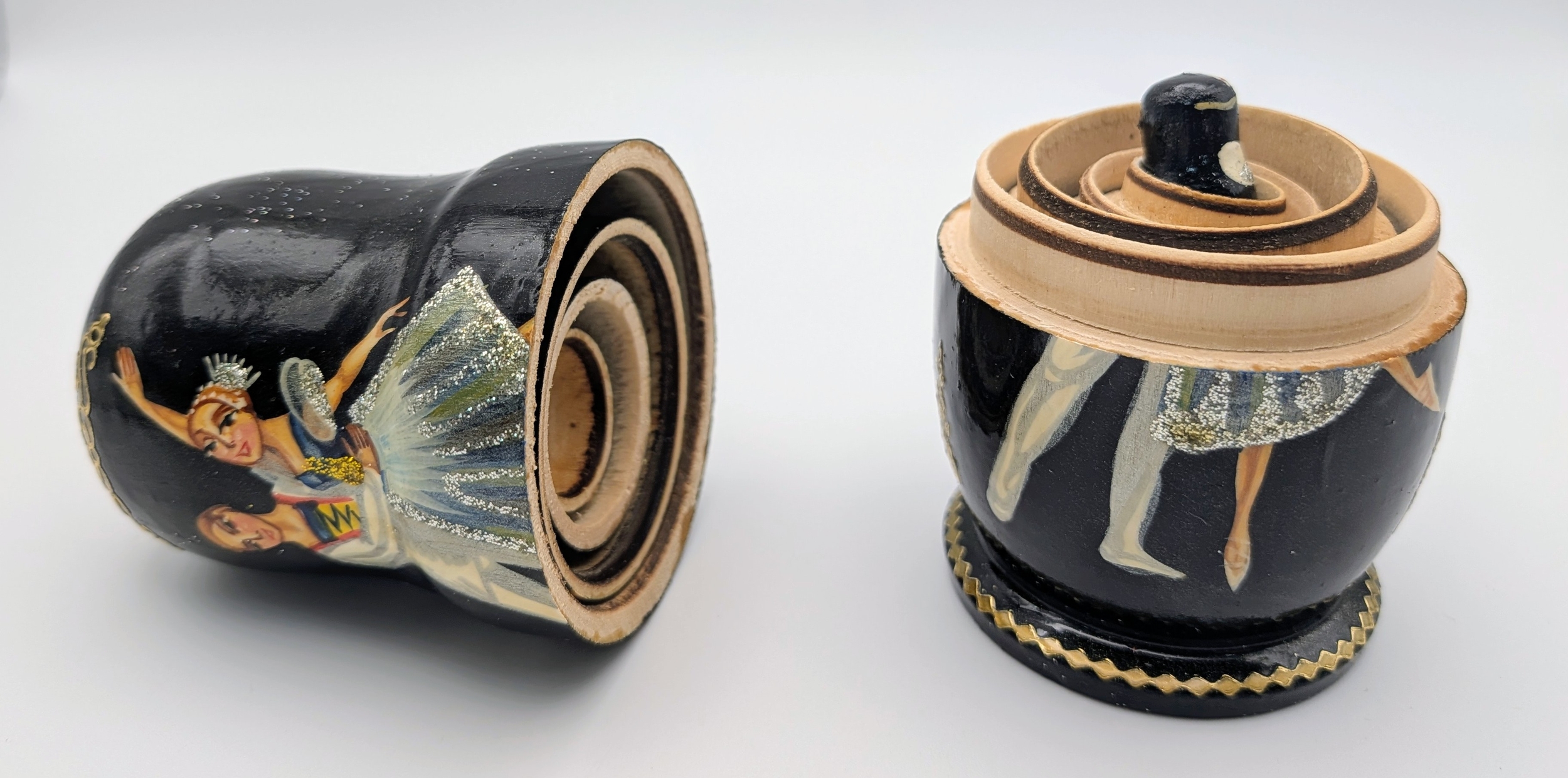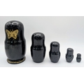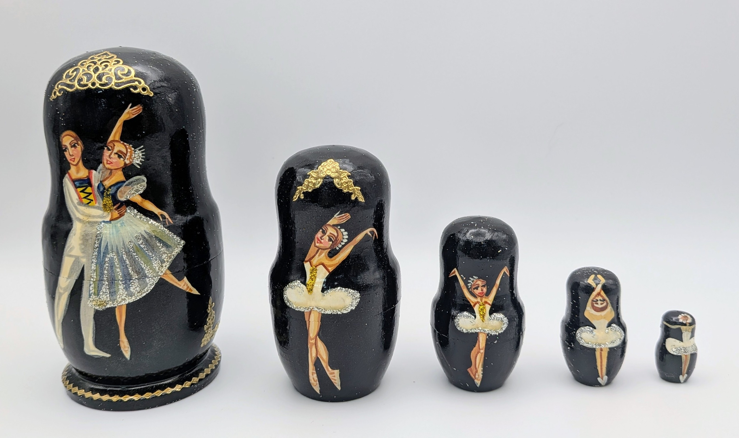 A Russian Swan Lake Ballet Nesting Doll Set, comprising five wooden dolls. Each piece fits neatly within the other. Measures approximately 11cm in height.