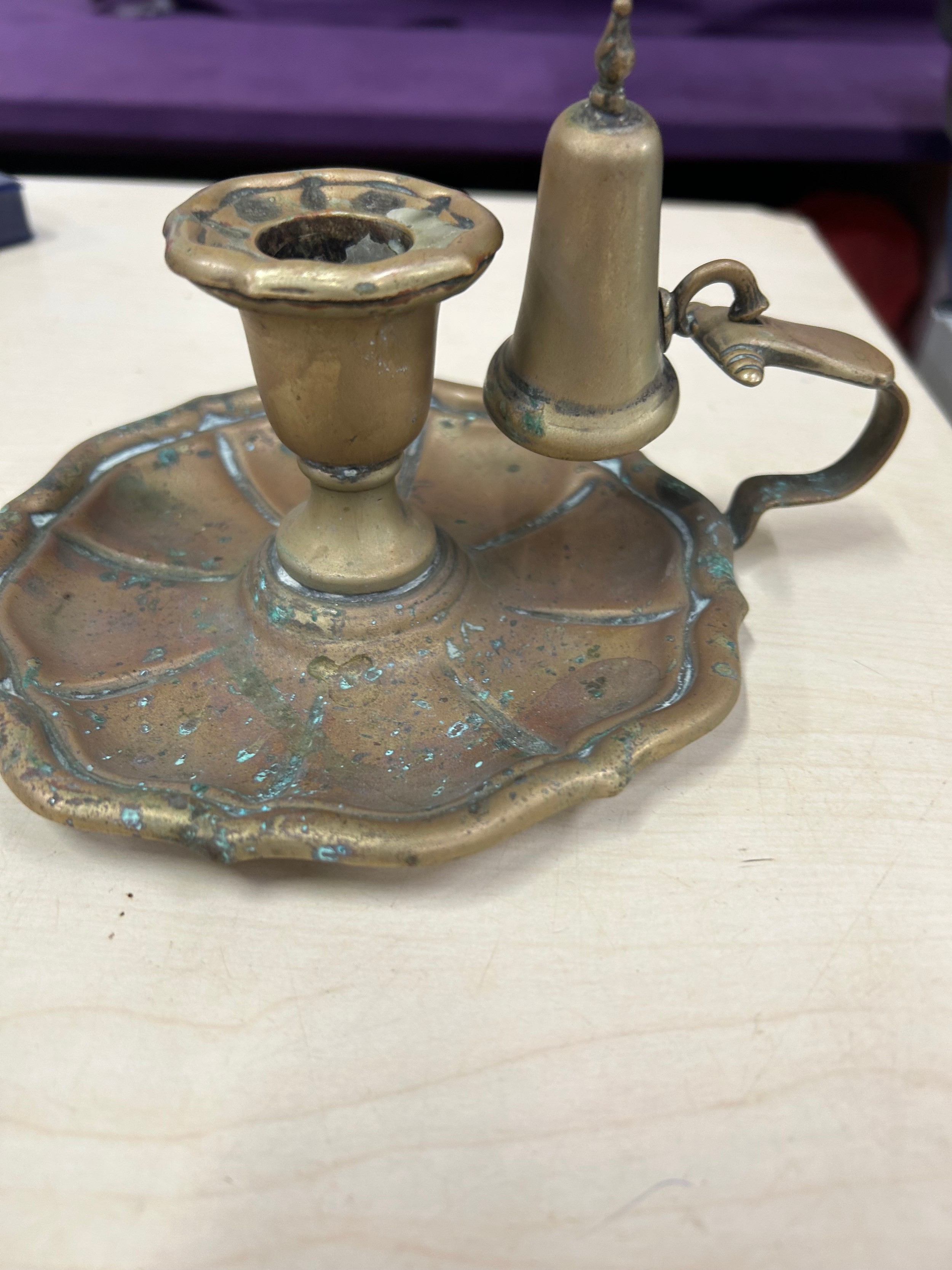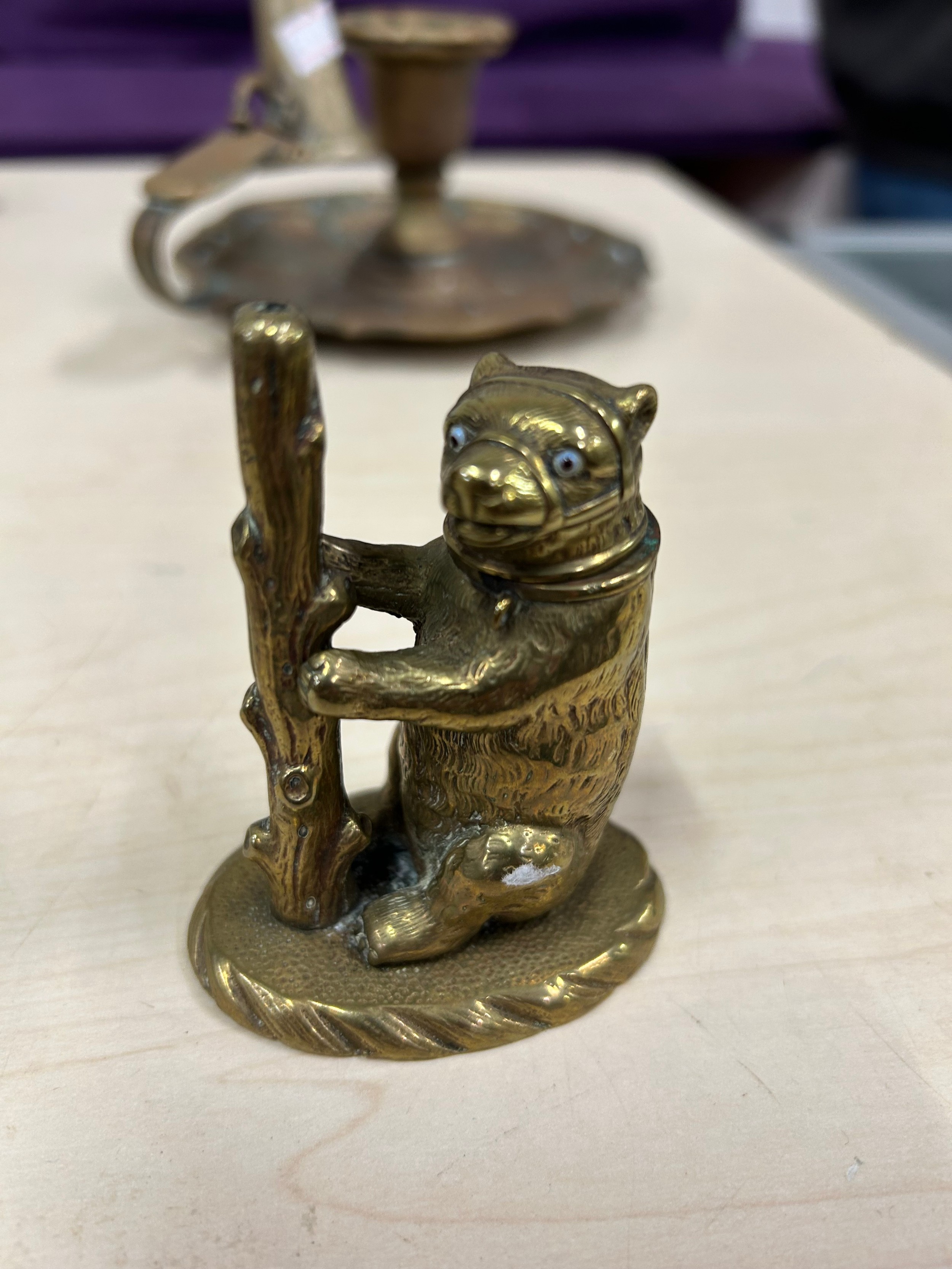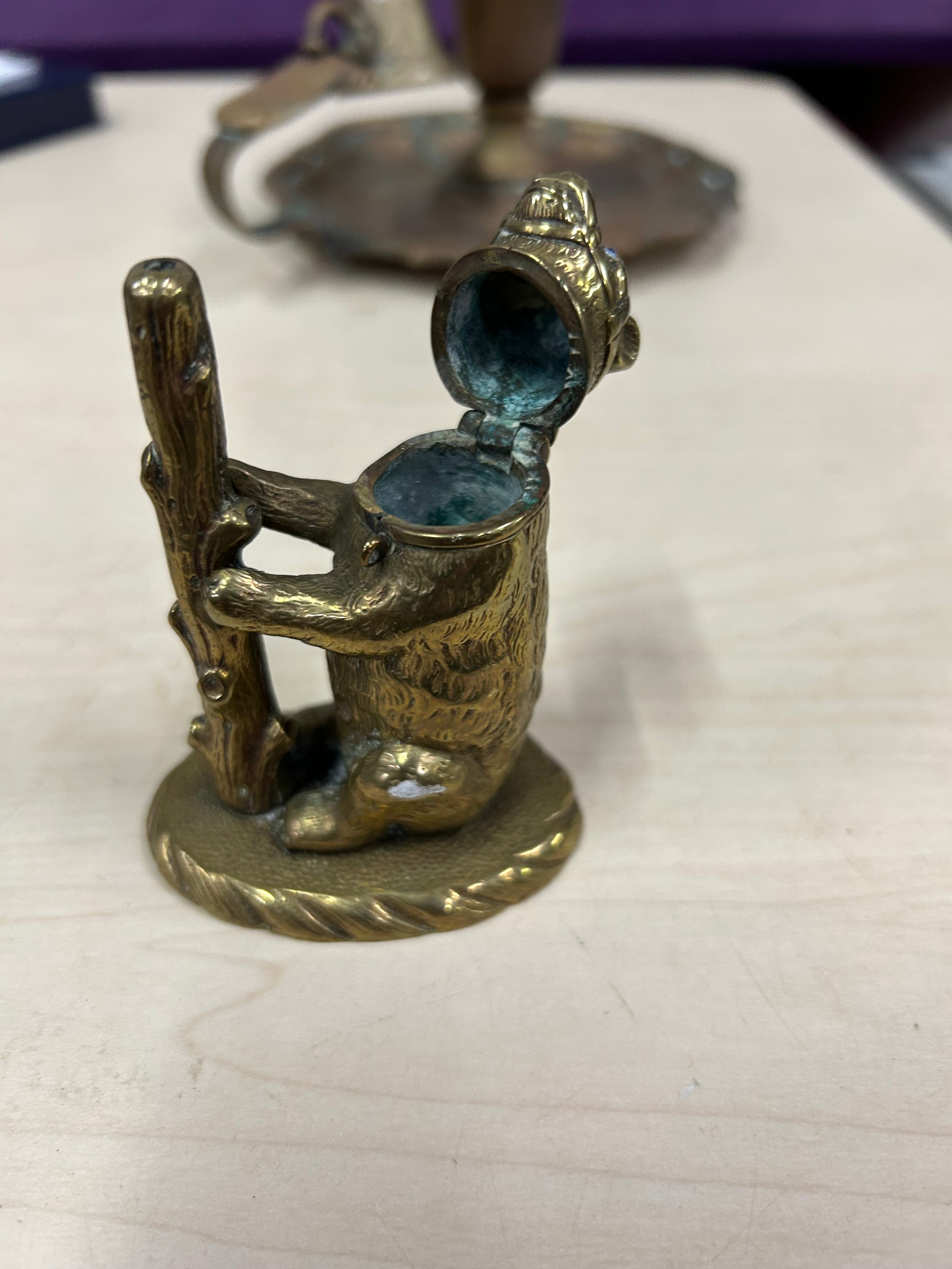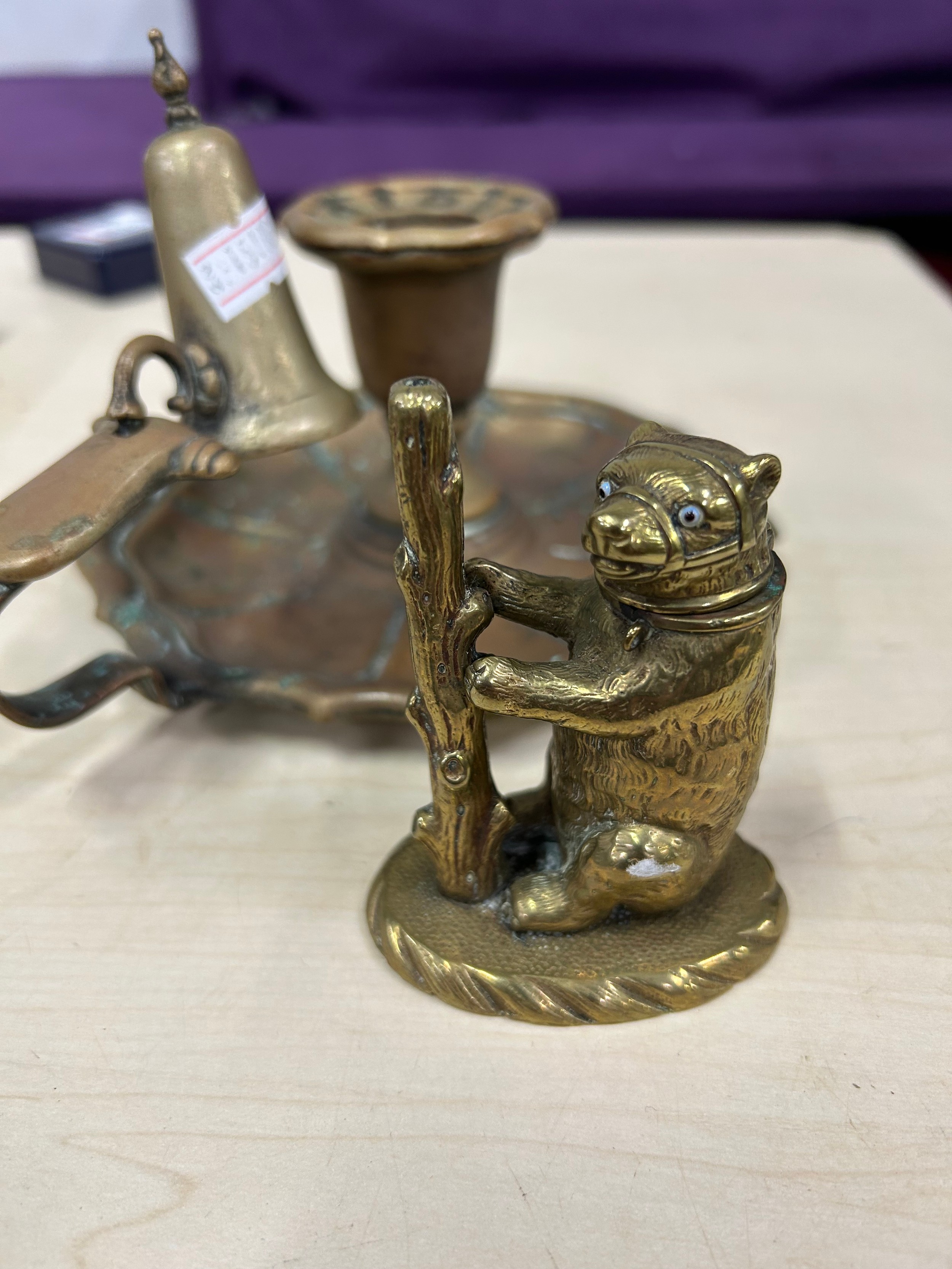 The bear with the ragged staff vesta and a Victorian chamber stick with snuffer