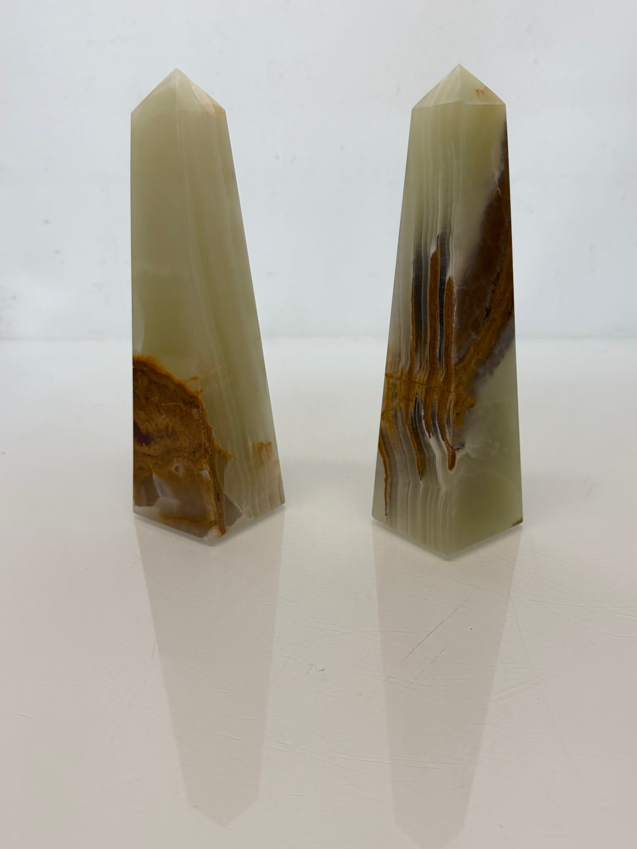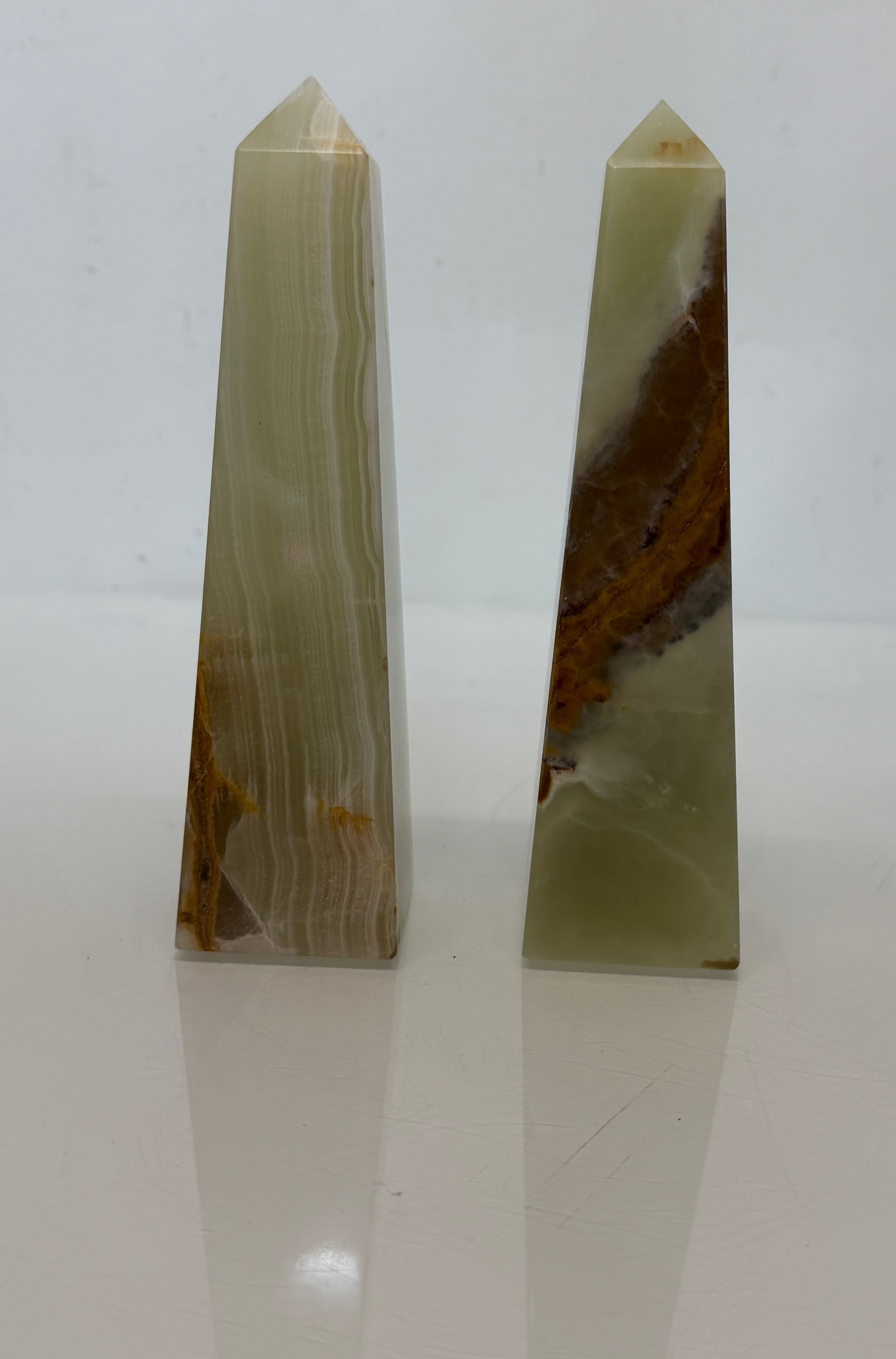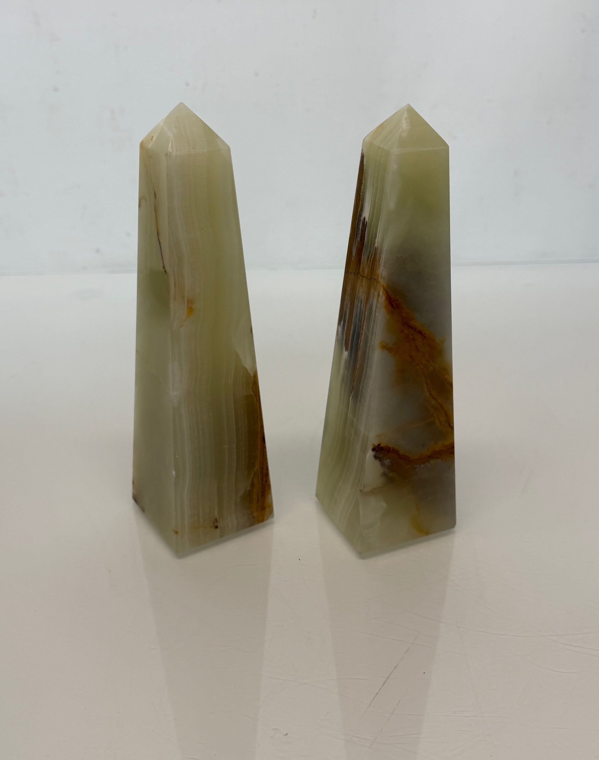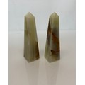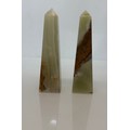 Mid century furnishings, a pair of onyx obelisks 20 cm tall.This lot is available for in-house shipping
