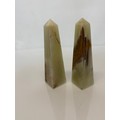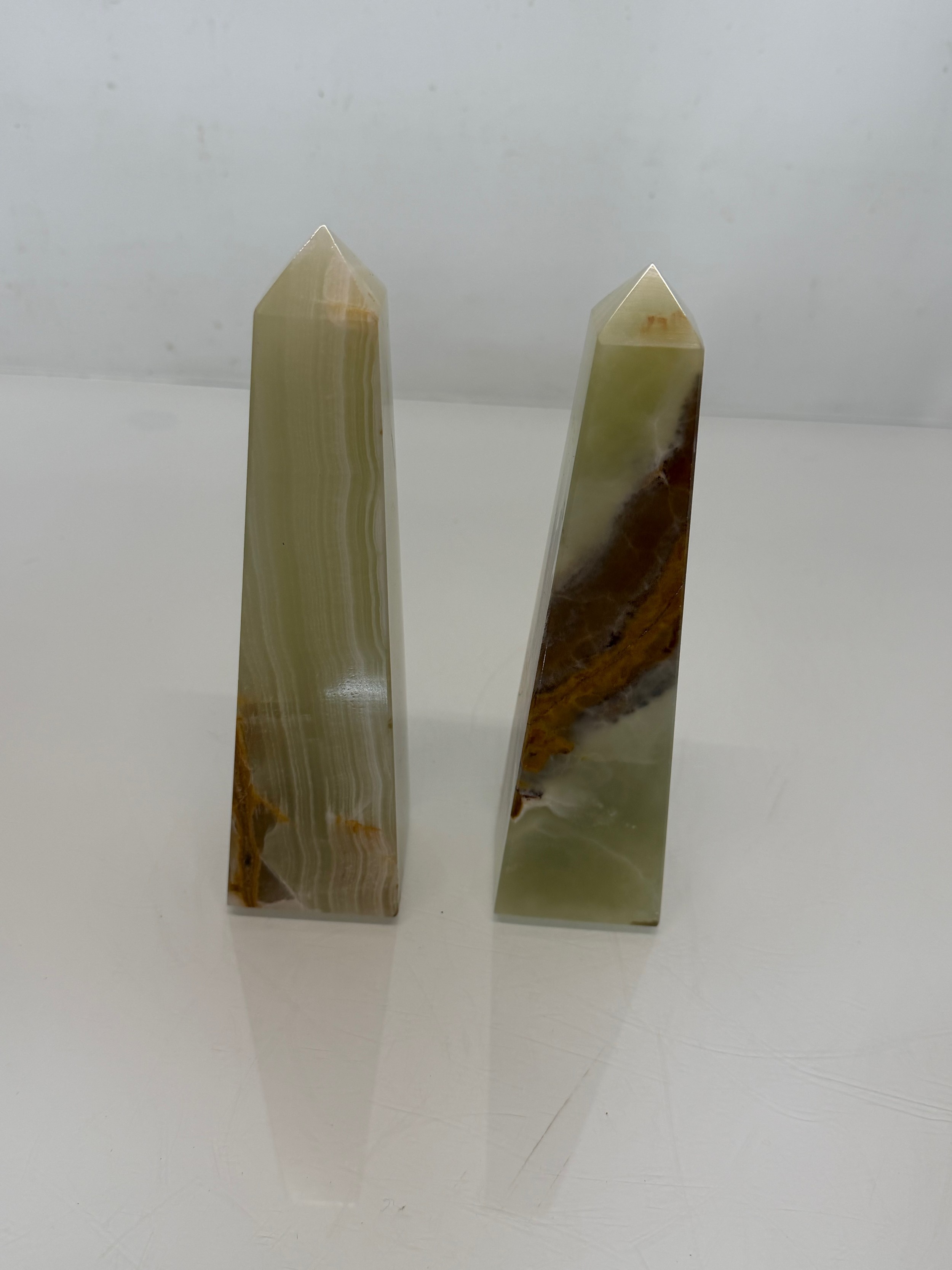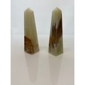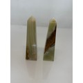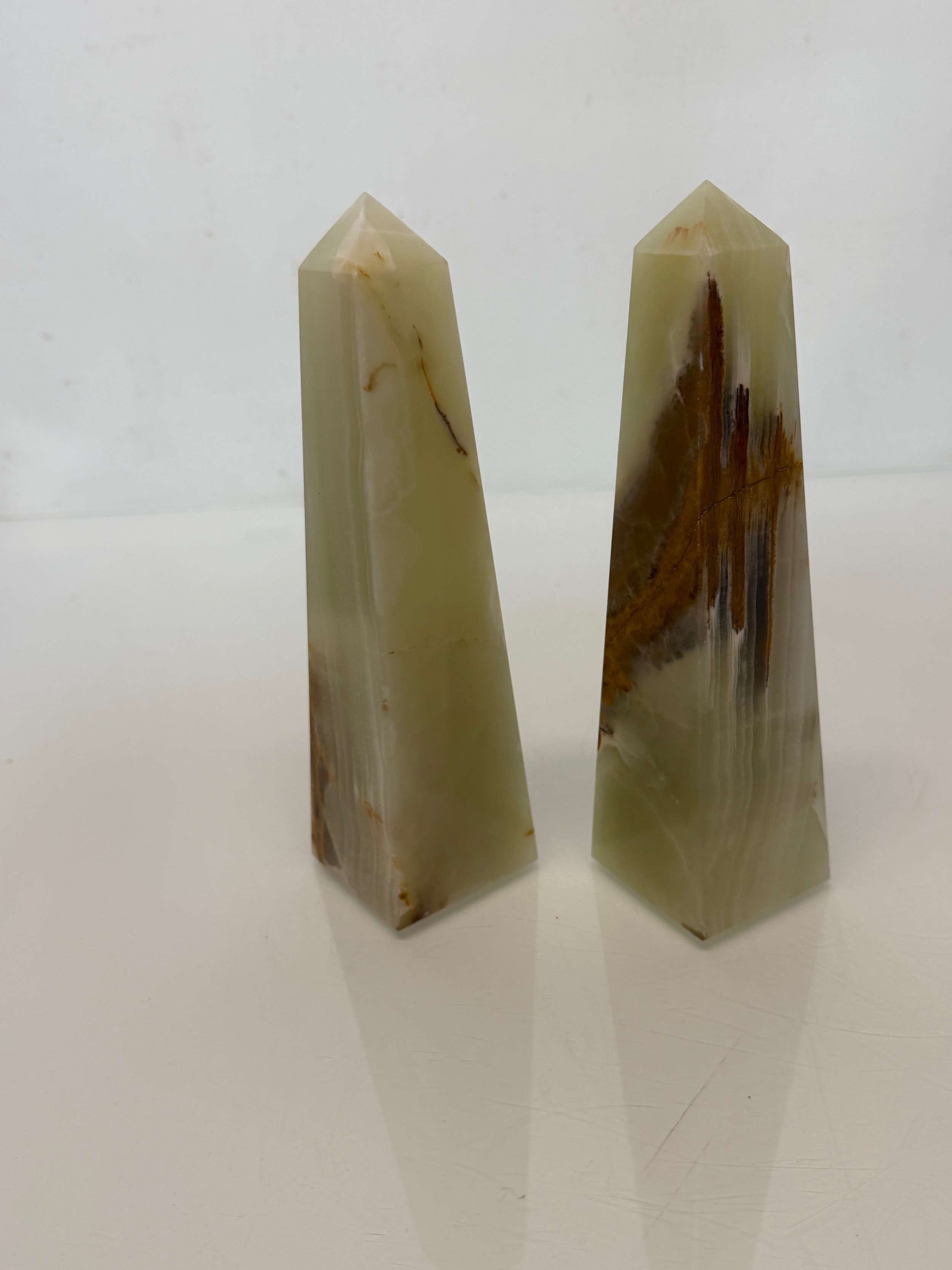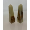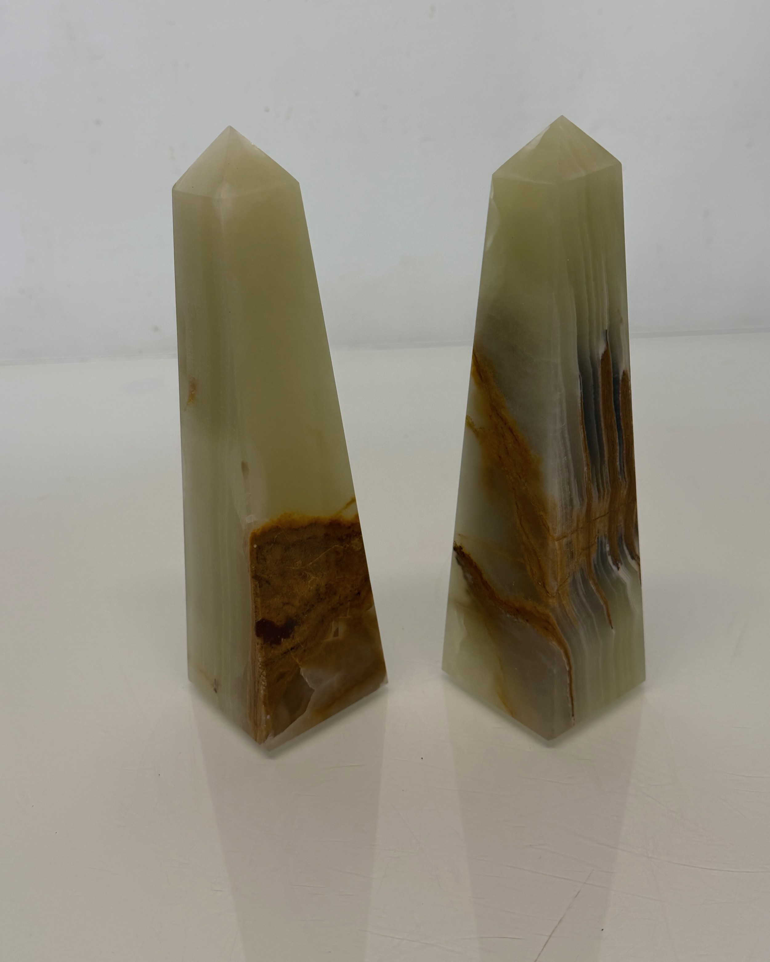 Mid century furnishings, a pair of onyx obelisks 20 cm tall.This lot is available for in-house shipping