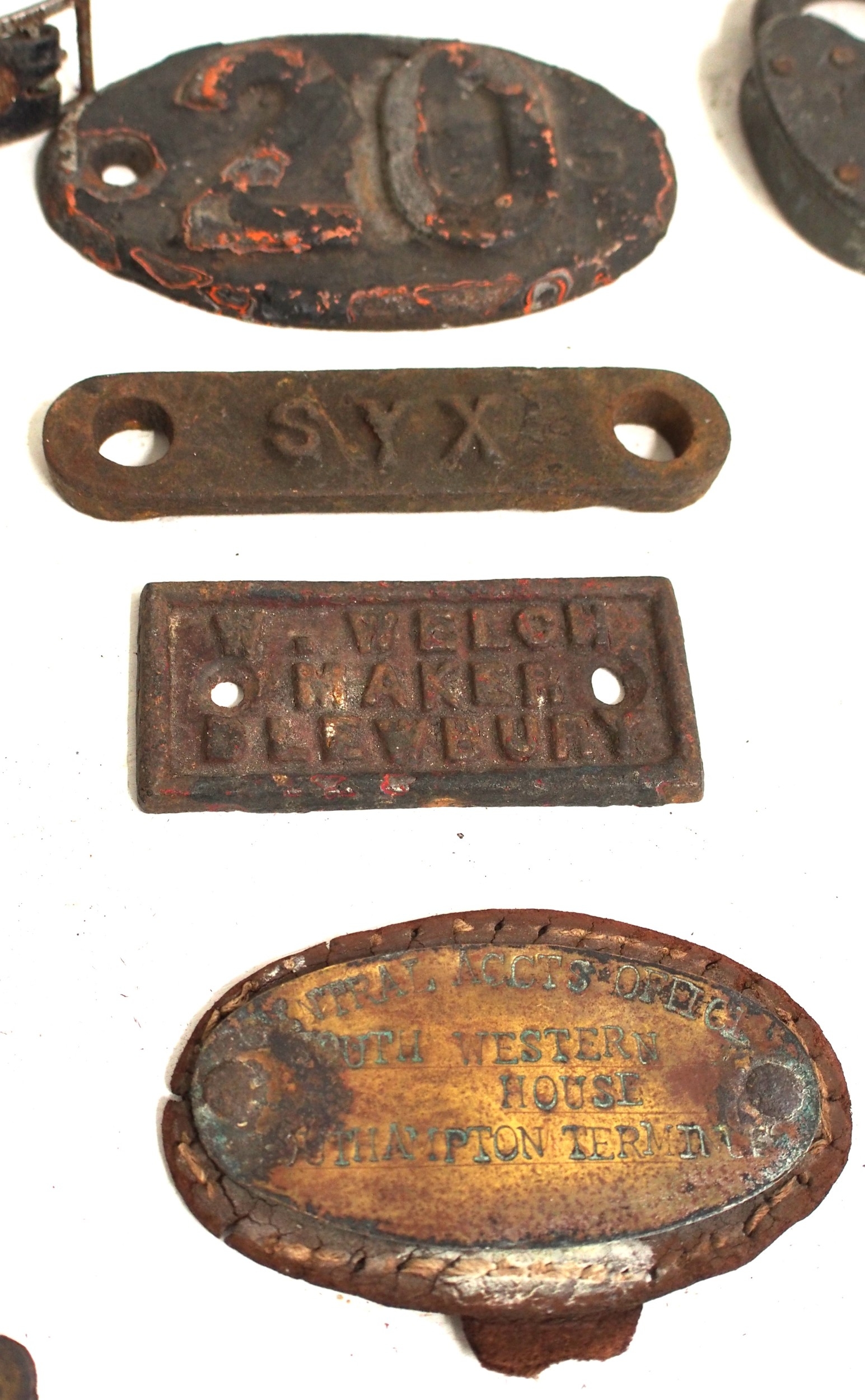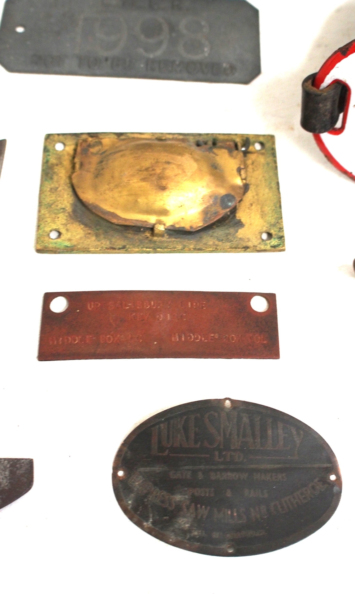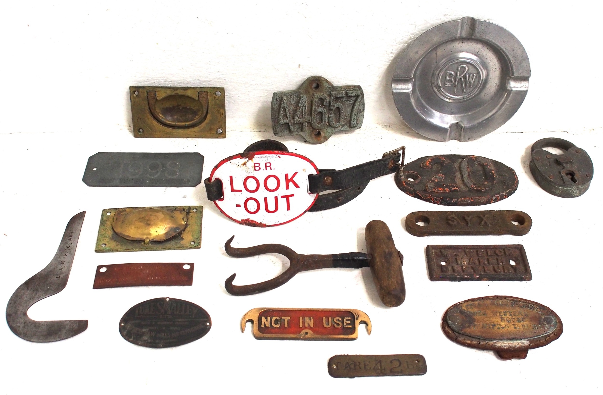 Miscellaneous smalls delve including GWR/BR(W) ATC cast brass NOT IN USE plate, BR(W) ashtray, Look Out armband, document brass "CENTRAL ACCOUNTS OFFICE SOUTH WESTERN HOUSE SOUTHAMPTON TERMINI", NER sack puller, LNER padlock (no key), circuit plate "UP SALISBURY LINE KEY DISC MIDDLE BOX LC MIDDLE BOX TOL", Luke Smalley Ltd plate, LNER gauge, various cast plates as per image. (D2X) (Dispatch by Mailboxes/Collect from Banbury Depot)