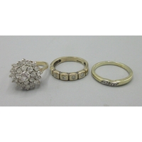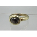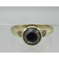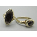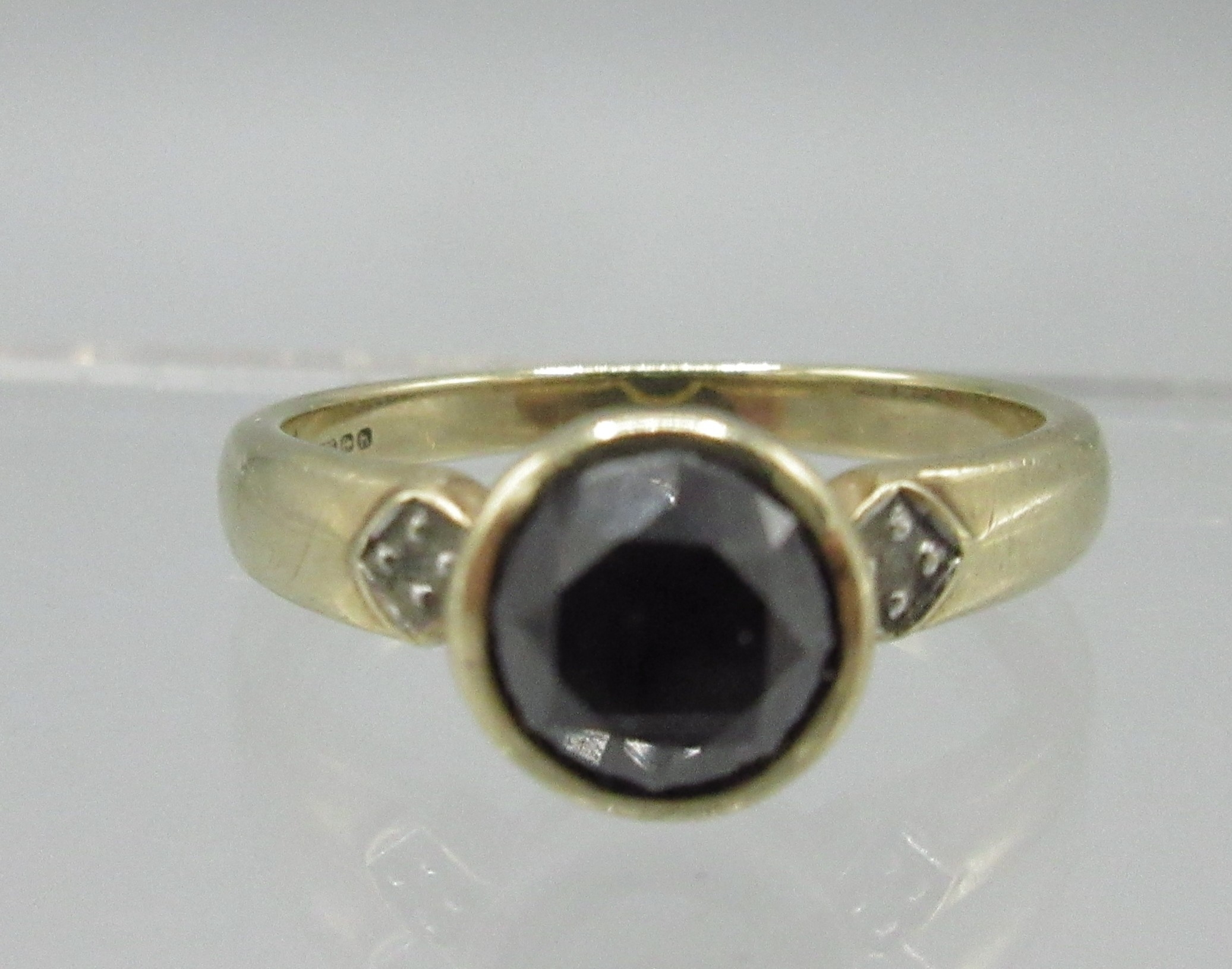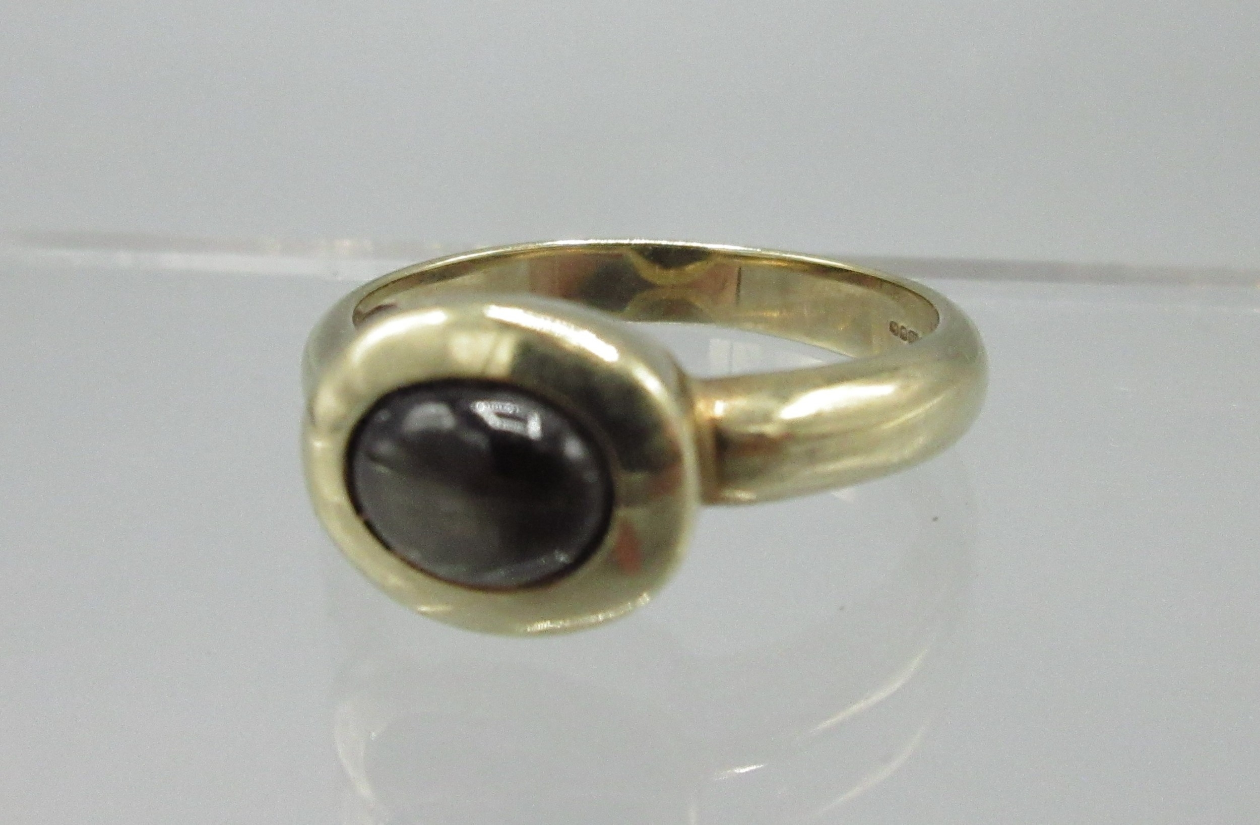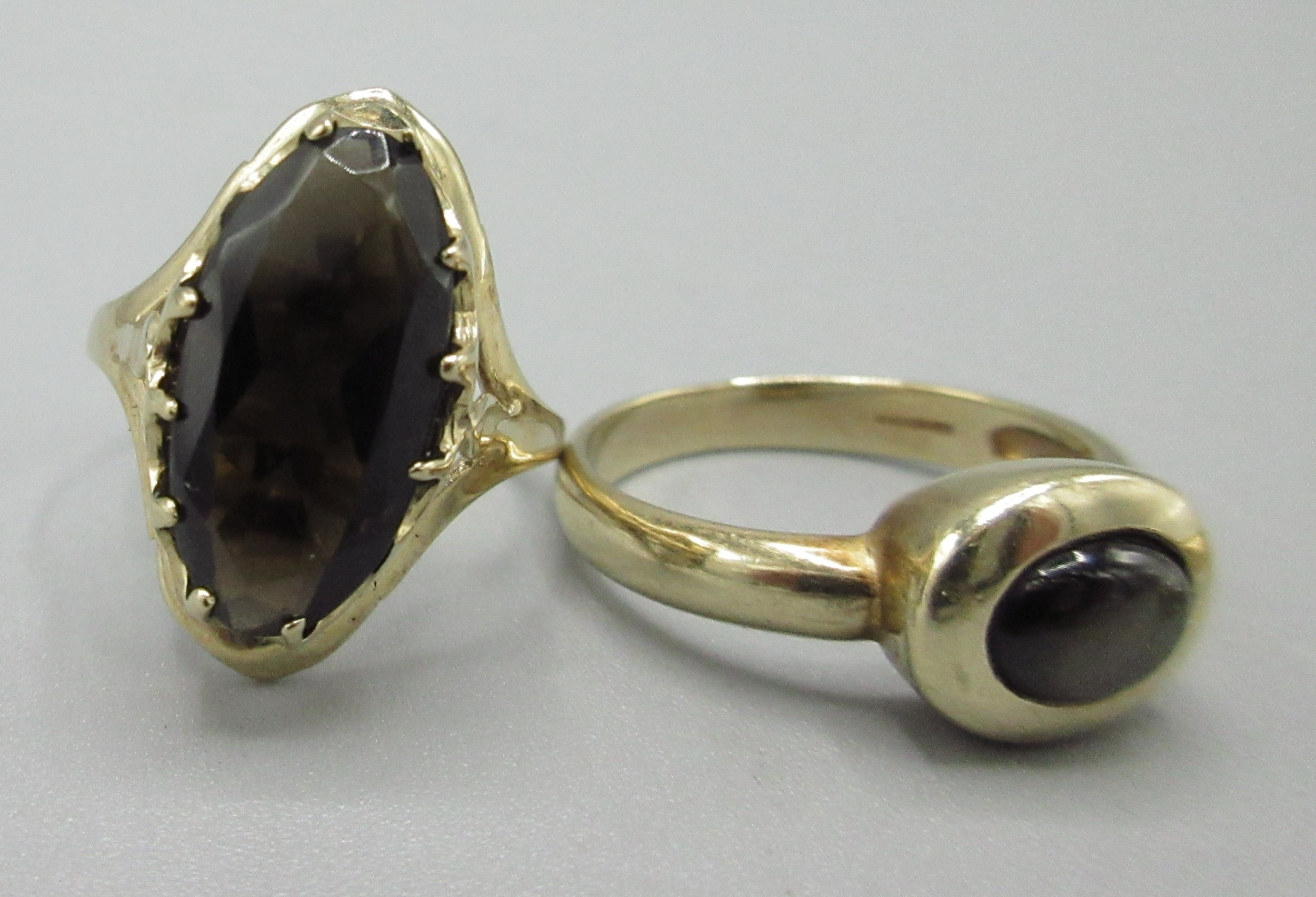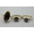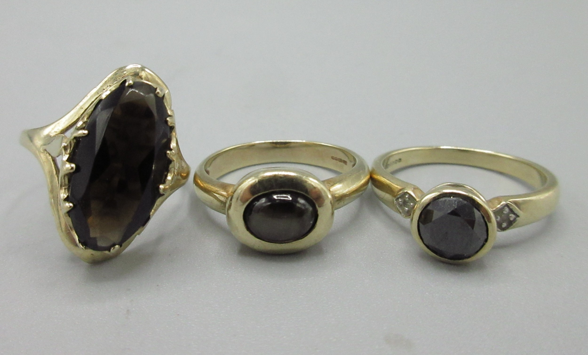 9ct yellow gold cocktail ring set with smoky quartz, stamped 375, size O, 9ct yellow gold ring set with cabochon grey star sapphire, stamped 375, size N, 9ct yellow gold ring set with black moissanite flanked by diamond chips, stamped 375, size N, 9.2g