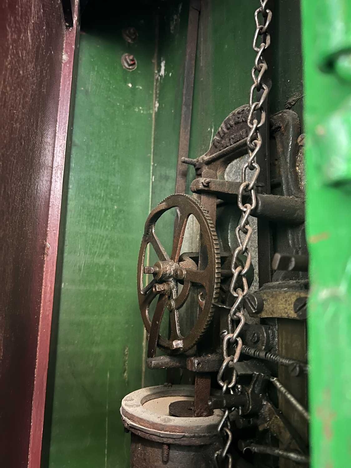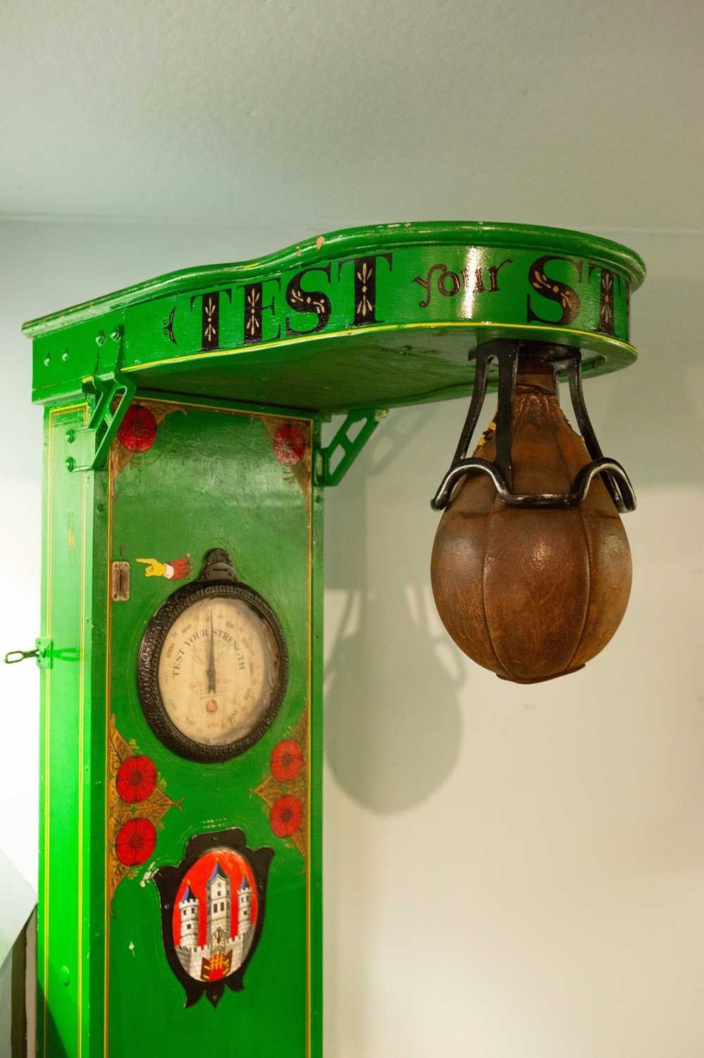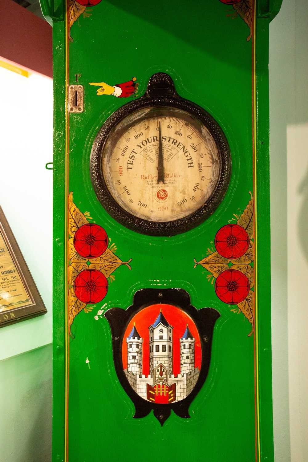 ± Penny-in-the-slot Test Your Strength machine. An early 20th Century wooden 'Test Your Strength machine' by Mills with a Ruffler & Walker strength force-meter, H 192cm. Please note that all lots in this auction from Flambards are subject to an additional standard rated VAT charge of 20% on the hammer price This item was from Flambards, the iconic Cornish institution which sadly closed its doors in November 2024. Lays Auctioneers proudly hosted the contents sale back in March 2025, and unexpectedly have some final lots for sale in this antiques sale. A wonderful last chance opportunity to own a piece of local history. The machine is operated by an old penny but we have not been able to test it to ascertain whether it is currently working. The internal mechanism looks to be in very good condition.