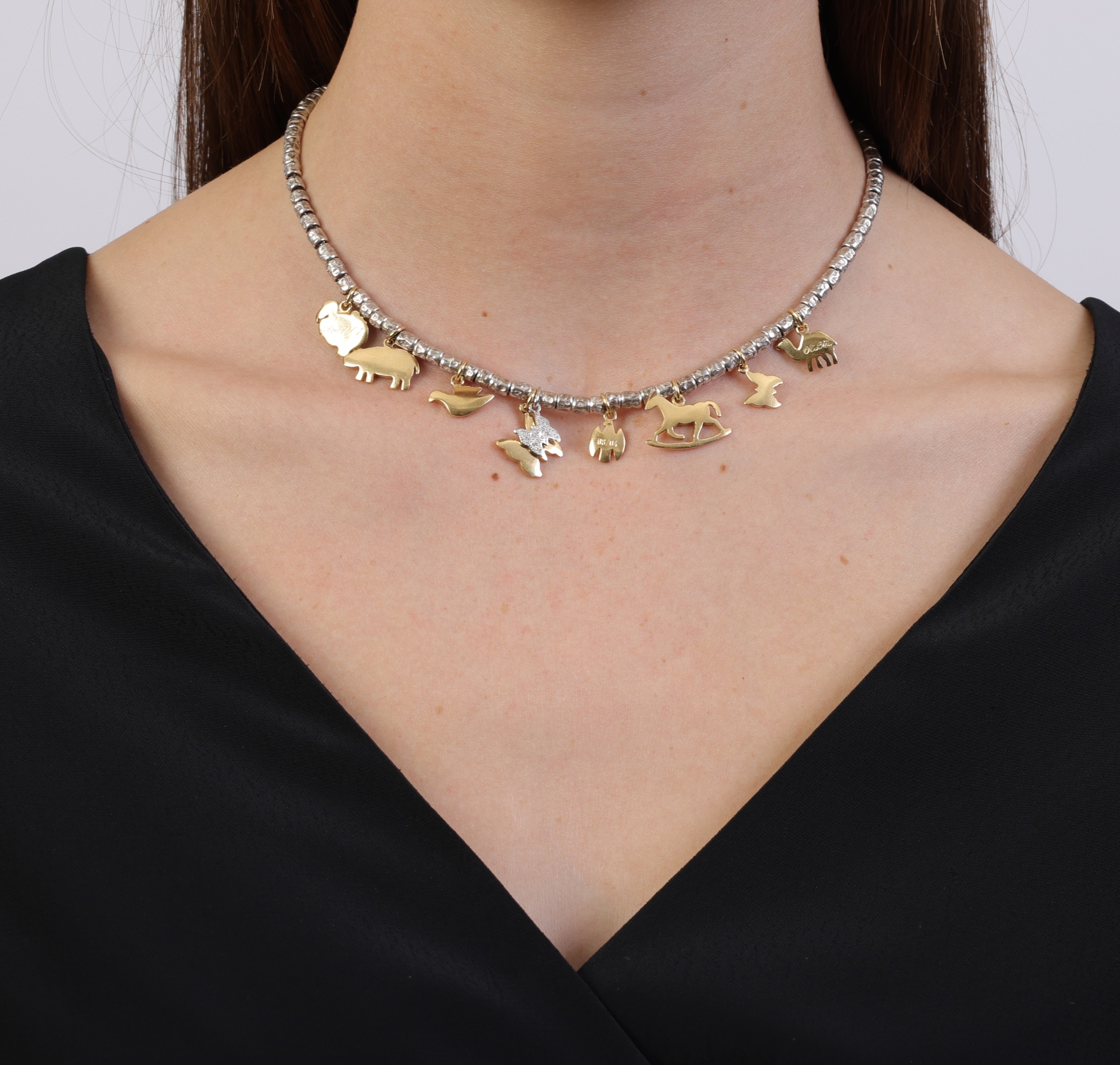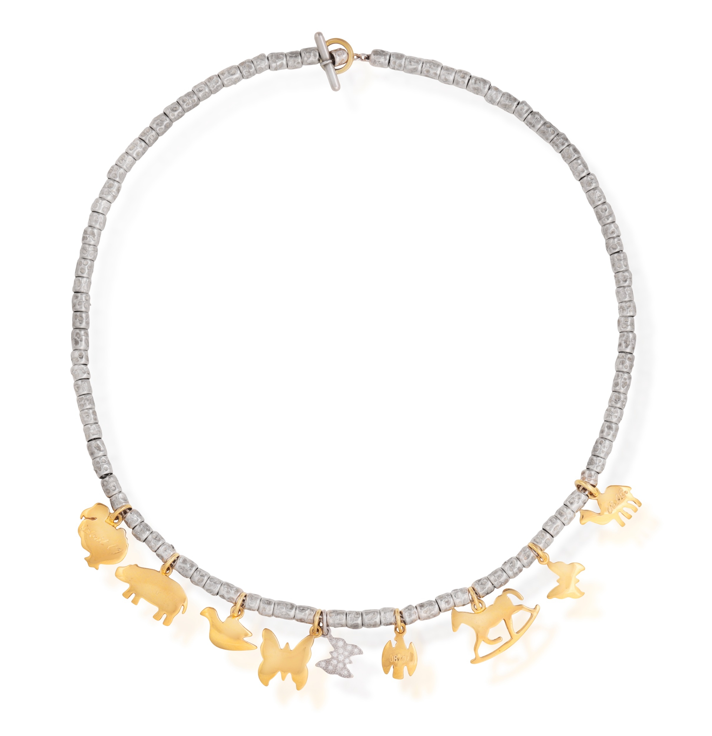 DODO: A DIAMOND, SILVER AND GOLD 'GRANELLI' CHARM NECKLACE The cable-link necklace set with textured silver beads, suspending multiple 18K gold and brilliant-cut diamond charms, mounted in silver and 18K yellow and white gold, length of necklace 40.5cm Pomellato was founded in Milan in 1967 by Pino Rabolini, the heir to a family of goldsmiths, who revolutionised the jewellery world with its easy-to-wear approach. His avant-garde spirit and a keen eye for quality led him to craft versatile and elegant creations. Using vibrant, uniquely cut gemstones in its pieces Rabolini’s vision is embodied in his creations, encouraging customers to mix and match to suit their mood, outfit or occasion. Pomellato soon emerged as a fashion-forward brand, seamlessly blending traditional Italian craftsmanship with contemporary trends. With each collection, Pomellato’s signature pieces, such as their iconic chain, were reinvented, exploring new links, playful knots, and even carefully designed hidden locks. Always looking for innovation, in 1994, Pomellato launched the Dodo brand, naming it after the extinct bird of Mauritius, to highlight the importance of environmental awareness. Dodo jewellery symbolise self-expression and each charm crafted with a single gram of gold, is shaped in many different motifs that can be combined and collected, such as animals and seashells. Pomellato remains a symbol of modern, everyday luxury, cherished and loved by many worldwide.