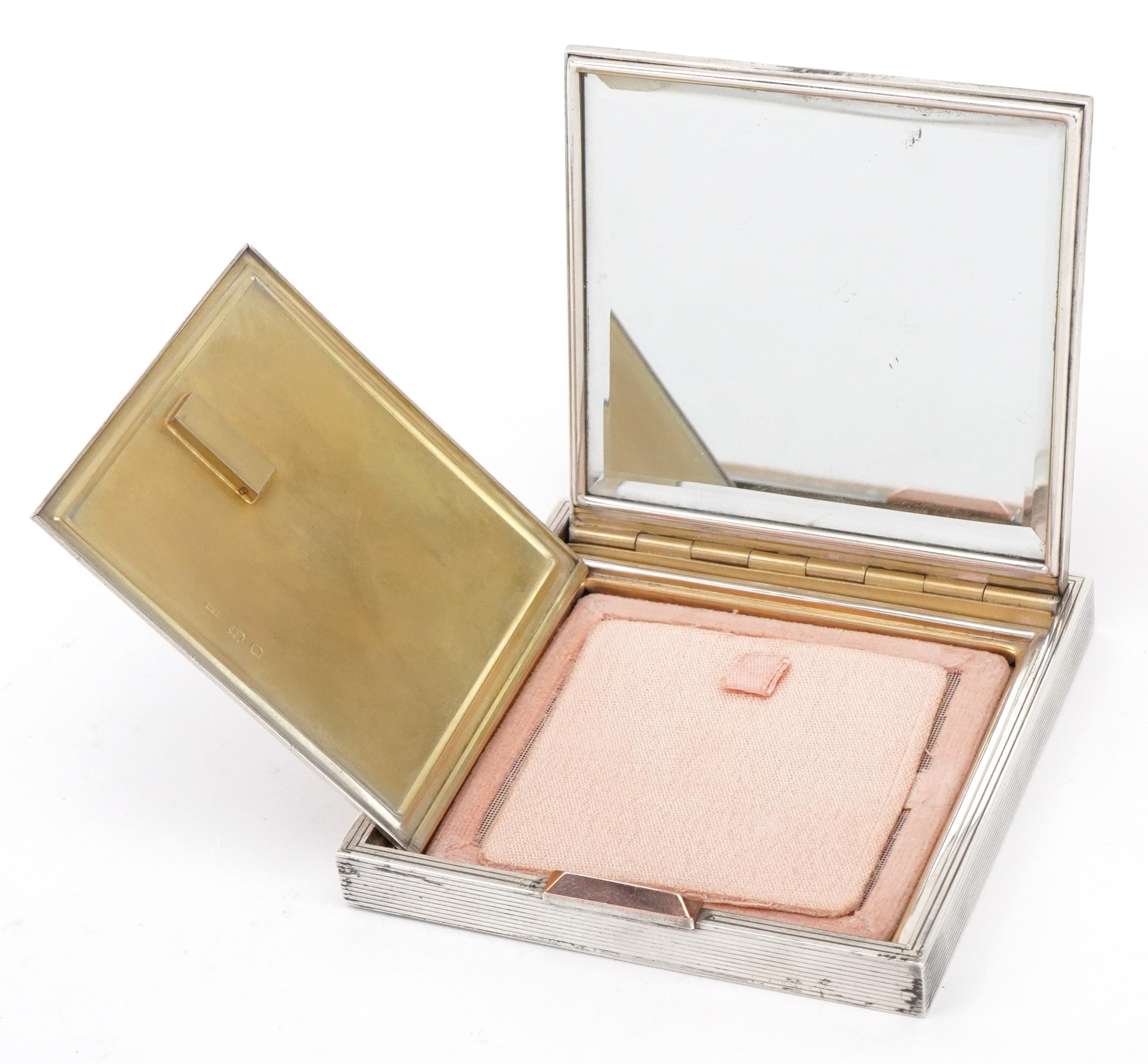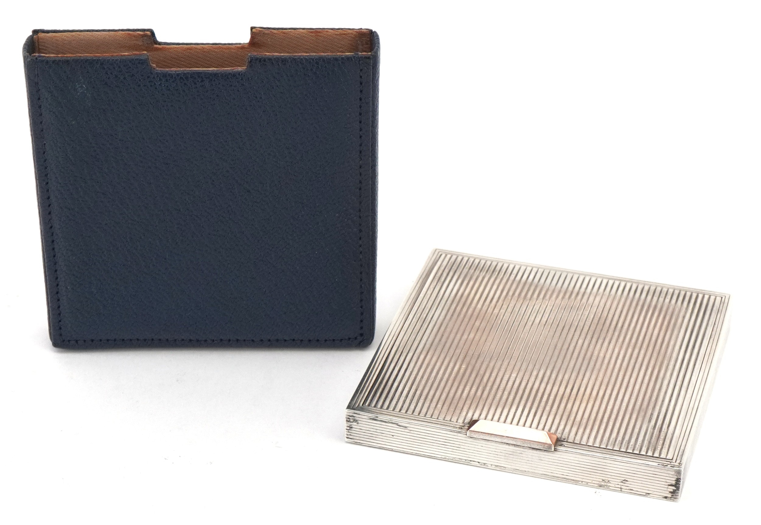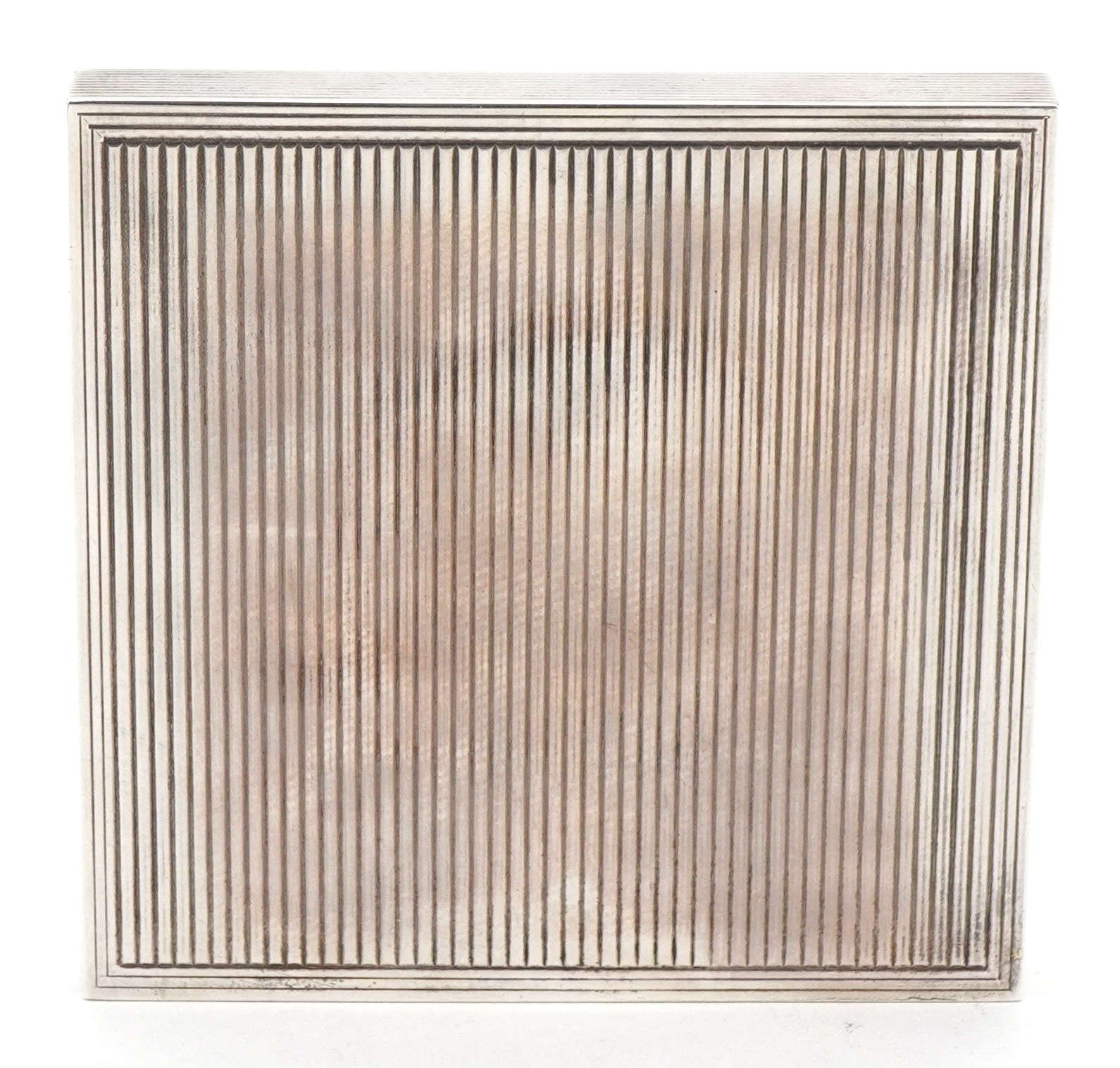 David Sutton & Sons, an Art Deco style engine turned silver compact, London circa 1946-1951, 7.5cm x 7.5cm, 191.4g, with a fitted leather slip case.