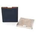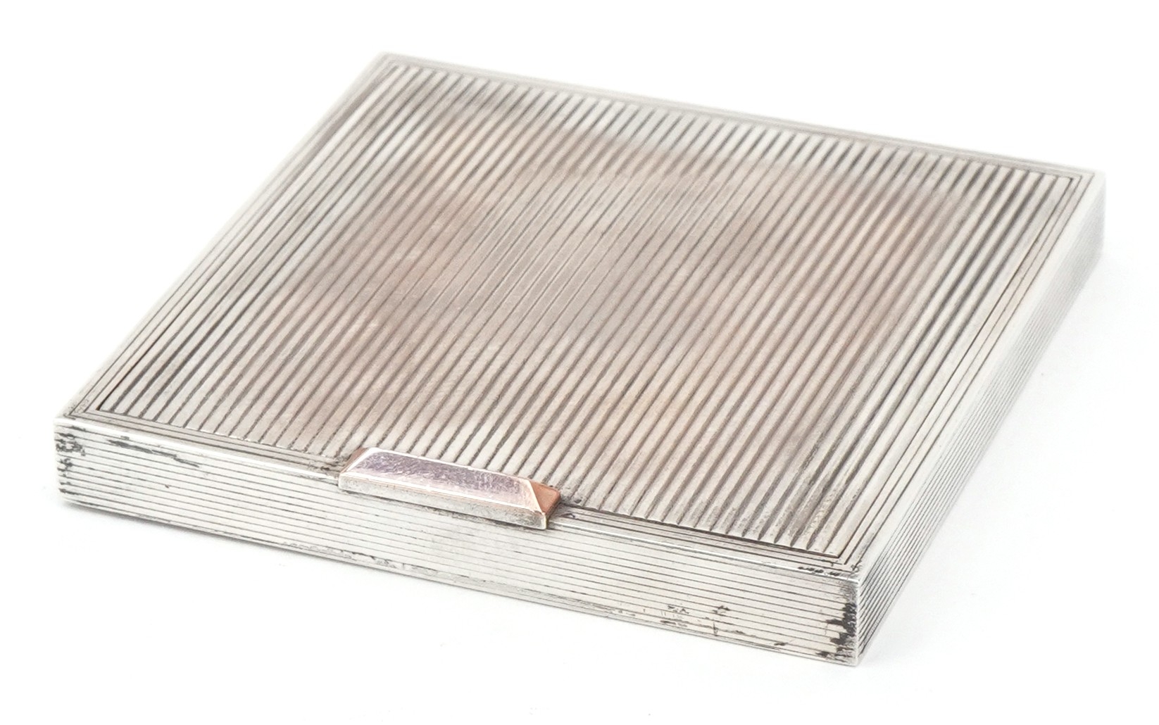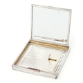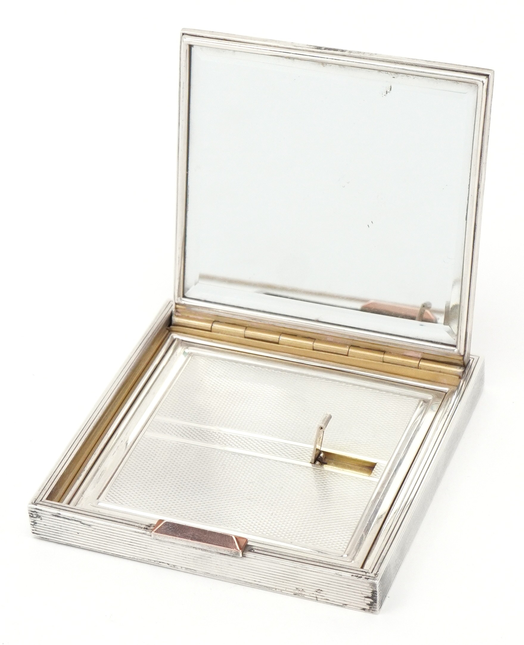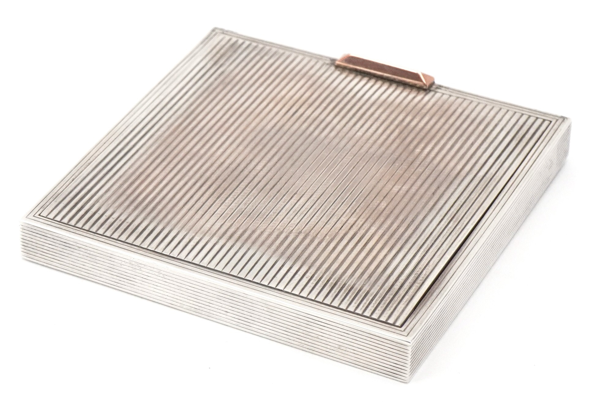 David Sutton & Sons, an Art Deco style engine turned silver compact, London circa 1946-1951, 7.5cm x 7.5cm, 191.4g, with a fitted leather slip case.