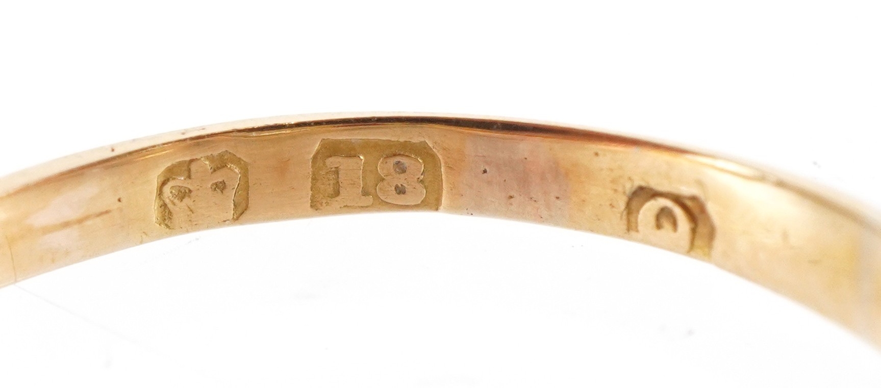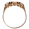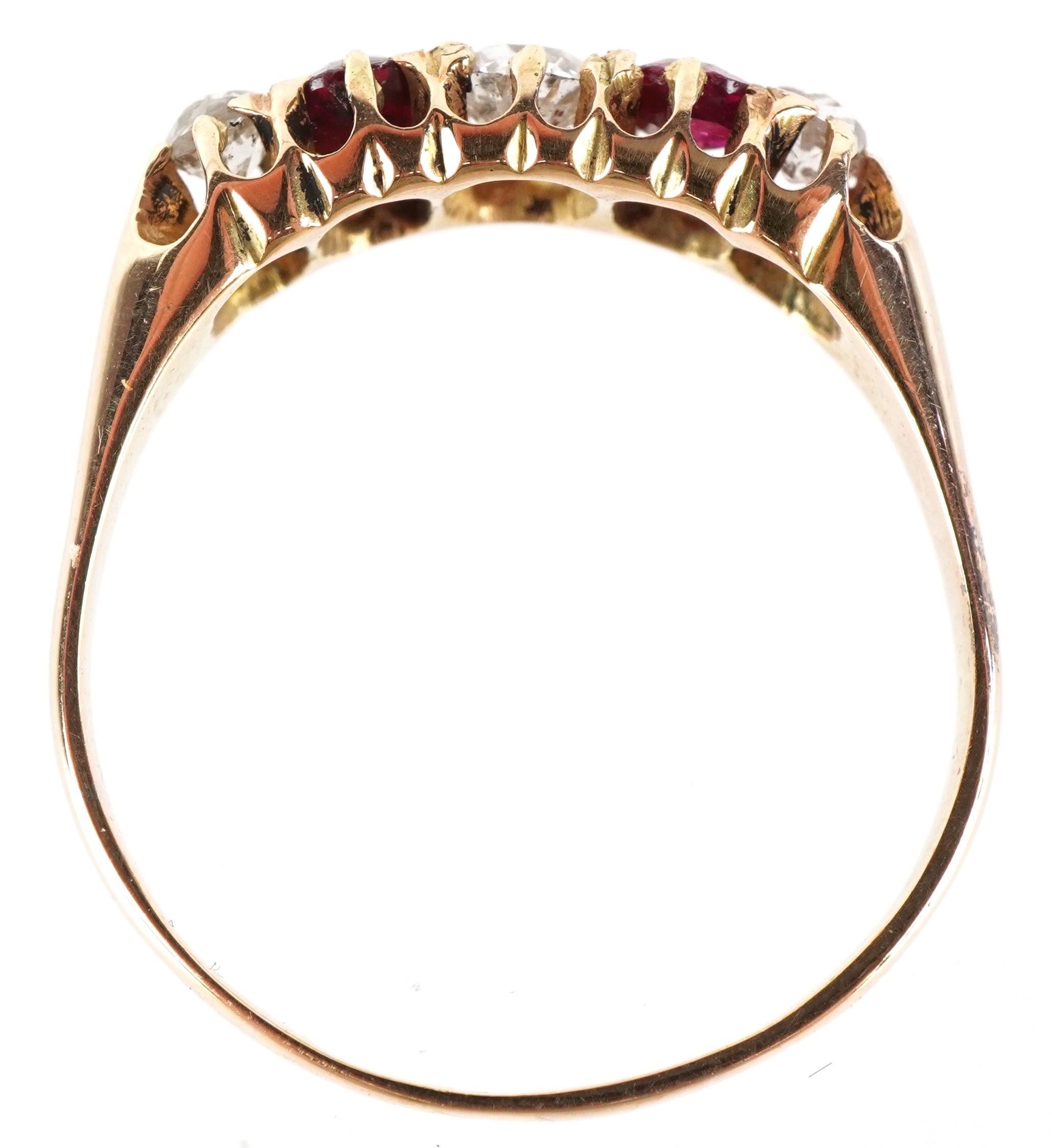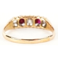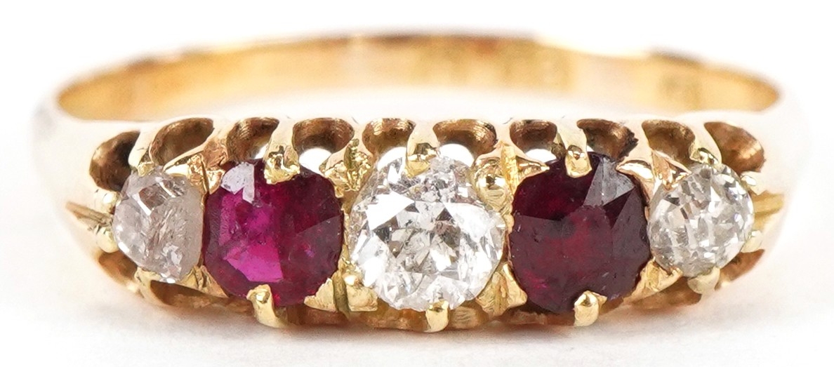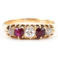 An 18ct gold diamond and pink spinel five stone ring, size O, 2.4g.