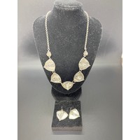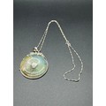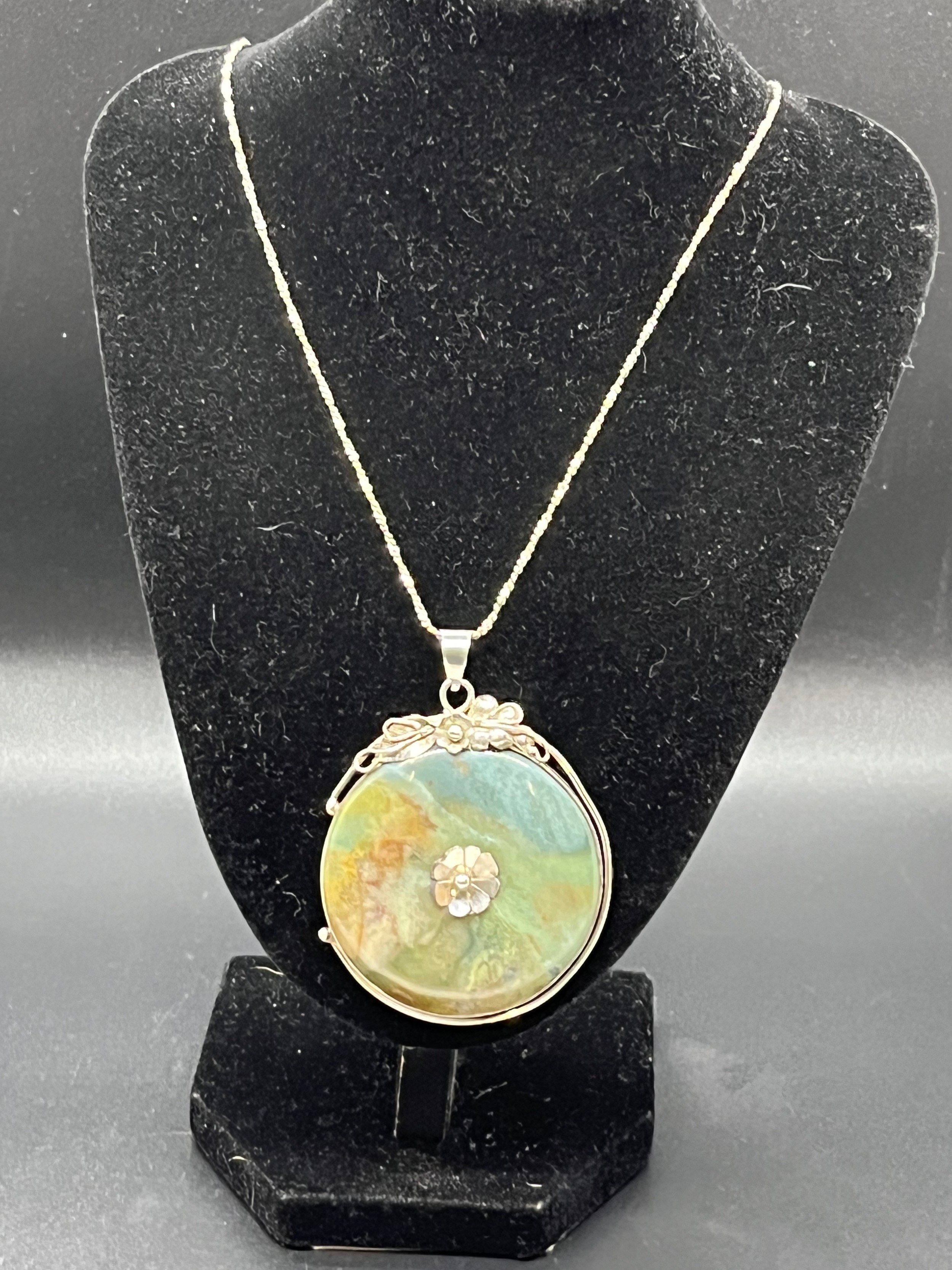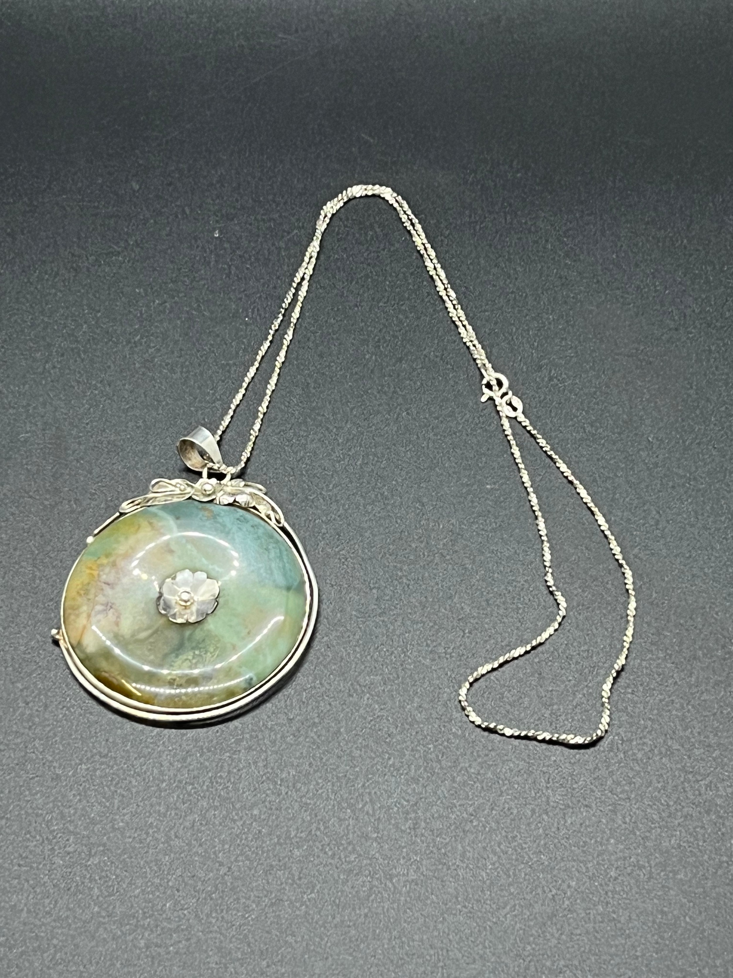 Large Circular Floral Silver Bound (.925) green Onyx type stone Pendant with chain ... 30 grams.