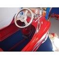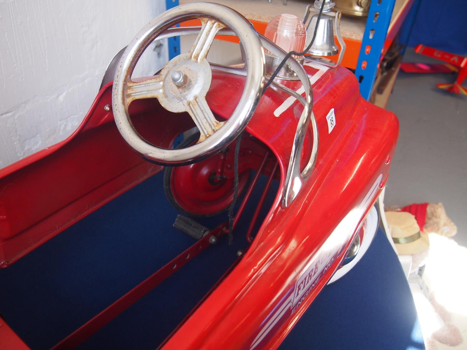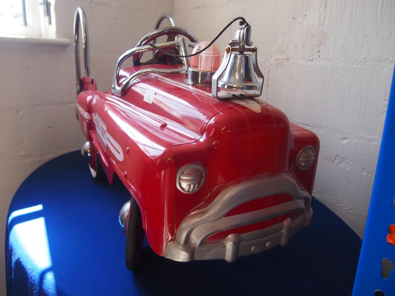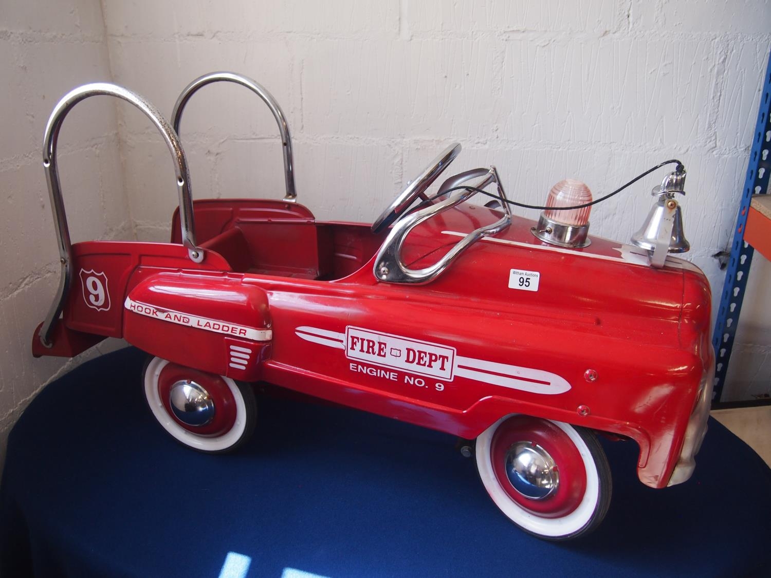 A vintage/retro tin child's sit on fire truck marked fire dept engine no.9