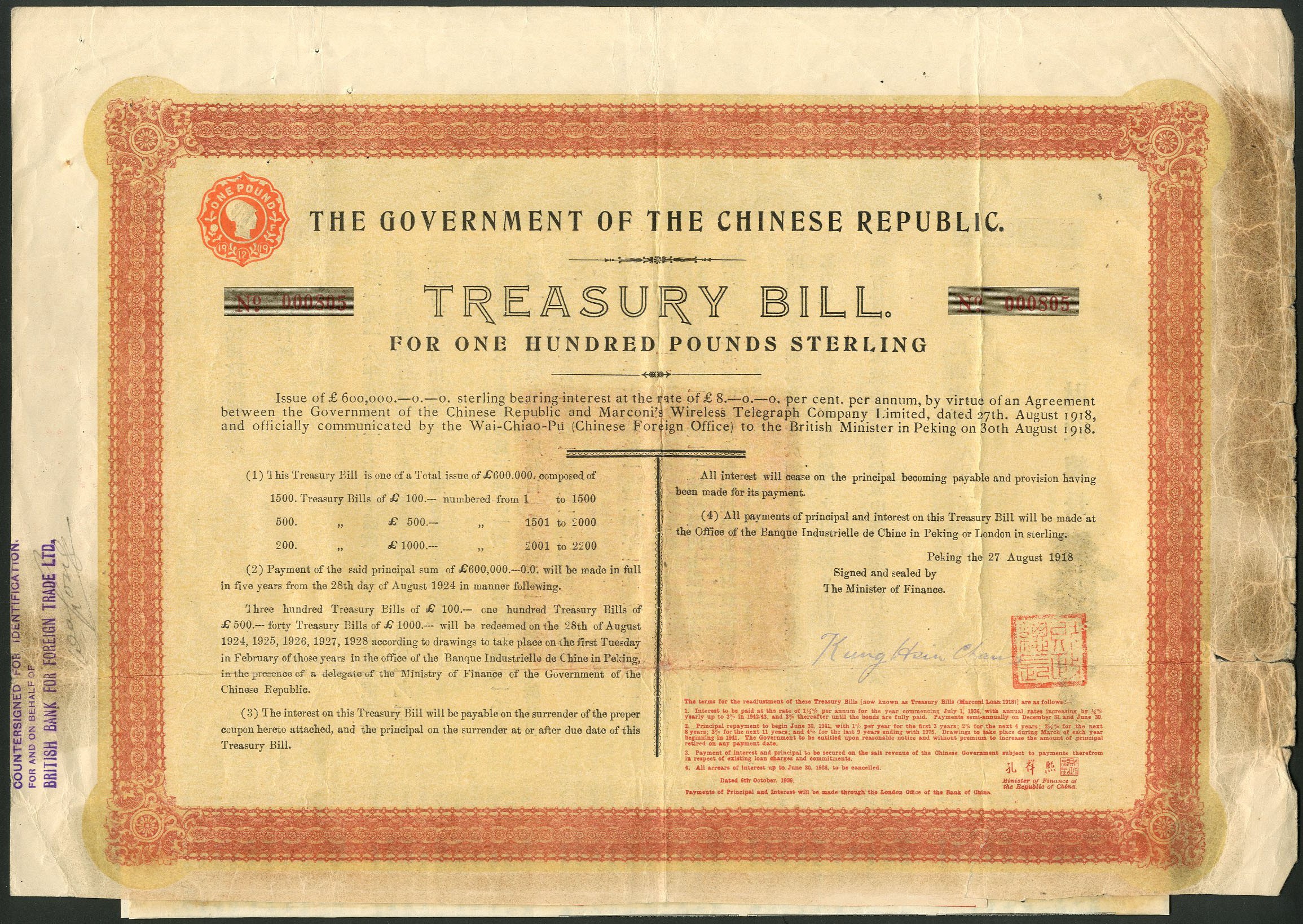 China: 1918, 8% Treasury Bill 'Marconi' Loan, £100 bond, #000805, ornate border, red, yellow underprint, with coupons. Minor repaired right edge tears. VF.