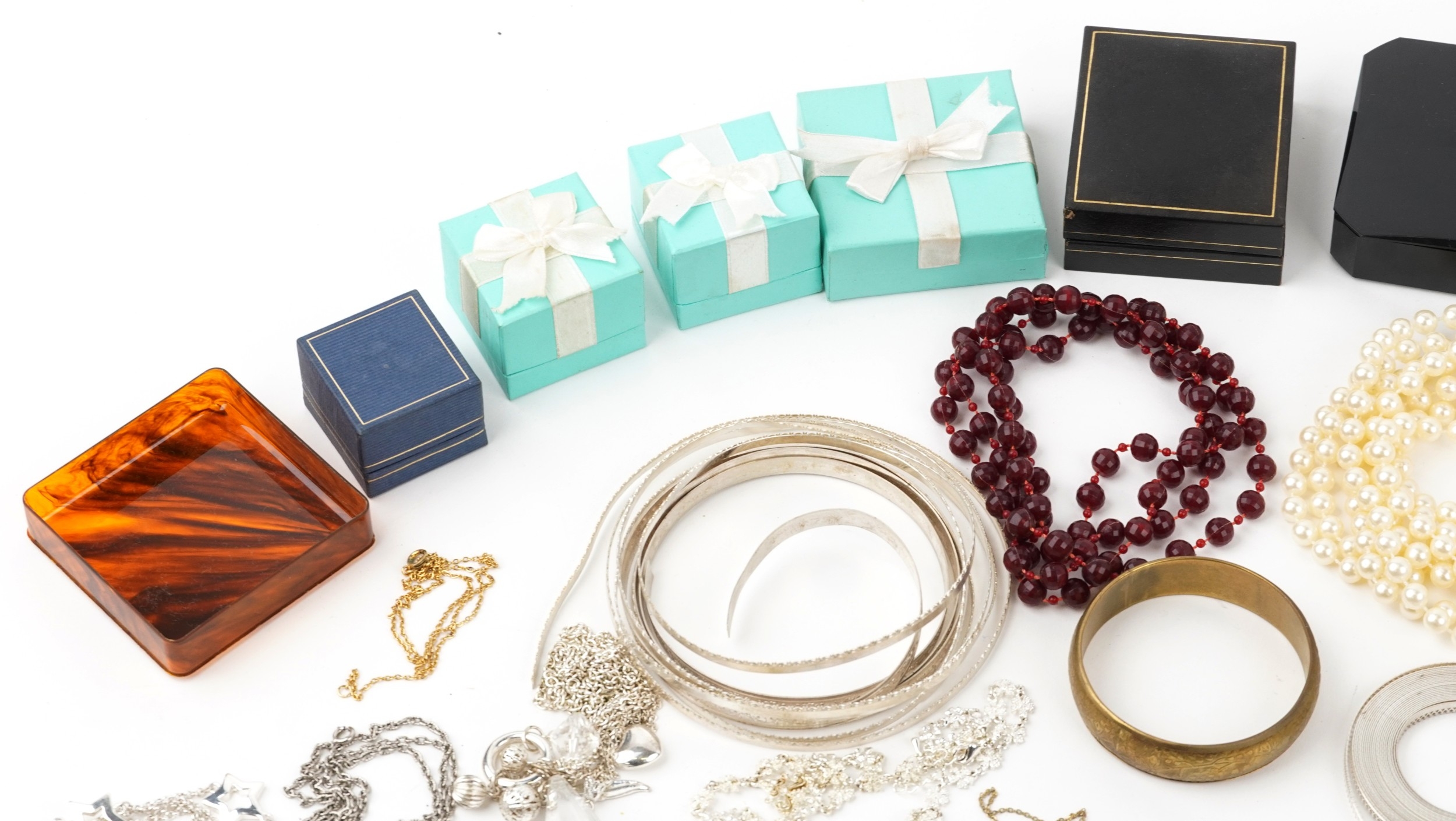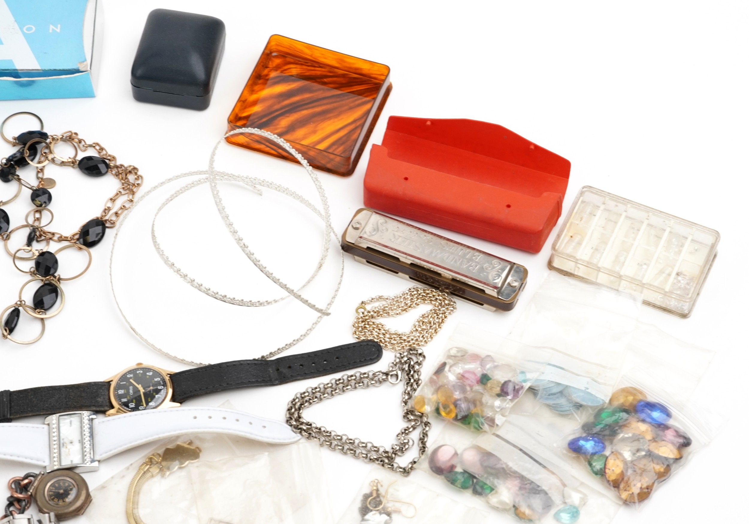 Antique and later jewellery and wristwatches including beaded necklaces, brooches, bracelets, clip on earrings and stud earrings.
