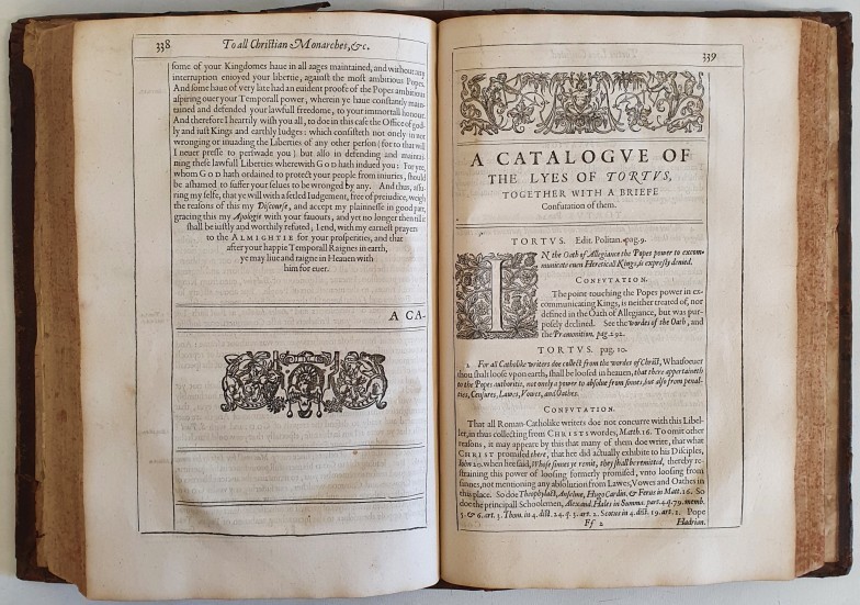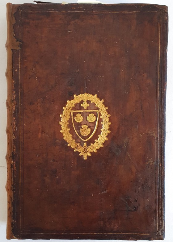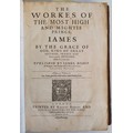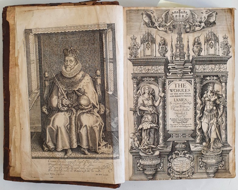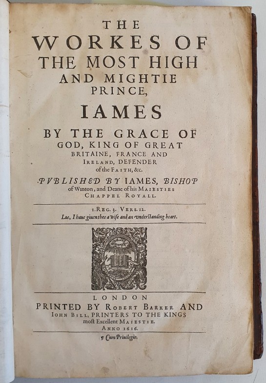 JAMES I, King of England (1566-1625). The Workes Of The Most High And Mighty Prince, James. Published by James, Bishop of Winton and Deane Of His Majesties Chappel Royall. London: Robert Barker and John Bill. 1616. Engraved portrait frontispiece after Simon de Passe, engraved additional title-page by Renold Elstrack, full-page woodcut of the Royal arms, engraved portrait of Charles, Prince of Wales, by Passe, woodcut ornamental head- and tailpieces, historiated initials. Large folio, bound in full calf with very fine gilt coat of arms with three scallop shells surrounded by a wreath of oak leaves and acorns.