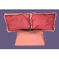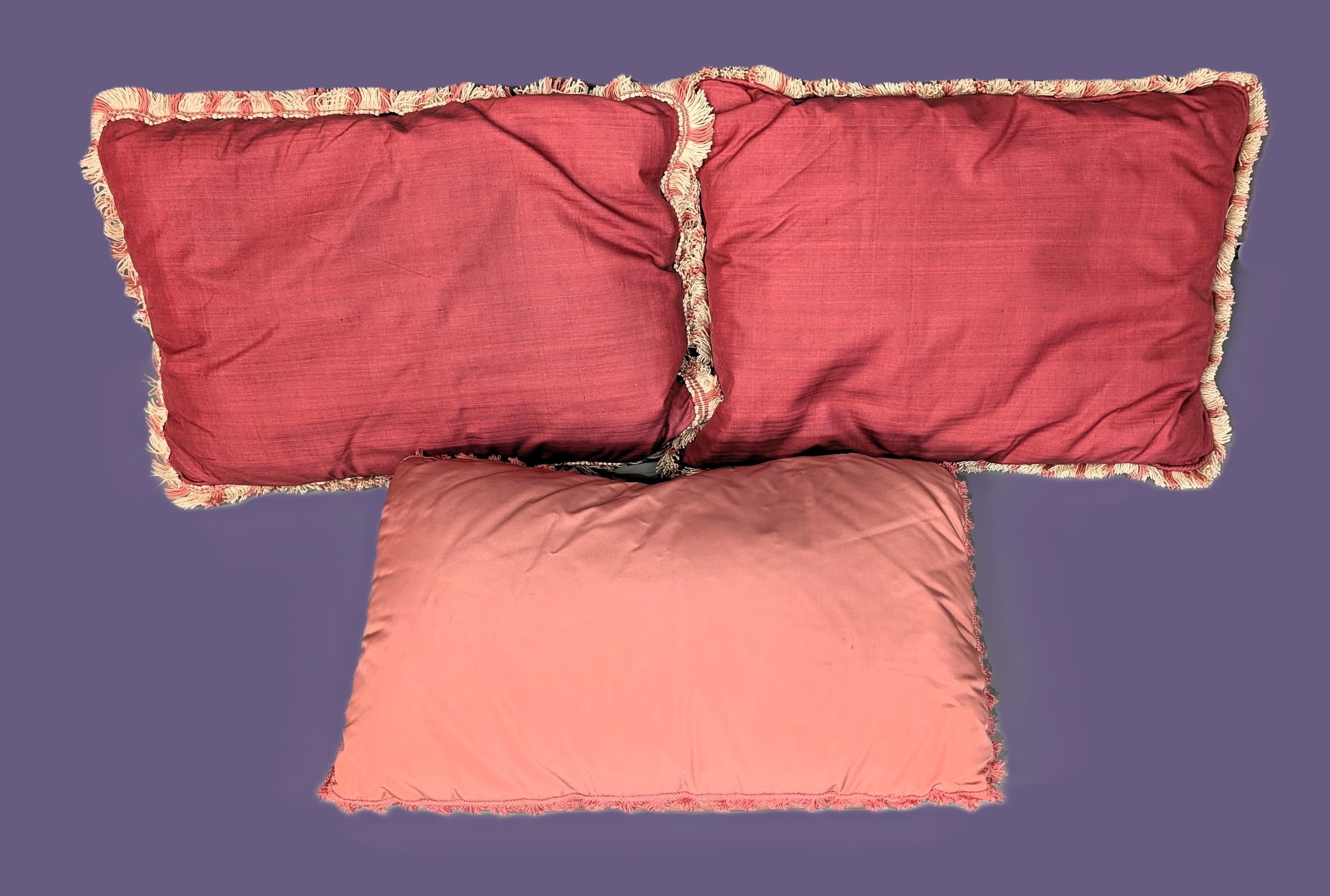 Comprising two rectangular cushions in deep rose silk with cream and pink fringed edging, together with a smaller cushion in a coordinating blush tone with matching fringe trim.