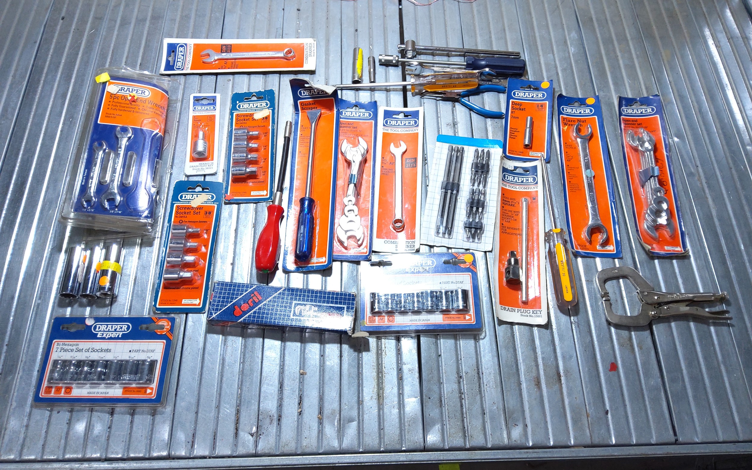 New tools including Draper socket sets, drain plug key and screwdrivers.