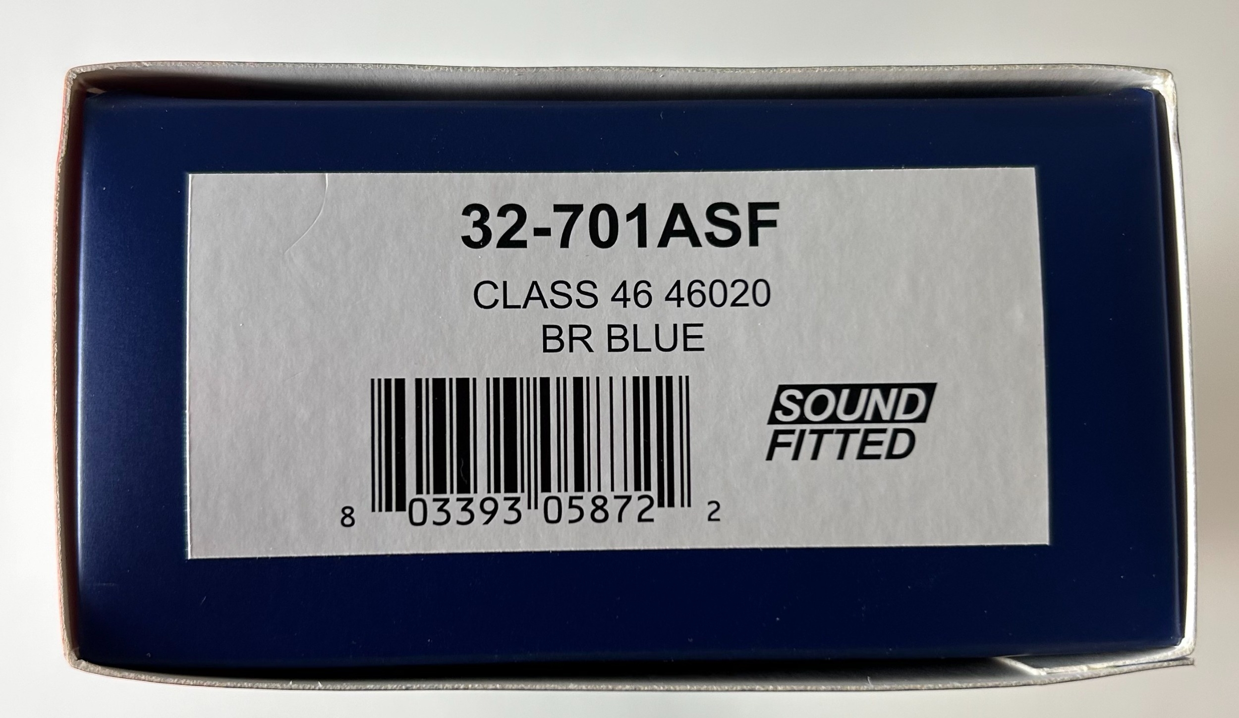 Bachmann Branch-Line OO Diesel-Electric Locomotive. Class 46 46020 (32-701ASF) Sound Fitted. In BR Blue livery. Boxed. Contents looks to be as new.