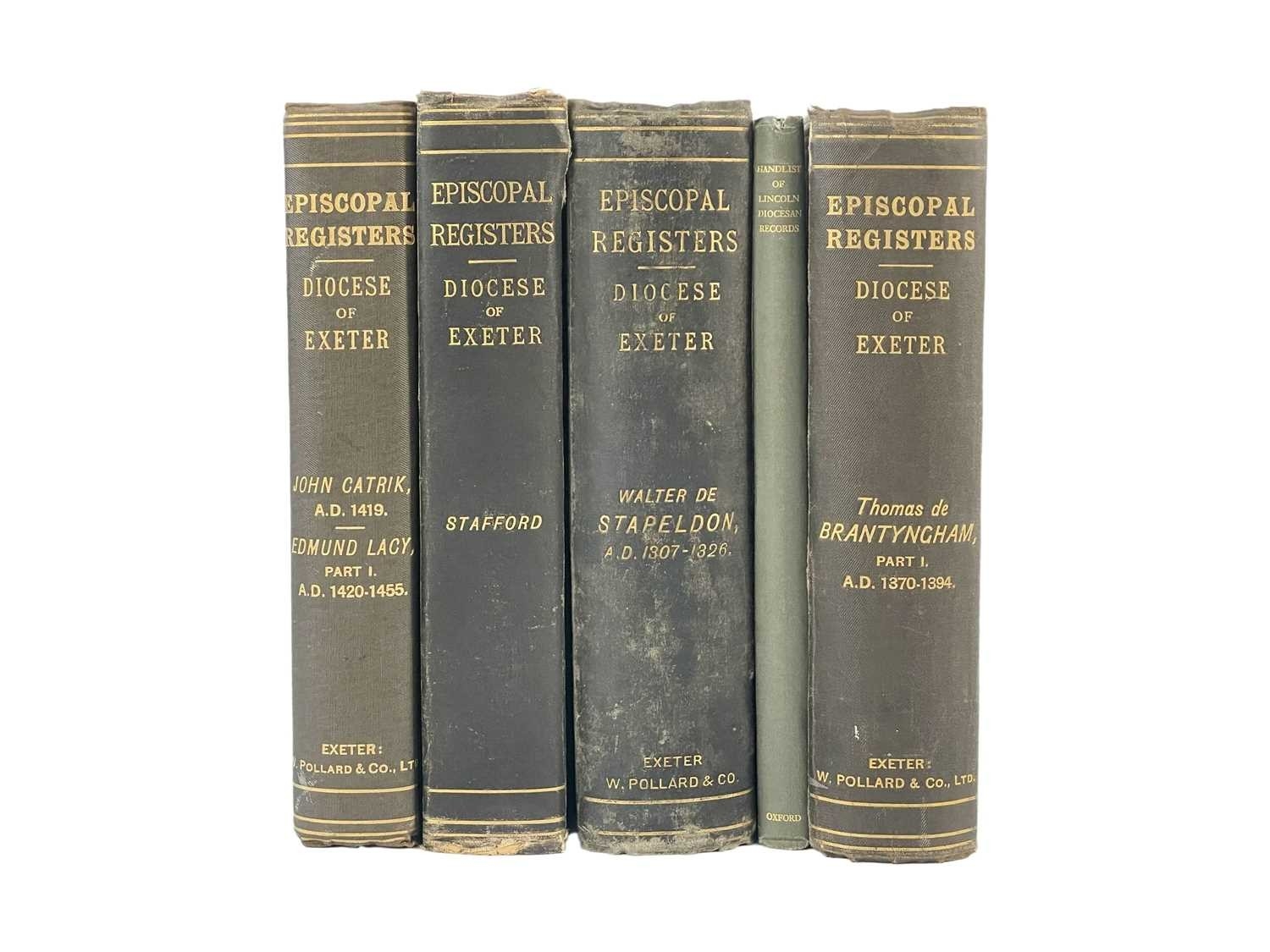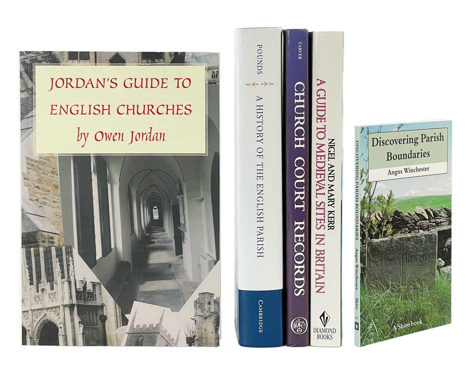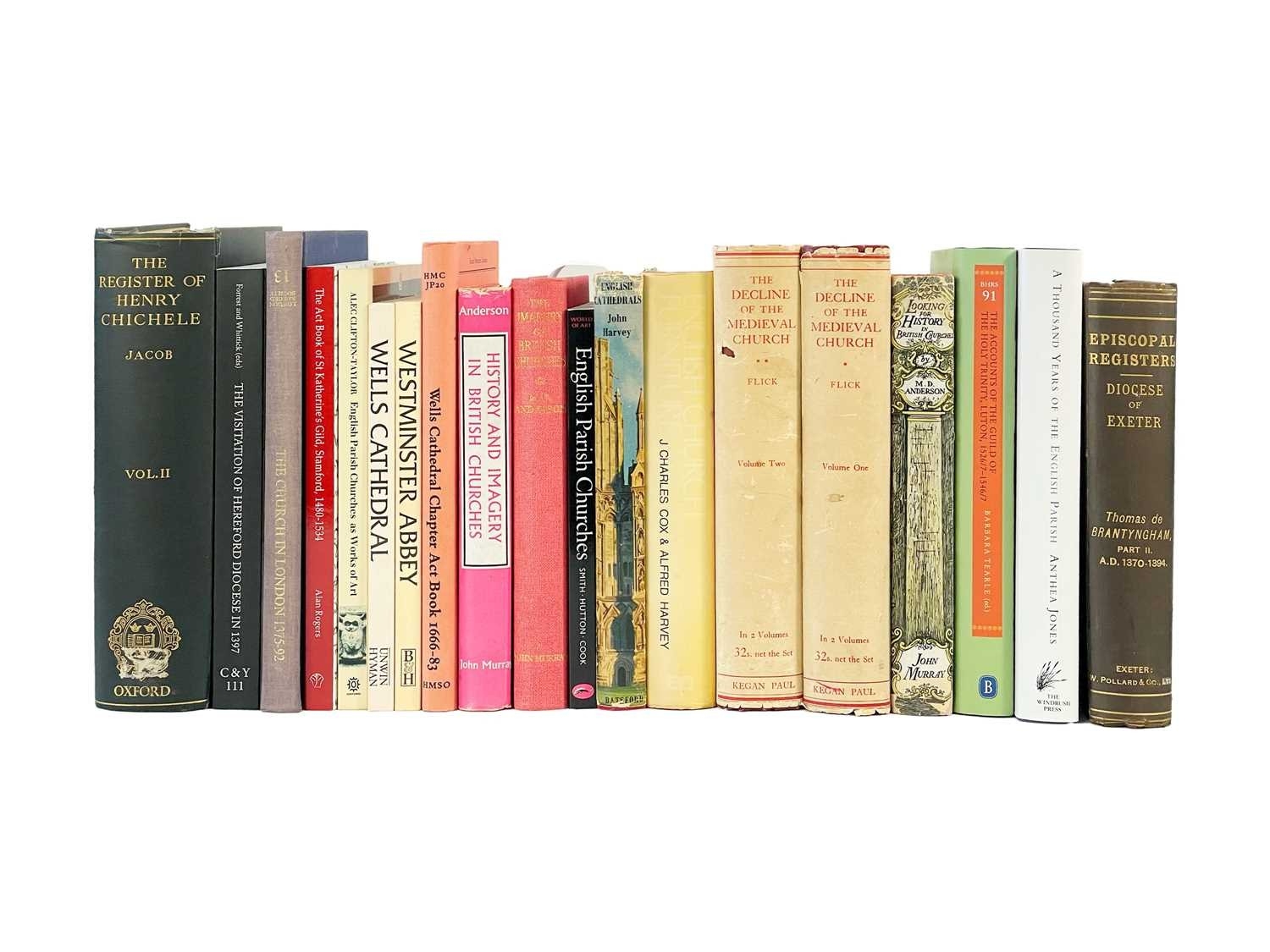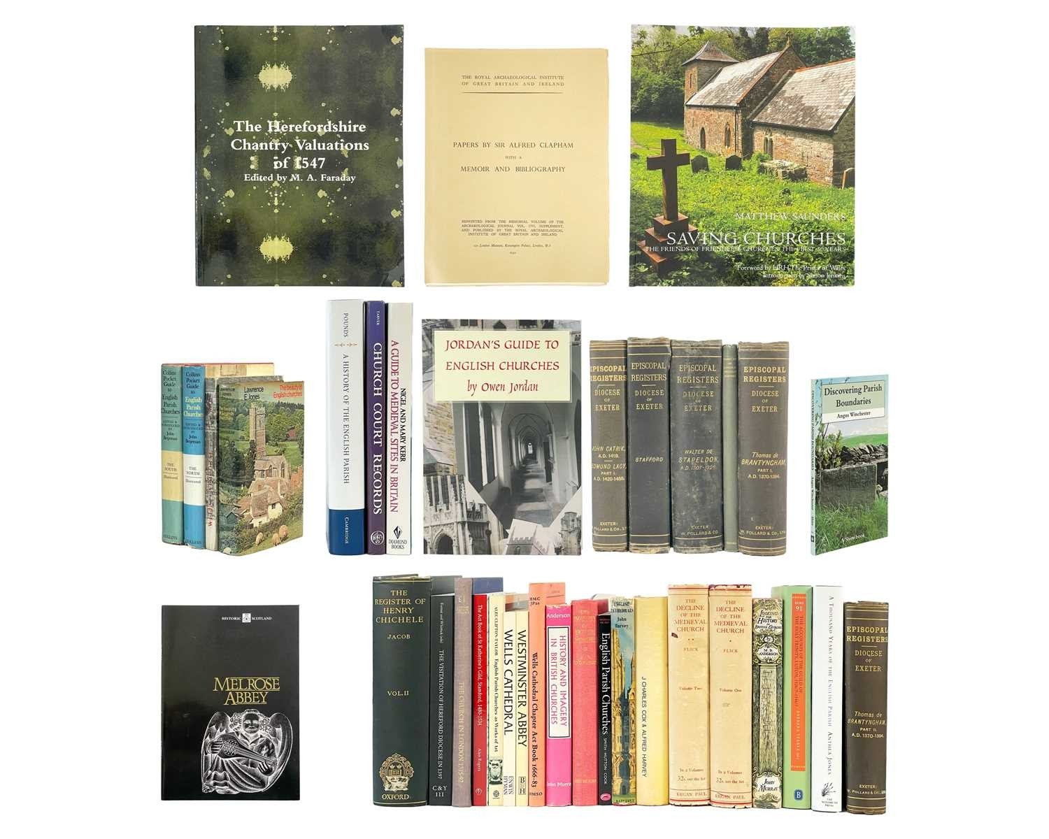 (English Parishes and Churches) Thirty six works Includes a selection of episcopal registers from the Diocese of Exeter; a first edition M. D. Anderson, 'Looking for History in British Churches', John Murray, London 1951; 'Papers by Sir Alfred Clapham with a Memoir and Bibliography', The Royal Archaeological Institute of Great Britain and Ireland, 1952; Barbara Tearle, 'The Accounts of the Guild of the Holy Trinity, Luton', The Bedfordshire Historical Record Society, 2012; together with other works on church furniture, imagery, parishes and cathedrals, all vg. (36)