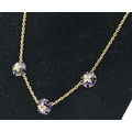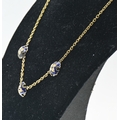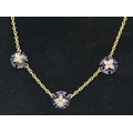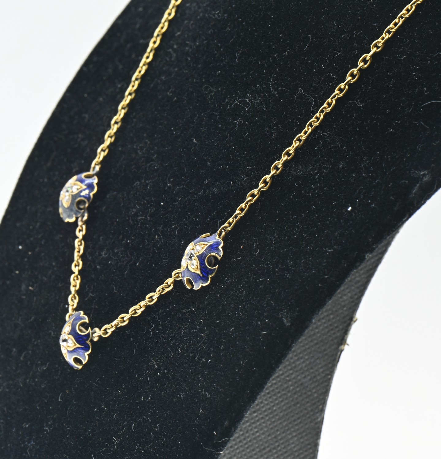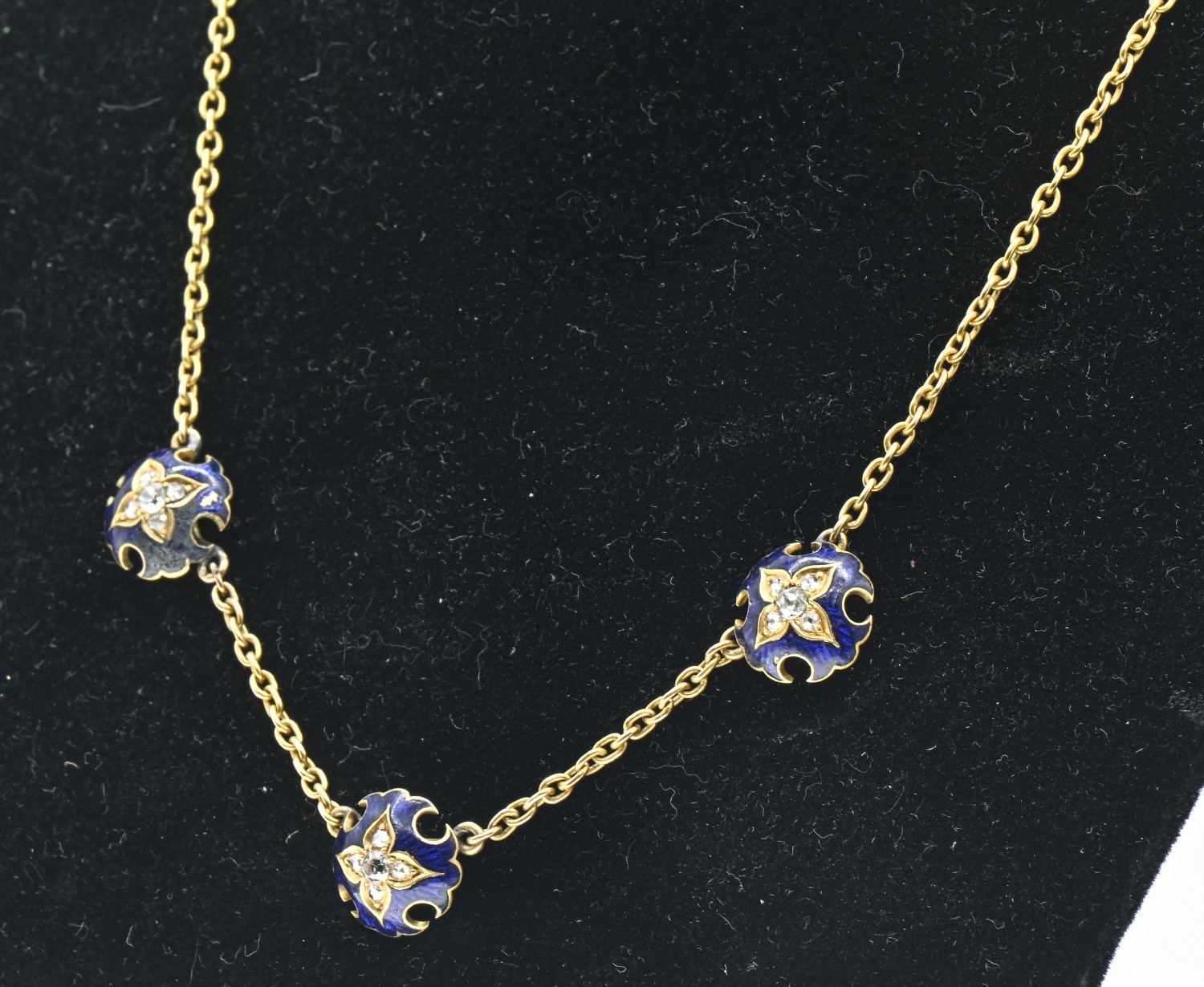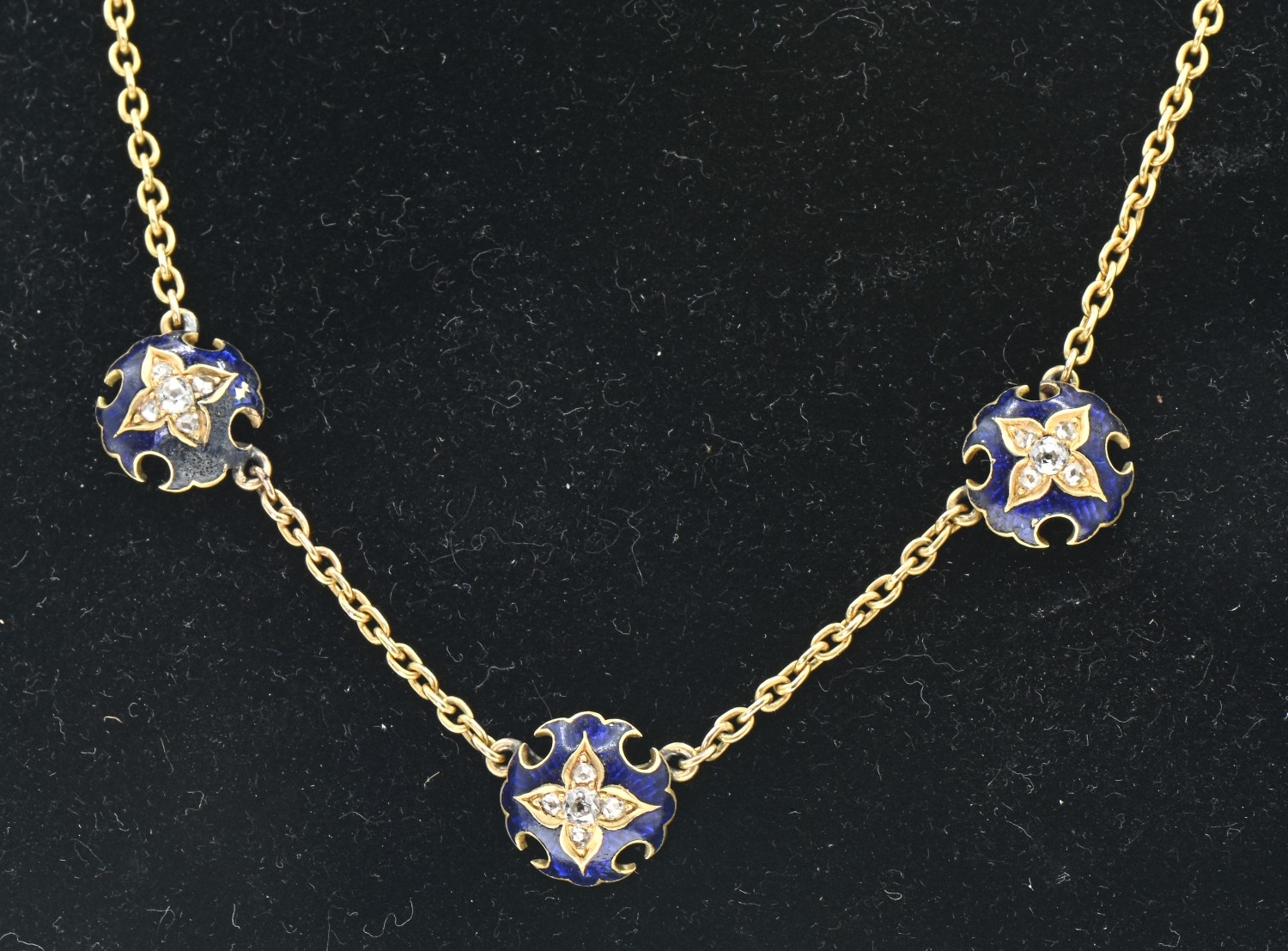Enamel and diamond necklace, designed as a yellow metal chain set to the front with three spaced blue enamel plaques set with old-cut diamonds, tests as 18ct gold, length 435mm, gross weight 8.85 grams