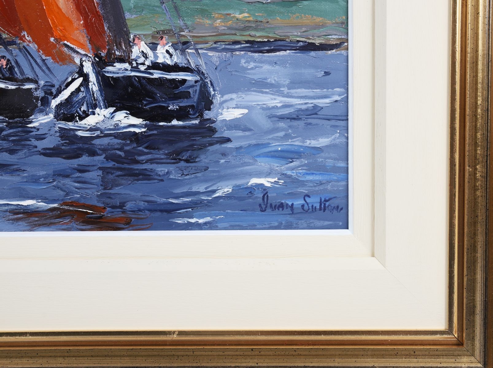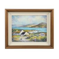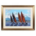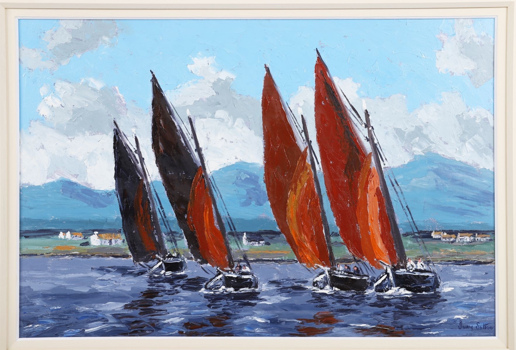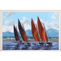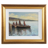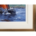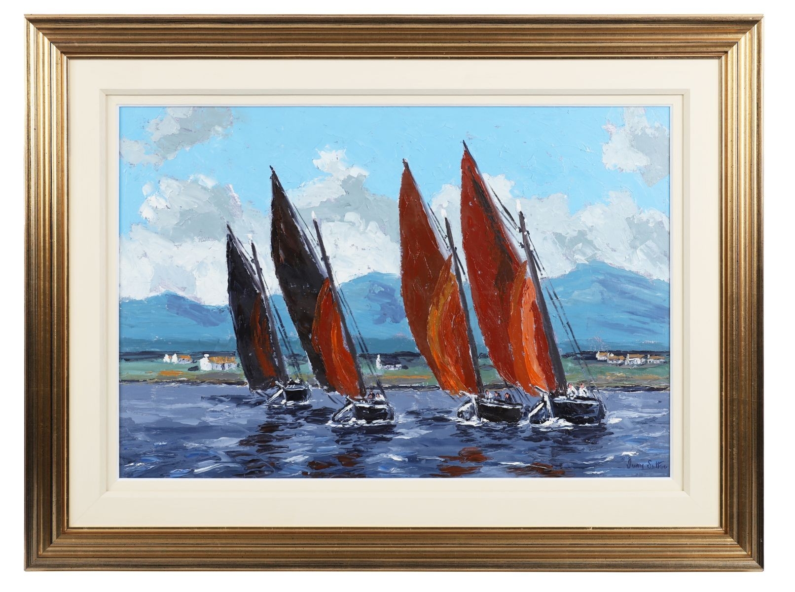 A vibrant marine composition capturing the traditional Galway Hooker fishing boats under full sail off Roundstone Bay, Connemara. Sutton’s confident impasto brushwork and strong use of colour convey both the motion of the vessels and the changing Atlantic light. Signed lower right. Presented in a gilt frame. Image size: 50 x 76 cm.; framed: 76 x 101 cm. PICTURES AND PRINTS Thursday 11th December 2025 18:08:24